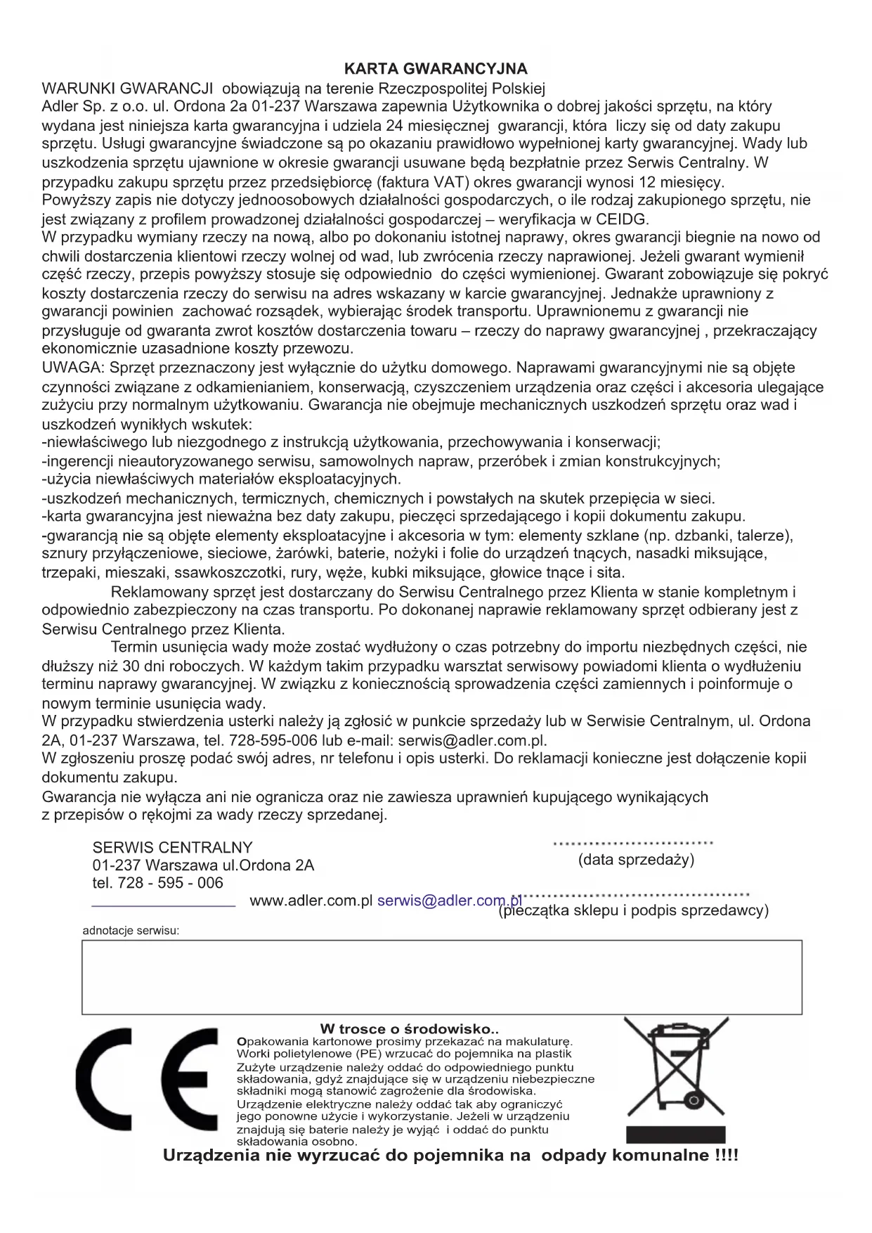 ﺪﯾﺪﮭﺗ تﺎﻧﻮﻜﻤﻟا ﻞﻜﺸﺗ ﺪﻗ زﺎﮭﺠﻟا ﻲﻓ تﺎﯾرﺎﻄﺑ كﺎﻨھ نﺎﻛ اذإ .ﺎﮭﻣاﺪﺨﺘﺳاو ﺎﮭﻣاﺪﺨﺘﺳا ةدﺎﻋإ ،.ﻞﺼﻔﻨﻣ ﻞﻜﺸﺑ ﺔﻧﺰﺨﻤﻟا ﺔﻄﻘﻨﻟا ﻰﻟإ ﺎﮭﺋﺎﻄﻋإو ﺎﮭﺟاﺮﺧإ ﻚﯿﻠﻌﻓKARTA GWARANCYJNA -niewłaściwego lub niezgodnego z instrukcją użytkowania, przechowywania i konserwacji; -karta gwarancyjna jest nieważna bez daty zakupu, pieczęci sprzedającego i kopii dokumentu zakupu. -uszkodzeń mechanicznych, termicznych, chemicznych i powstałych na skutek przepięcia w sieci. -gwarancją nie są objęte elementy eksploatacyjne i akcesoria w tym: elementy szklane (np. dzbanki, talerze), sznury przyłączeniowe, sieciowe, żarówki, baterie, nożyki i folie do urządzeń tnących, nasadki miksujące, trzepaki, mieszaki, ssawkoszczotki, rury, węże, kubki miksujące, głowice tnące i sita. W przypadku wymiany rzeczy na nową, albo po dokonaniu istotnej naprawy, okres gwarancji biegnie na nowo od chwili dostarczenia klientowi rzeczy wolnej od wad, lub zwrócenia rzeczy naprawionej. Jeżeli gwarant wymienił część rzeczy, przepis powyższy stosuje się odpowiednio do części wymienionej. Gwarant zobowiązuje się pokryć koszty dostarczenia rzeczy do serwisu na adres wskazany w karcie gwarancyjnej. Jednakże uprawniony z gwarancji powinien zachować rozsądek, wybierając środek transportu. Uprawnionemu z gwarancji nie przysługuje od gwaranta zwrot kosztów dostarczenia towaru – rzeczy do naprawy gwarancyjnej , przekraczający ekonomicznie uzasadnione koszty przewozu. -ingerencji nieautoryzowanego serwisu, samowolnych napraw, przeróbek i zmian konstrukcyjnych; Termin usunięcia wady może zostać wydłużony o czas potrzebny do importu niezbędnych części, nie dłuższy niż 30 dni roboczych. W każdym takim przypadku warsztat serwisowy powiadomi klienta o wydłużeniu terminu naprawy gwarancyjnej. W związku z koniecznością sprowadzenia części zamiennych i poinformuje o nowym terminie usunięcia wady. WARUNKI GWARANCJI obowiązują na terenie Rzeczpospolitej Polskiej Adler Sp. z o.o. ul. Ordona 2a 01-237 Warszawa zapewnia Użytkownika o dobrej jakości sprzętu, na który wydana jest niniejsza karta gwarancyjna i udziela 24 miesięcznej gwarancji, która liczy się od daty zakupu sprzętu. Usługi gwarancyjne świadczone są po okazaniu prawidłowo wypełnionej karty gwarancyjnej. Wady lub uszkodzenia sprzętu ujawnione w okresie gwarancji usuwane będą bezpłatnie przez Serwis Centralny. W przypadku zakupu sprzętu przez przedsiębiorcę (faktura VAT) okres gwarancji wynosi 12 miesięcy. -użycia niewłaściwych materiałów eksploatacyjnych. W zgłoszeniu proszę podać swój adres, nr telefonu i opis usterki. Do reklamacji konieczne jest dołączenie kopii dokumentu zakupu. Gwarancja nie wyłącza ani nie ogranicza oraz nie zawiesza uprawnień kupującego wynikających z przepisów o rękojmi za wady rzeczy sprzedanej. Reklamowany sprzęt jest dostarczany do Serwisu Centralnego przez Klienta w stanie kompletnym i odpowiednio zabezpieczony na czas transportu. Po dokonanej naprawie reklamowany sprzęt odbierany jest z Serwisu Centralnego przez Klienta. Powyższy zapis nie dotyczy jednoosobowych działalności gospodarczych, o ile rodzaj zakupionego sprzętu, nie jest związany z profilem prowadzonej działalności gospodarczej – weryfikacja w CEIDG. UWAGA: Sprzęt przeznaczony jest wyłącznie do użytku domowego. Naprawami gwarancyjnymi nie są objęte czynności związane z odkamienianiem, konserwacją, czyszczeniem urządzenia oraz części i akcesoria ulegające zużyciu przy normalnym użytkowaniu. Gwarancja nie obejmuje mechanicznych uszkodzeń sprzętu oraz wad i uszkodzeń wynikłych wskutek: W przypadku stwierdzenia usterki należy ją zgłosić w punkcie sprzedaży lub w Serwisie Centralnym, ul. Ordona 2A, 01-237 Warszawa, tel. 728-595-006 lub e-mail: serwis@adler.com.pl. SERWIS CENTRALNY 01-237 Warszawa ul.Ordona 2A tel. 728 - 595 - 006 www.adler.com.pl serwis@adler.com.pl (data sprzedaży) (pieczątka sklepu i podpis sprzedawcy) adnotacje serwisu: Urządzenia nie wyrzucać do pojemnika na odpady komunalne !!!! W trosce o środowisko.. Opakowania kartonowe prosimy przekazać na makulaturę.Worki polietylenowe (PE) wrzucać do pojemnika na plastikZużyte urządzenie należy oddać do odpowiedniego punktu składowania, gdyż znajdujące się w urządzeniu niebezpieczne składniki mogą stanowić zagrożenie dla środowiska. Urządzenie elektryczne należy oddać tak aby ograniczyćjego ponowne użycie i wykorzystanie. Jeżeli w urządzeniuznajdują się baterie należy je wyjąć i oddać do punktu składowania osobno.POLSKI