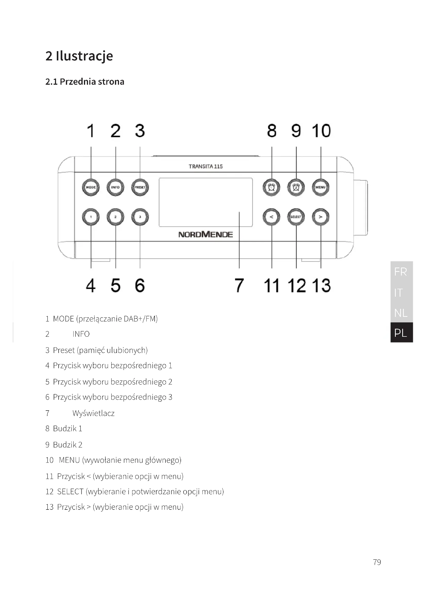 1 MODE (przełączanie DAB+/FM) 2 INFO 3 Preset (pamięć ulubionych) 4 Przycisk wyboru bezpośredniego 1 5 Przycisk wyboru bezpośredniego 2 6 Przycisk wyboru bezpośredniego 3 7 Wyświetlacz 8 Budzik 1 9 Budzik 2 10 MENU (wywołanie menu głównego) 11 Przycisk < (wybieranie opcji w menu) 12 SELECT (wybieranie i potwierdzanie opcji menu) 13 Przycisk > (wybieranie opcji w menu)80