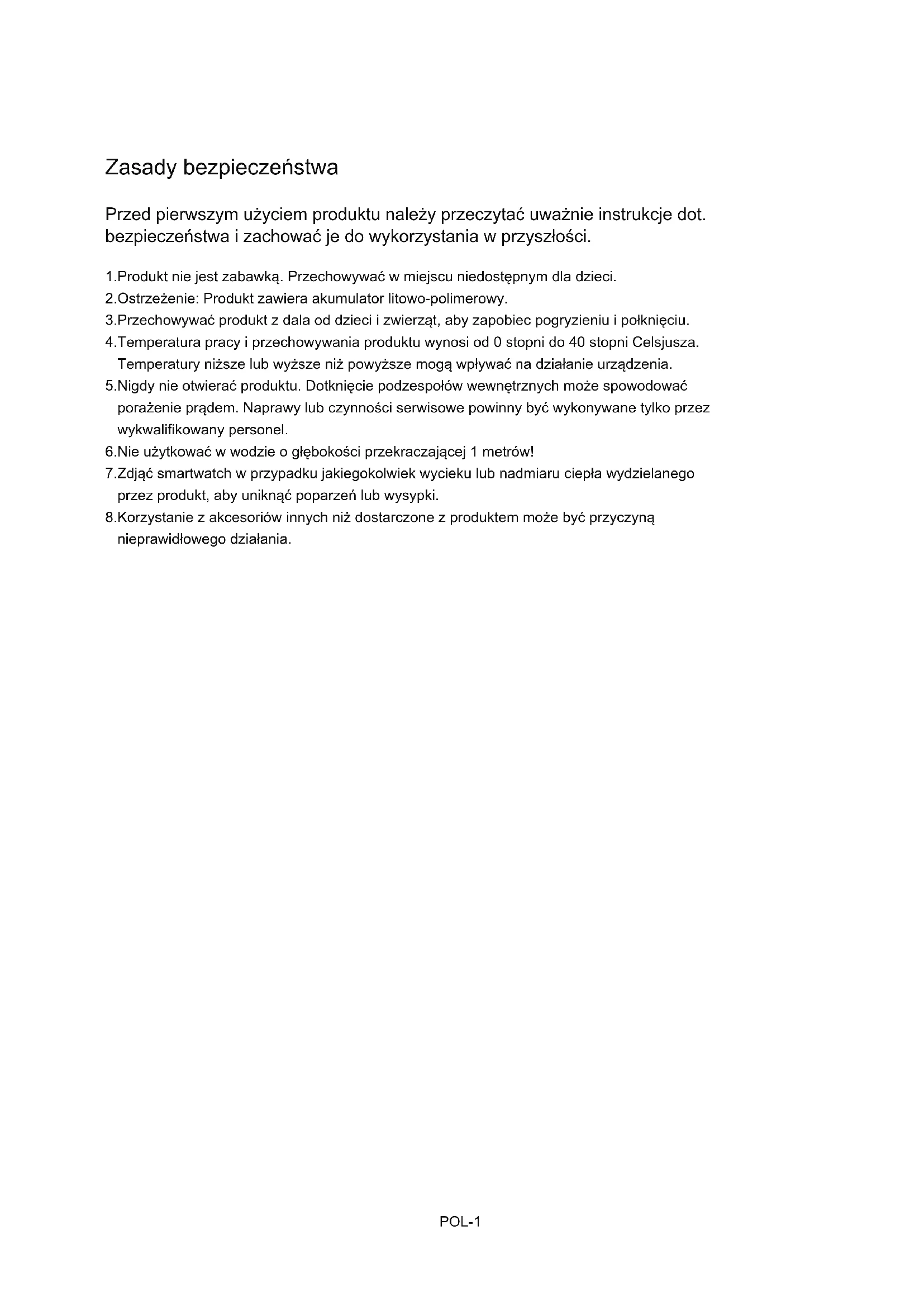 POL-3 Po połączeniu opaski z telefonem opaska zsynchronizuje datę i czas z telefonem. Aplikacja zsynchronizuje również dane sportowe, dane monitorowania pulsu, ciśnienie krwi itp. z opaski. Krótkie naciśnięcie przycisku dotykowego bransoletki zmienia funkcję, a długie naciśnięcie przycisku dotykowego uruchamia funkcję. Aby wyłączyć zegarek, należy wejść do menu „WYŁĄCZ” i przytrzymać przycisk dotykowy przez 3 sekundy. Aby włączyć zegarek, należy nacisnąć i przytrzymać przycisk dotykowy przez 3 sekundy.Ćwiczenia: zliczanie czasu dziennej aktywności fizycznej. O godzinie 00:00 dane na opasce są kasowane. Historia dostępna jest w aplikacji. Monitor tętna: automatyczny pomiar tętna, gdy funkcja jest włączona. Dane odczytów pulsu zapisywane są w aplikacji. Pomiar SpO
