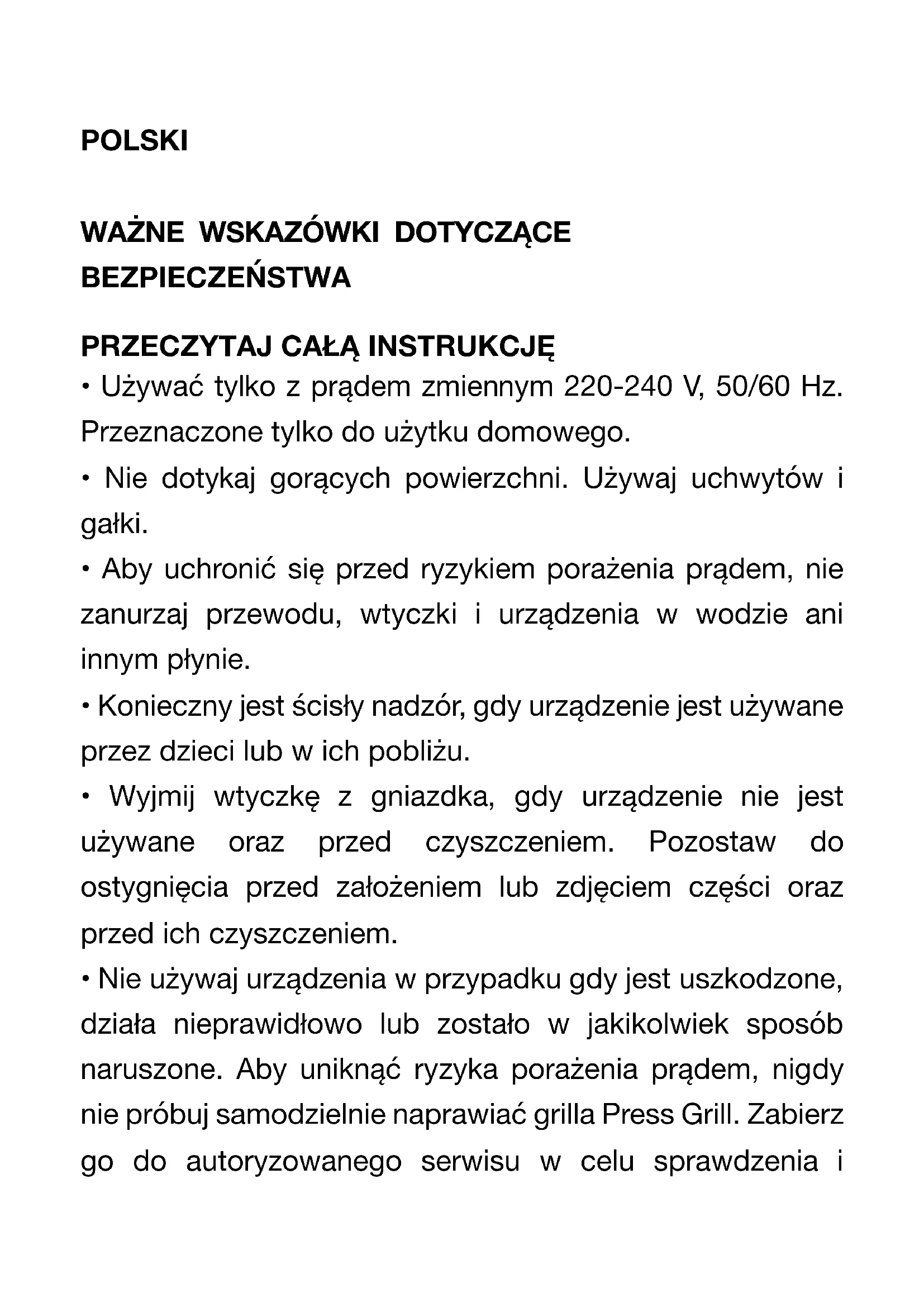 - Nie używaj urządzenia w przypadku gdy jest uszkodzone, działa nieprawidłowo lub zostało w jakikolwiek sposób naruszone. Aby uniknąć ryzyka porażenia prądem, nigdy nie próbuj samodzielnie naprawiać grilla Press Grill. Zabierz go do autoryzowanego serwisu w celu sprawdzenia inaprawy. Nieprawidłowy ponowny montaż może stwarzać ryzyko porażenia prądem podczas korzystania z urządzenia.