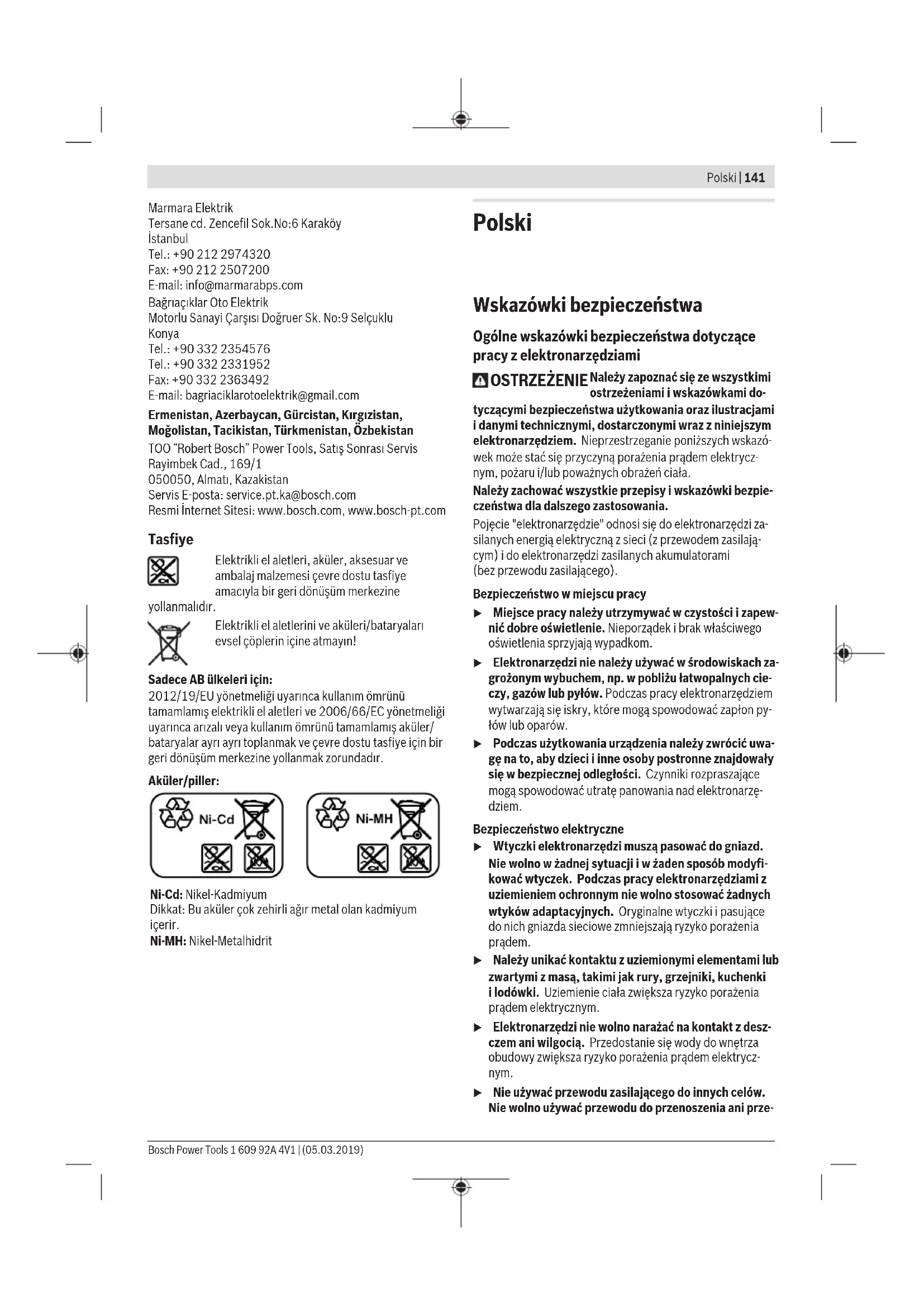 22CF | 23 | 29CF | 30 İşaretleme halkasını (17) ince bir tornavida ucu, bir raspa veya benzeri bir gereçle bastırarak çıkarın. Bilyeli yatak yuvasını (33) bir pense yardımıyla arkaya doğru gövde çanağına itin. LED tutucunun (16) LED projektörünü (18) kapatan iki yarısını istediğiniz pozisyona getirebilirsiniz. LED projektördeki kabloya hasar vermemeye dikkat edin ve kabloyu kırmadan gövde içindeki boşluğa (34) itin. LED projektörü (18) tekrar LED tutucunun (16) iki gövde parçası ile kapatın. Bilyeli yatak yuvasını (33) ve işaretleme halkasını (17) tekrar eski konumuna getirin. Bakım ve servis Bakım ve temizlik u Elektrikli el aletinde bir çalışma yapmadan önce (örneğin bakım, uç değiştirme vb.), aleti taşırken ve saklarken her defasında aküyü elektrikli el aletinden çıkarın.Aletin açma/kapama şalterine yanlışlıkla basıldığında yaralanmalar ortaya çıkabilir. u İyi ve güvenli çalışabilmek için elektrikli el aletini ve havalandırma aralıklarını temiz tutun. Elektrikli el aletinin yağlanması Yağlama maddesi: Özel dişli yağı (225 ml) Malzeme numarası 3 605 430 009 Molykote gres Motor yağı SAE 10/SAE 20 Bosch Power Tools 1 609 92A 4V1 | (05.03.2019)140 | Türkçe – İlk 150 çalışma saatinden sonra dişliyi yumuşak bir çözücü ile temizleyin. Kullanım ve imha etme sırasında çözücü madde üreticisinin uyarılarına dikkat edin. Ardından dişliyi Bosch özel dişli gresi ile yağlayın. İlk temizlik işleminden sonraki her 300 çalışma saatinde bir bu temizleme işlemini tekrarlayın. – Ayırma kavramasının hareketli parçalarını, 100000 vidalama sonrasında birkaç damla motor yağı SAE 10/ SAE 20 ile yağlayın. Kayar ve döner parçaları ise Molykote gres ile yağlayın. Bu sırada debriyajda aşınma olup olmadığını kontrol edin. Bu sayede çalışma sırasındaki tekrarlanabilirliği ve hassasiyeti güvence altına alırsınız. Daha sonra kavramanın torku tekrar ayarlanmalıdır. u Bakım ve onarım çalışmalarının sadece nitelikli uzman personel tarafından yapmasını sağlayın. Bu sayede, elektrikli el aletinin güvenli şekilde kalmasını sağlarsınız. Yetkili bir Bosch müşteri hizmetleri departmanı bu çalışmaları hızlı ve güvenilir biçimde yapar. u Yağlama ve temizlik maddelerini çevreye uygun bir şekilde imha edin. Yasal talimatlara dikkat edin. Müşteri servisi ve uygulama danışmanlığı Müşteri servisleri ürününüzün onarım ve bakımı ile yedek parçalarına ait sorularınızı yanıtlandırır. Demonte görünüşleri ve yedek parçalara ait bilgileri şu sayfada da bulabilirsiniz: www.bosch-pt.com Bosch uygulama danışma ekibi ürünlerimiz ve aksesuarları hakkındaki sorularınızda sizlere memnuniyetle yardımcı olur. Bütün başvuru ve yedek parça siparişlerinizde ürünün tip etiketi üzerindeki 10 haneli ürün kodunu mutlaka belirtin. Sadece Türkiye için geçerlidir: Bosch genel olarak yedek parçaları 7 yıl hazır tutar. Türkçe Bosch Sanayi ve Ticaret A.Ş. Elektrikli El Aletleri Aydınevler Mah. İnönü Cad. No: 20 Küçükyalı Ofis Park A Blok 34854 Maltepe-İstanbul Tel.: 444 80 10 Fax: +90 216 432 00 82 E-mail: iletisim@bosch.com.tr www.bosch.com.tr Bulsan Elektrik İstanbul Cad. Devrez Sok. İstanbul Çarşısı No: 48/29 İskitler Ankara Tel.: +90 312 3415142 Tel.: +90 312 3410302 Fax: +90 312 3410203 E-mail: bulsanbobinaj@gmail.com Faz Makine Bobinaj Cumhuriyet Mah. Sanayi Sitesi Motor İşleri Bölümü 663 Sk. No:18 Antalya Tel.: +90 242 3465876 Tel.: +90 242 3462885 Fax: +90 242 3341980 E-mail: info@fazmakina.com.tr Körfez Elektrik Karaağaç Mah. Sümerbank Cad. No:18/2 Erzincan Tel.: +90 446 2230959 Fax: +90 446 2240132 E-mail: bilgi@korfezelektrik.com.tr Değer İş Bobinaj İsmetpaşa Mah. İlk Belediye Başkan Cad. 5/C Şahinbey/Gaziantep Tel.: +90 342 2316432 Fax: +90 342 2305871 E-mail: degerisbobinaj@hotmail.com Tek Çözüm Bobinaj Küsget San.Sit.A Blok 11Nolu Cd.No:49/A Şehitkamil/Gaziantep Tel.: +90 342 2351507 Fax: +90 342 2351508 E-mail: cozumbobinaj2@hotmail.com Günşah Otomotiv Beylikdüzü Sanayi Sit. No: 210 Beylikdüzü İstanbul Tel.: +90 212 8720066 Fax: +90 212 8724111 E-mail: gunsahelektrik@ttmail.com Aygem 10021 Sok. No: 11 AOSB Çiğli İzmir Tel.: +90232 3768074 Fax: +90 232 3768075 E-mail: boschservis@aygem.com.tr Sezmen Bobinaj Ege İş Merkezi 1201/4 Sok. No: 4/B Yenişehir İzmir Tel.: +90 232 4571465 Tel.: +90 232 4584480 Fax: +90 232 4573719 E-mail: info@sezmenbobinaj.com.tr Ankaralı Elektrik Eski Sanayi Bölgesi 3. Cad. No: 43 Kocasinan Kayseri Tel.: +90 352 3364216 Tel.: +90 352 3206241 Fax: +90 352 3206242 E-mail: gunay@ankarali.com.tr Asal Bobinaj Eski Sanayi Sitesi Barbaros Cad. No: 24/C Samsun Tel.: +90 362 2289090 Fax: +90 362 2289090 E-mail: bpsasalbobinaj@hotmail.com Üstündağ Elektrikli Aletler Nusretiye Mah. Boyacılar Aralığı No: 9 Tekirdağ Tel.: +90 282 6512884 Fax: +90 282 6521966 E-mail: info@ustundagsogutma.com 1 609 92A 4V1 | (05.03.2019) Bosch Power ToolsPolski | 141 Marmara Elektrik Tersane cd. Zencefil Sok.No:6 Karaköy İstanbul Tel.: +90 212 2974320 Fax: +90 212 2507200 E-mail: info@marmarabps.com Bağrıaçıklar Oto Elektrik Motorlu Sanayi Çarşısı Doğruer Sk. No:9 Selçuklu Konya Tel.: +90 332 2354576 Tel.: +90 332 2331952 Fax: +90 332 2363492 E-mail: bagriaciklarotoelektrik@gmail.com Ermenistan, Azerbaycan, Gürcistan, Kırgızistan, Moğolistan, Tacikistan, Türkmenistan, Özbekistan TOO “Robert Bosch” Power Tools, Satış Sonrası Servis Rayimbek Cad., 169/1 050050, Almatı, Kazakistan Servis E-posta: service.pt.ka@bosch.com Resmi İnternet Sitesi: www.bosch.com, www.bosch-pt.com Tasfiye Elektrikli el aletleri, aküler, aksesuar ve ambalaj malzemesi çevre dostu tasfiye amacıyla bir geri dönüşüm merkezine yollanmalıdır. Elektrikli el aletlerini ve aküleri/bataryaları evsel çöplerin içine atmayın! Sadece