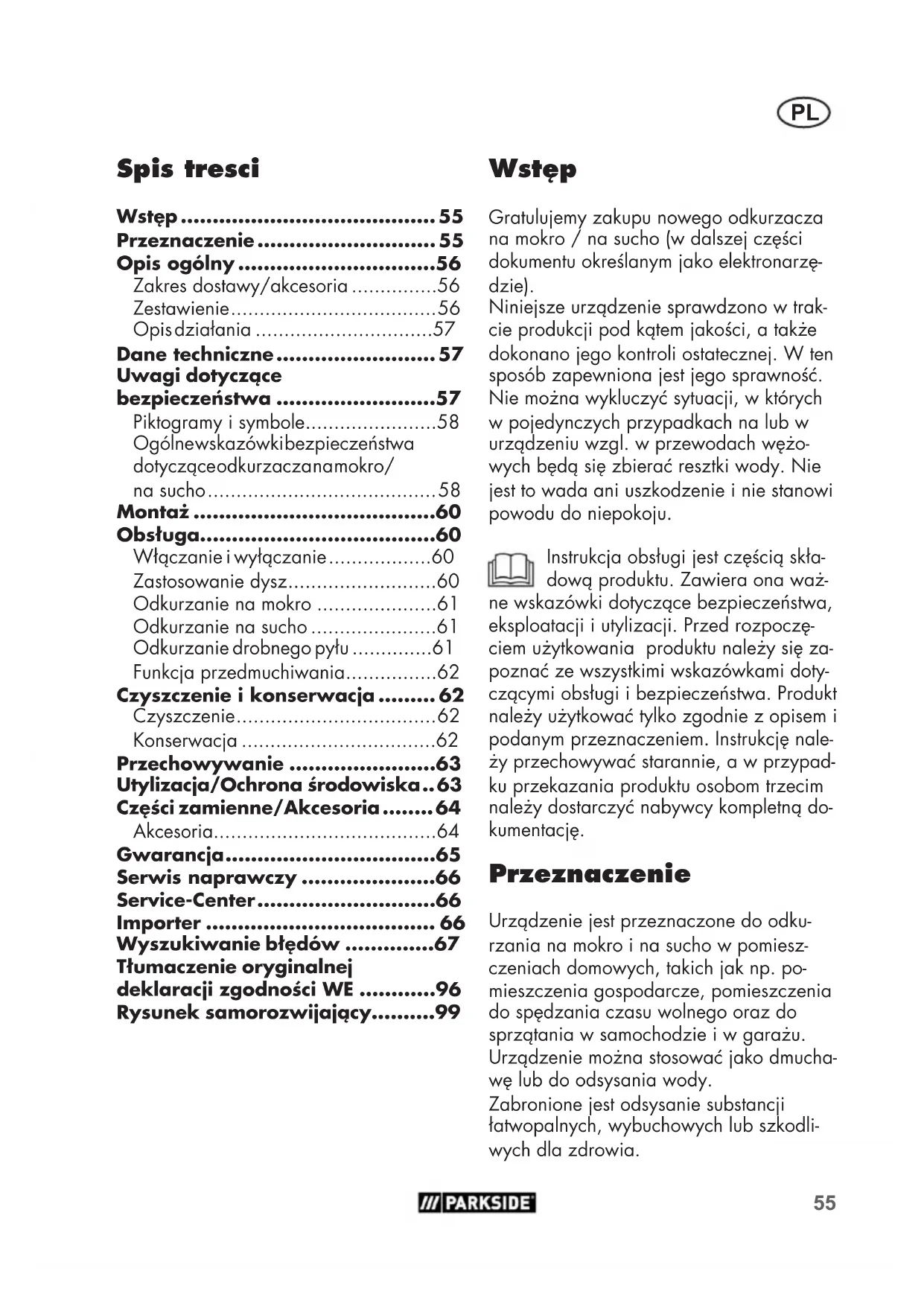 - Rysunek samorozwijający Wstęp Gratulujemy zakupu nowego odkurzacza na mokro / na sucho (w dalszej części dokumentu określanym jako elektronarzę- dzie). Niniejsze urządzenie sprawdzono w trak- cie produkcji pod kątem jakości, a także dokonano jego kontroli ostatecznej. W ten sposób zapewniona jest jego sprawność. Nie można wykluczyć sytuacji, w których w pojedynczych przypadkach na lub w urządzeniu wzgl. w przewodach wężo- wych będą się zbierać resztki wody. Nie jest to wada ani uszkodzenie i nie stanowi powodu do niepokoju. Instrukcja obsługi jest częścią skła- dową produktu. Zawiera ona waż- ne wskazówki dotyczące bezpieczeństwa, eksploatacji i utylizacji. Przed rozpoczę- ciem użytkowania produktu należy się za- poznać ze wszystkimi wskazówkami doty- czącymi obsługi i bezpieczeństwa. Produkt należy użytkować tylko zgodnie z opisem i podanym przeznaczeniem. Instrukcję nale- ży przechowywać starannie, a w przypad- ku przekazania produktu osobom trzecim należy dostarczyć nabywcy kompletną do- kumentację. Przeznaczenie Urządzenie jest przeznaczone do odku- rzania na mokro i na sucho w pomiesz- czeniach domowych, takich jak np. po- mieszczenia gospodarcze, pomieszczenia do spędzania czasu wolnego oraz do sprzątania w samochodzie i w garażu. Urządzenie można stosować jako dmucha- wę lub do odsysania wody. Zabronione jest odsysanie substancji łatwopalnych, wybuchowych lub szkodli- wych dla zdrowia.PL p. 99