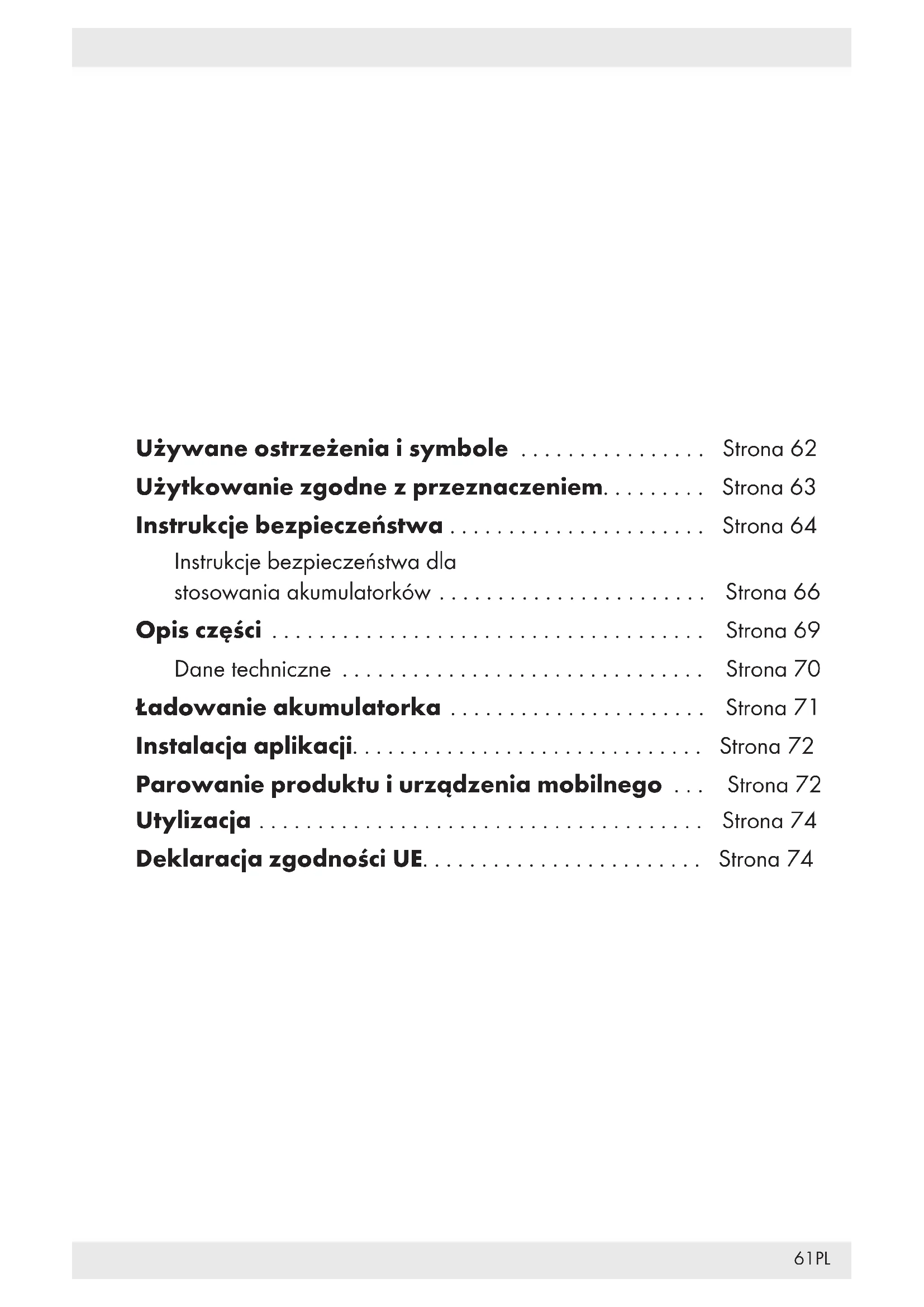 Używane ostrzeżenia i symbole W tej instrukcji stosowane są poniższe ostrzeżenia i symbole: NIEBEZPIECZEŃSTWO! Ten symbol ze słowem „NIEBEZPIECZEŃSTWO” wskazuje na zagrożenie o wysokim stopniu ryzyka, które, jeśli się go nie uniknie, spowoduje śmierć lub poważne obrażenia. OSTRZEŻENIE! Ten symbol ze słowem „OSTRZEŻENIE” wskazuje na zagrożenie o średnim stopniu ryzyka, które, jeśli się go nie uniknie, spowoduje poważne obrażenia. OSTROŻNIE! Ten symbol ze słowem „OSTROŻNIE” wskazuje na zagrożenie o niskim stopniu ryzyka, które, jeśli się go nie uniknie, spowoduje małe lub umiarkowane obrażenia. UWAGA! Ten symbol ze słowem ostrzegawczym „UWAGA” wskazuje na możliwość uszkodzenia mienia. RADA: Ten symbol ze słowem „RADA” zawiera dalsze użyteczne informacje.63PL OSTRZEŻENIE! ZAGROŻENIE WYBUCHEM! Ostrzeżenie oznaczone tym znakiem oraz słowami „OSTRZEŻENIE! ZAGROŻENIE WYBUCHEM!” wskazuje na możliwe ryzyko wybuchu. Nieprzestrzeganie tego ostrzeżenia może spowodować poważne obrażenia lub śmierć i możliwe uszkodzenie mienia. Postępować zgodnie z instrukcjami zawartymi w tym ostrzeżeniu, aby zapobiec poważnym obrażeniom, śmierci lub uszkodzeniom mienia! Ten znak wskazuje na obowiązek noszenia odpowiednich rękawic ochronnych! Postępować zgodnie z instrukcjami zawartymi w tym ostrzeżeniu, aby uniknąć obrażeń rąk spowodowanych przez przedmioty lub kontakt z gorącymi materiałami lub chemikaliami. Ten symbol oznacza, że przed użyciem produktu należy zapoznać się z instrukcją obsługi. Użytkowanie zgodne z przeznaczeniem Ten produkt należy do kategorii elektroniki informacyjnej. Po podłączeniu produktu do urządzenia mobilnego można korzystać ze wszystkich jego funkcji. Produkt rejestruje kroki, kilometry, spalone kalorie, czas trwania aktywności i długość snu. Produkt nadaje się do użytku z następującymi systemami: iOS od wersji8.0, Android™ w wersji6.0 lub wyższej, Bluetooth V4.2. Produkt przeznaczony jest wyłącznie do użytku prywatnego, wykorzystanie komercyjne jest niedozwolone.64 PL Instrukcje bezpieczeństwa PRZED ROZPOCZĘCIEM UŻYWANIA PRODUKTU ZAPOZNAĆ SIĘ ZE WSZYSTKIMI INSTRUKCJAMI O BEZPIECZEŃSTWIE ORAZ Z INSTRUKCJĄ OBSŁUGI! PRZEKAZUJĄC PRODUKT INNYM OSOBOM, NALEŻY DOŁĄCZYĆ WSZYSTKIE DOKUMENTY! Uszkodzenia powstałe w wyniku nieprzestrzegania niniejszej instrukcji obsługi nie są objęte gwarancją! Nie ponosimy żadnej odpowiedzialności w przypadku wystąpienia szkód wtórnych! Nie bierzemy odpowiedzialności za uszkodzenia mienia lub obrażenia ciała, powstałe w wyniku niewłaściwego użytkowania lub nieprzestrzegania instrukcji bezpieczeństwa! Przed każdym użyciem: Sprawdzać produkt pod kątem uszkodzeń. Nie używać uszkodzonego produktu. Niniejsze urządzenie może być używane przez dzieci od lat 8oraz przez osoby z obniżonymi zdolnościami fizycznymi, sensorycznymi lub mentalnymi lub brakiem doświadczenia i/lub wiedzy, jeśli pozostają pod nadzorem lub zostały pouczone w kwestii bezpiecznego użycia urządzenia i rozumieją zagrożenia wynikające z jego stosowania. Dzieci nie mogą bawić się produktem. Czyszczenie i konserwacja przez użytkownika nie mogą być przeprowadzane przez dzieci pozostawione bez nadzoru.65PL m NIEBEZPIECZEŃSTWO! Niebezpieczeństwo uduszenia! Nie zostawiać dzieci bez nadzoru w pobliżu materiałów pakunkowych. Materiały pakunkowe grożą zadławieniem. Dzieci często nie są w stanie ocenić związanych z tym niebezpieczeństw. Zawsze trzymać dzieci z dala od materiałów pakunkowych. Materiały opakunkowe nie są zabawką. Nigdy nie otwierać produktu. Niewłaściwe naprawy mogą prowadzić do znacznego zagrożenia dla użytkownika. Naprawy należy zawsze zlecać odpowiedniemu fachowcowi. Nie należy obsługiwać produktu podczas prowadzenia pojazdu. Oderwanie wzroku od drogi i rozproszenie uwagi jest niebezpieczne. Produkt nie nadaje się do użytku medycznego. Produkt pomaga obliczyć przebytą odległość i spalone kalorie podczas ćwiczeń. Przed rozpoczęciem regularnych ćwiczeń należy skonsultować się z lekarzem. Chronić produkt przed silnymi uderzeniami, wibracjami, bezpośrednim nasłonecznieniem i brudem. Gwarancja nie obejmuje uszkodzeń spowodowanych niewłaściwą obsługą, nieprzestrzeganiem instrukcji obsługi lub manipulowaniem produktem przez osoby nieupoważnione. Nie wkładać żadnych przedmiotów do produktu i trzymać ostre przedmioty z dala od produktu. Jeśli użytkownik ma wszczepiony rozrusznik serca lub defibrylator, przed pierwszym użyciem produktu musi skontaktować się z lekarzem.66 PL Nie stawiać ciężkich przedmiotów na produkcie. Nie wywierać nacisku na produkt. Unikać silnych pól magnetycznych (np. tworzonych przez głośniki). Nieprzestrzeganie tej instrukcji może spowodować niedokładne pomiary. Woda słona i termalna mogą prowadzić do korozji części metalowych. Przed wizytą w saunie należy zdjąć produkt, ponieważ różnica temperatur może powodować kondensację. Ryzyko uszkodzenia produktu. Instrukcje bezpieczeństwa dla stosowania akumulatorków m NIEBEZPIECZEŃSTWO! Akumulatorki należy trzymać poza zasięgiem dzieci. W razie połknięcia należy niezwłocznie poszukać pomocy lekarza! m ZAGROŻENIE WYBUCHEM! Użytkownik nie może wyjmować ani wymieniać wbudowanego akumulatorka. Nie zwierać akumulatorków ani ich nie otwierać. Może to spowodować przegrzanie, pożar lub pęknięcie. Nigdy nie wrzucać produktu z wbudowanym akumulatorkiem do ognia lub wody. Produktu z wbudowanym akumulatorkiem nie wolno narażać na obciążenia mechaniczne. Ryzyko wycieku z akumulatorków Unikać ekstremalnych warunków otoczenia oraz temperatur, które mogłyby mieć wpływ na produkt z wbudowanym akumulatorkiem, np. wytwarzanych przez grzejniki lub bezpośrednie światło słoneczne.67PL Nie dopuszczać do kontaktu wyciekających substancji chemiczn