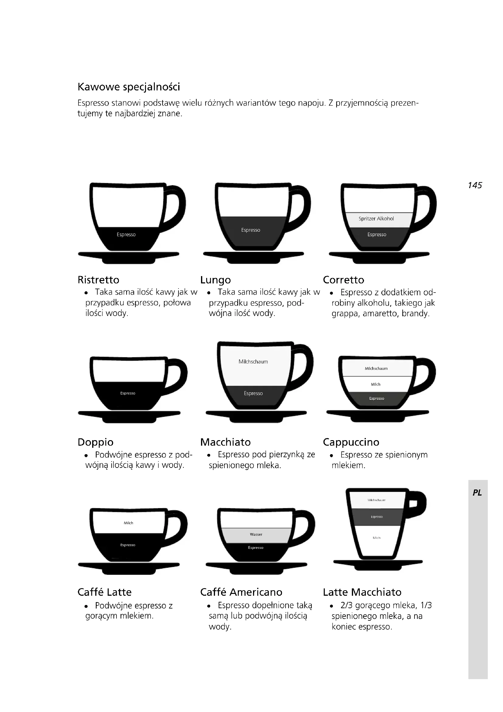 Espresso Espresso Spritzer AlkoholEspresso Kawowe specjalności Espresso stanowi podstawę wielu różnych wariantów tego napoju. Z przyjemnością prezen- tujemy te najbardziej znane. Ristretto ● Taka sama ilość kawy jak w przypadku espresso, połowa ilości wody. Lungo ● Taka sama ilość kawy jak w przypadku espresso, pod- wójna ilość wody. Corretto ● Espresso z dodatkiem od- robiny alkoholu, takiego jak grappa, amaretto, brandy. Espresso Milchschaum Espresso MilchEspressoMilchschaum Doppio ● Podwójne espresso z pod- wójną ilością kawy i wody. Macchiato ● Espresso pod pierzynką ze spienionego mleka. Cappuccino ● Espresso ze spienionym mlekiem. EspressoMilchEspressoWasser Espresso Milch Milchschaum Caffé Latte ● Podwójne espresso z gorącym mlekiem. Caffé Americano ● Espresso dopełnione taką samą lub podwójną ilością wody. Latte Macchiato ● 2/3 gorącego mleka, 1/3 spienionego mleka, a na koniec espresso.146 Opis urządzenia Płyta grzewcza (pasywna) Wyświetlacz LCD Pokrętło Dysza spieniająca mleko Kolba Pokrywka (zbiornik na wodę znajduje się poniżej) Manometr Pokrętło Dysza gorącej wody Bedienhebel Dźwignia Głowica zaparzająca Kratka ociekowa Zakres dostawy Ślepe sitko Tamper Dzbanek do Kolba Kolba Wkład ltra antywapiennego Sitko pojedyncze na 1 liżanki Sitko pojedyncze na 2 liżanki Narzędzie do czyszczenia Tacka ociekowaPL