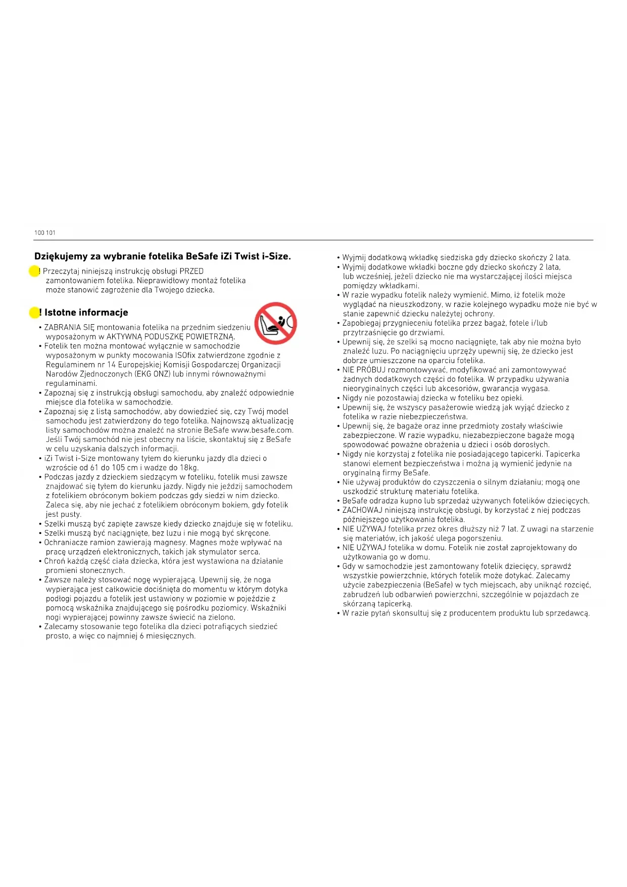 - W razie pytań skonsultuj się z producentem produktu lub sprzedawcą. ! Przeczytaj niniejszą instrukcję obsługi PRZED zamontowaniem fotelika. Nieprawidłowy montaż fotelika może stanowić zagrożenie dla Twojego dziecka. Dziękujemy za wybranie fotelika BeSafe iZi Twist i-Size.102 103
