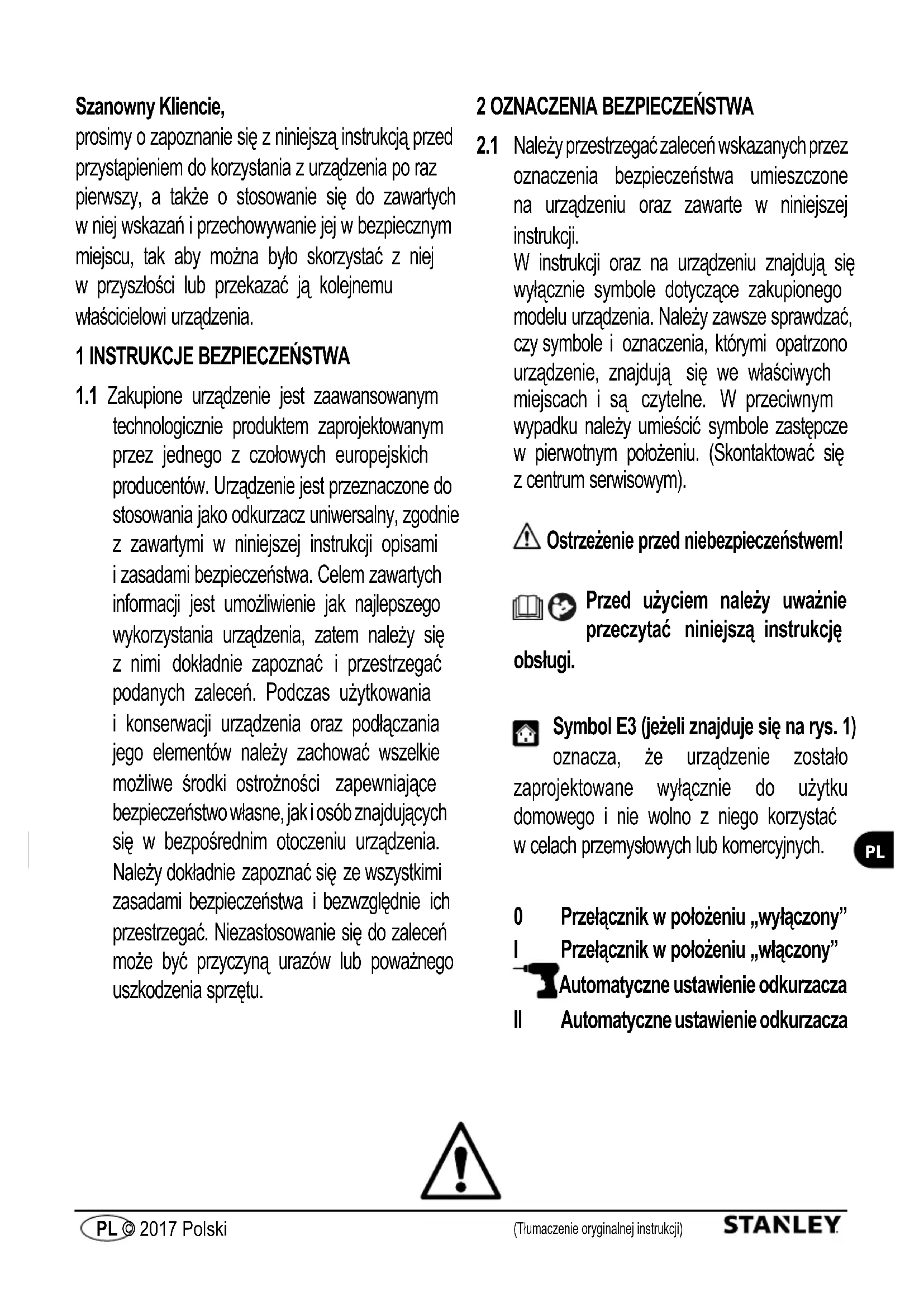oznaczenia bezpieczeństwa umieszczone na urządzeniu oraz zawarte w niniejszej instrukcji. W instrukcji oraz na urządzeniu znajdują się wyłącznie symbole dotyczące zakupionego modelu urządzenia. Należy zawsze sprawdzać, czy symbole i oznaczenia, którymi opatrzono urządzenie, znajdują się we właściwych miejscach i są czytelne. W przeciwnym wypadku należy umieścić symbole zastępcze w pierwotnym położeniu. (Skontaktować się z centrum serwisowym). Ostrzeżenie przed niebezpieczeństwem! Przed użyciem należy uważnie przeczytać niniejszą instrukcję obsługi. Symbol E3 (jeżeli znajduje się na rys. 1) oznacza, że urządzenie zostało zaprojektowane wyłącznie do użytku domowego i nie wolno z niego korzystać w celach przemysłowych lub komercyjnych. 0 Przełącznik w położeniu „wyłączony” I Przełącznik w położeniu „włączony” Automatyczne ustawienie odkurzacza II Automatyczne ustawienie odkurzacza150 151 (Tłumaczenie oryginalnej instrukcji) PL © 2017 Polski (Tłumaczenie oryginalnej instrukcji) PL © 2017 Polski