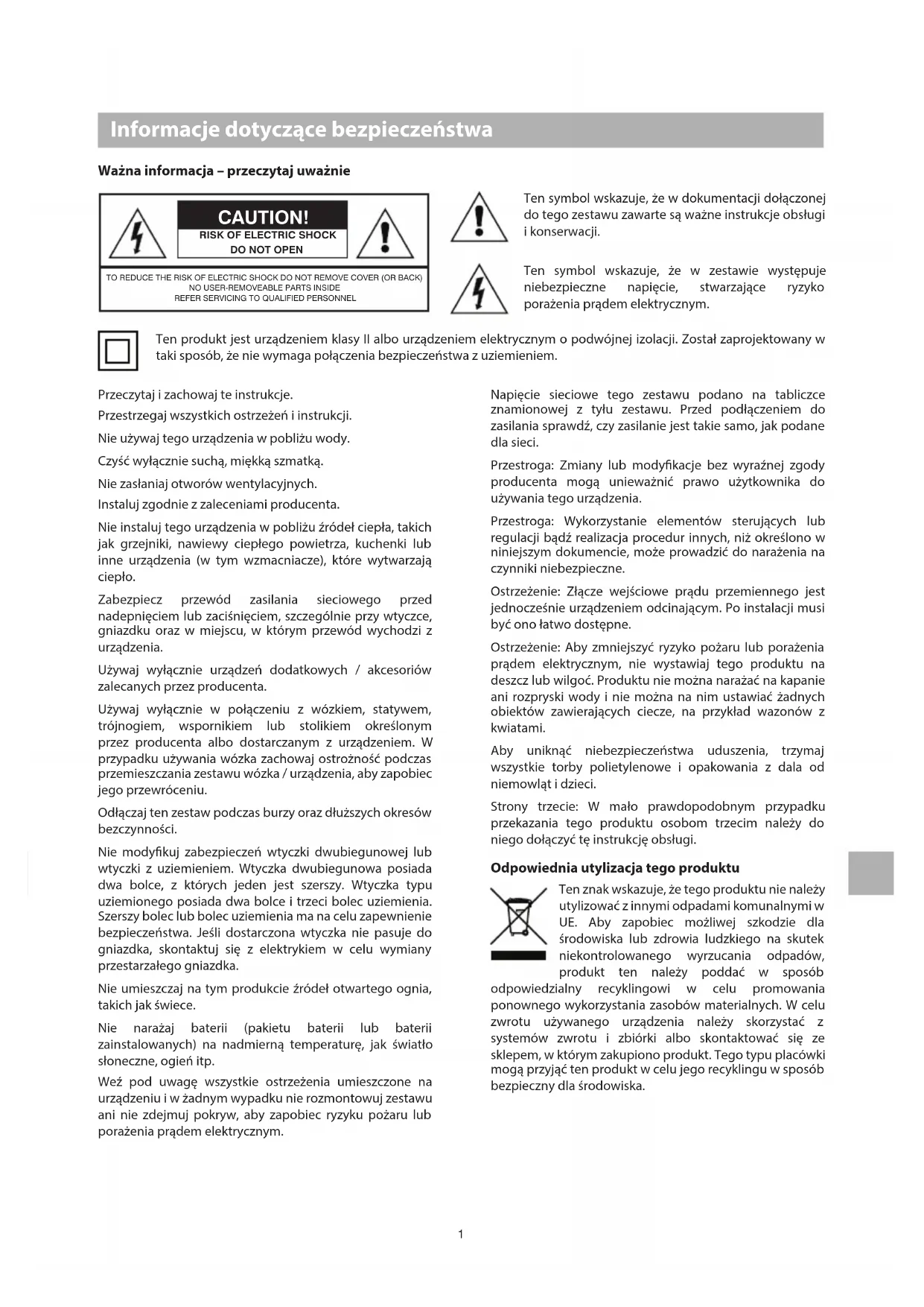 Informacje dotyczące bezpieczeństwa Ważna informacja – przeczytaj uważnie CAUTION! RISK OF ELECTRIC SHOCKDO NOT OPENTO REDUCE THE RISK OF ELECTRIC SHOCK DO NOT REMOVE COVER (OR BACK)NO USER-REMOVEABLE PARTS INSIDEREFER SERVICING TO QUALIFIED PERSONNEL Ten symbol wskazuje, że w dokumentacji dołączonej do tego zestawu zawarte są ważne instrukcje obsługi i konserwacji. Ten symbol wskazuje, że w zestawie występuje niebezpieczne napięcie, stwarzające ryzyko porażenia prądem elektrycznym. Przeczytaj i zachowaj te instrukcje. Przestrzegaj wszystkich ostrzeżeń i instrukcji. Nie używaj tego urządzenia w pobliżu wody. Czyść wyłącznie suchą, miękką szmatką. Nie zasłaniaj otworów wentylacyjnych. Instaluj zgodnie z zaleceniami producenta. Nie instaluj tego urządzenia w pobliżu źródeł ciepła, takich jak grzejniki, nawiewy ciepłego powietrza, kuchenki lub inne urządzenia (w tym wzmacniacze), które wytwarzają ciepło. Zabezpiecz przewód zasilania sieciowego przed nadepnięciem lub zaciśnięciem, szczególnie przy wtyczce, gniazdku oraz w miejscu, w którym przewód wychodzi z urządzenia. Używaj wyłącznie urządzeń dodatkowych / akcesoriów zalecanych przez producenta. Używaj wyłącznie w połączeniu z wózkiem, statywem, trójnogiem, wspornikiem lub stolikiem określonym przez producenta albo dostarczanym z urządzeniem. W przypadku używania wózka zachowaj ostrożność podczas przemieszczania zestawu wózka / urządzenia, aby zapobiec jego przewróceniu. Odłączaj ten zestaw podczas burzy oraz dłuższych okresów bezczynności. Nie modykuj zabezpieczeń wtyczki dwubiegunowej lub wtyczki z uziemieniem. Wtyczka dwubiegunowa posiada dwa bolce, z których jeden jest szerszy. Wtyczka typu uziemionego posiada dwa bolce i trzeci bolec uziemienia. Szerszy bolec lub bolec uziemienia ma na celu zapewnienie bezpieczeństwa. Jeśli dostarczona wtyczka nie pasuje do gniazdka, skontaktuj się z elektrykiem w celu wymiany przestarzałego gniazdka. Nie umieszczaj na tym produkcie źródeł otwartego ognia, takich jak świece. Nie narażaj baterii (pakietu baterii lub baterii zainstalowanych) na nadmierną temperaturę, jak światło słoneczne, ogień itp. Weź pod uwagę wszystkie ostrzeżenia umieszczone na urządzeniu i w żadnym wypadku nie rozmontowuj zestawu ani nie zdejmuj pokryw, aby zapobiec ryzyku pożaru lub porażenia prądem elektrycznym. Napięcie sieciowe tego zestawu podano na tabliczce znamionowej z tyłu zestawu. Przed podłączeniem do zasilania sprawdź, czy zasilanie jest takie samo, jak podane dla sieci. Przestroga: Zmiany lub modykacje bez wyraźnej zgody producenta mogą unieważnić prawo użytkownika do używania tego urządzenia. Przestroga: Wykorzystanie elementów sterujących lub regulacji bądź realizacja procedur innych, niż określono w niniejszym dokumencie, może prowadzić do narażenia na czynniki niebezpieczne. Ostrzeżenie: Złącze wejściowe prądu przemiennego jest jednocześnie urządzeniem odcinającym. Po instalacji musi być ono łatwo dostępne. Ostrzeżenie: Aby zmniejszyć ryzyko pożaru lub porażenia prądem elektrycznym, nie wystawiaj tego produktu na deszcz lub wilgoć. Produktu nie można narażać na kapanie ani rozpryski wody i nie można na nim ustawiać żadnych obiektów zawierających ciecze, na przykład wazonów z kwiatami. Aby uniknąć niebezpieczeństwa uduszenia, trzymaj wszystkie torby polietylenowe i opakowania z dala od niemowląt i dzieci. Strony trzecie: W mało prawdopodobnym przypadku przekazania tego produktu osobom trzecim należy do niego dołączyć tę instrukcję obsługi. Odpowiednia utylizacja tego produktu Ten znak wskazuje, że tego produktu nie należy utylizować z innymi odpadami komunalnymi w UE. Aby zapobiec możliwej szkodzie dla środowiska lub zdrowia ludzkiego na skutek niekontrolowanego wyrzucania odpadów, produkt ten należy poddać w sposób odpowiedzialny recyklingowi w celu promowania ponownego wykorzystania zasobów materialnych. W celu zwrotu używanego urządzenia należy skorzystać z systemów zwrotu i zbiórki albo skontaktować się ze sklepem, w którym zakupiono produkt. Tego typu placówki mogą przyjąć ten produkt w celu jego recyklingu w sposób bezpieczny dla środowiska. Ten produkt jest urządzeniem klasy II albo urządzeniem elektrycznym o podwójnej izolacji. Został zaprojektowany w taki sposób, że nie wymaga połączenia bezpieczeństwa z uziemieniem.2