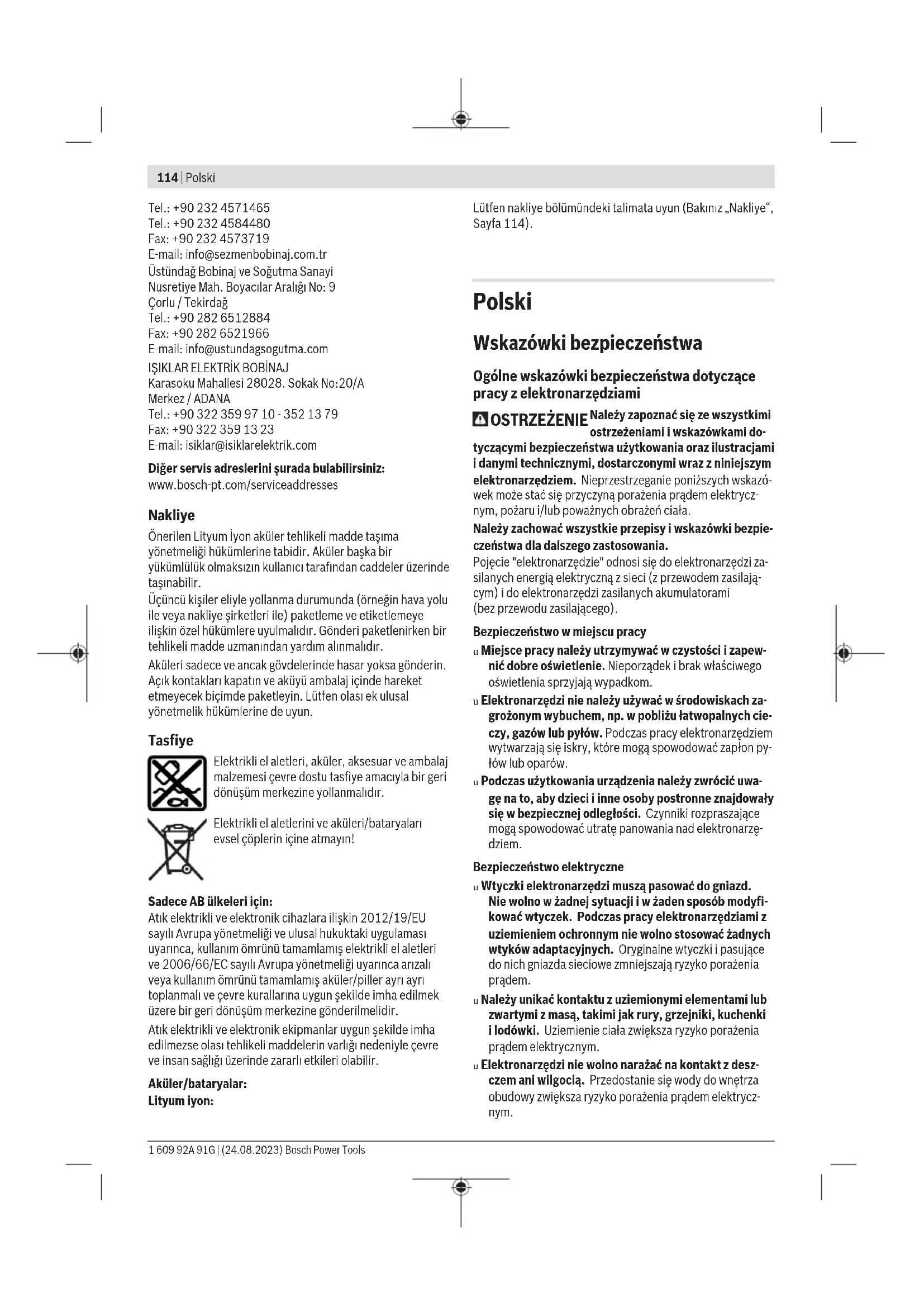 Karasoku Mahallesi 28028. Sokak No:20/A Merkez / ADANA Tel.: +903223599710 -3521379 Fax: +903223591323 E-mail: isiklar@isiklarelektrik.com Diğer servis adreslerini şurada bulabilirsiniz: www.bosch-pt.com/serviceaddresses Nakliye Önerilen Lityum İyon aküler tehlikeli madde taşıma yönetmeliği hükümlerine tabidir. Aküler başka bir yükümlülük olmaksızın kullanıcı tarafından caddeler üzerinde taşınabilir. Üçüncü kişiler eliyle yollanma durumunda (örneğin hava yolu ile veya nakliye şirketleri ile) paketleme ve etiketlemeye ilişkin özel hükümlere uyulmalıdır. Gönderi paketlenirken bir tehlikeli madde uzmanından yardım alınmalıdır. Aküleri sadece ve ancak gövdelerinde hasar yoksa gönderin. Açık kontakları kapatın ve aküyü ambalaj içinde hareket etmeyecek biçimde paketleyin. Lütfen olası ek ulusal yönetmelik hükümlerine de uyun. Tasfiye Elektrikli el aletleri, aküler, aksesuar ve ambalaj malzemesi çevre dostu tasfiye amacıyla bir geri dönüşüm merkezine yollanmalıdır. Elektrikli el aletlerini ve aküleri/bataryaları evsel çöplerin içine atmayın! Sadece AB ülkeleri için: Atık elektrikli ve elektronik cihazlara ilişkin 2012/19/EU sayılı Avrupa yönetmeliği ve ulusal hukuktaki uygulaması uyarınca, kullanım ömrünü tamamlamış elektrikli el aletleri ve 2006/66/EC sayılı Avrupa yönetmeliği uyarınca arızalı veya kullanım ömrünü tamamlamış aküler/piller ayrı ayrı toplanmalı ve çevre kurallarına uygun şekilde imha edilmek üzere bir geri dönüşüm merkezine gönderilmelidir. Atık elektrikli ve elektronik ekipmanlar uygun şekilde imha edilmezse olası tehlikeli maddelerin varlığı nedeniyle çevre ve insan sağlığı üzerinde zararlı etkileri olabilir. Aküler/bataryalar: Lityum iyon: Lütfen nakliye bölümündeki talimata uyun (Bakınız „Nakliye“, Sayfa114). Polski Wskazówki bezpieczeństwa Ogólne wskazówki bezpieczeństwa dotyczące pracy z elektronarzędziami OSTRZEŻENIE Należy zapoznać się ze wszystkimi ostrzeżeniami i wskazówkami do- tyczącymi bezpieczeństwa użytkowania oraz ilustracjami i danymi technicznymi, dostarczonymi wraz z niniejszym elektronarzędziem. Nieprzestrzeganie poniższych wskazó- wek może stać się przyczyną porażenia prądem elektrycz- nym, pożaru i/lub poważnych obrażeń ciała. Należy zachować wszystkie przepisy i wskazówki bezpie- czeństwa dla dalszego zastosowania. Pojęcie "elektronarzędzie" odnosi się do elektronarzędzi za- silanych energią elektryczną z sieci (z przewodem zasilają- cym) i do elektronarzędzi zasilanych akumulatorami (bezprzewodu zasilającego). Bezpieczeństwo w miejscu pracy u Miejsce pracy należy utrzymywać w czystości i zapew- nić dobre oświetlenie. Nieporządek i brak właściwego oświetlenia sprzyjają wypadkom. u Elektronarzędzi nie należy używać w środowiskach za- grożonym wybuchem, np. w pobliżu łatwopalnych cie- czy, gazów lub pyłów. Podczas pracy elektronarzędziem wytwarzają się iskry, które mogą spowodować zapłon py- łów lub oparów. u Podczas użytkowania urządzenia należy zwrócić uwa- gę na to, aby dzieci i inne osoby postronne znajdowały się w bezpiecznej odległości. Czynniki rozpraszające mogą spowodować utratę panowania nad elektronarzę- dziem. Bezpieczeństwo elektryczne u Wtyczki elektronarzędzi muszą pasować do gniazd. Nie wolno w żadnej sytuacji i w żaden sposób modyfi- kować wtyczek. Podczas pracy elektronarzędziami z uziemieniem ochronnym nie wolno stosować żadnych wtyków adaptacyjnych. Oryginalne wtyczki i pasujące do nich gniazda sieciowe zmniejszają ryzyko porażenia prądem. u Należy unikać kontaktu z uziemionymi elementami lub zwartymi z masą, takimi jak rury, grzejniki, kuchenki ilodówki. Uziemienie ciała zwiększa ryzyko porażenia prądem elektrycznym. u Elektronarzędzi nie wolno narażać na kontakt z desz- czem ani wilgocią. Przedostanie się wody do wnętrza obudowy zwiększa ryzyko porażenia prądem elektrycz- nym. 1 609 92A 91G | (24.08.2023) Bosch Power ToolsPolski | 115 u Nie używać przewodu zasilającego do innych celów. Nie wolno używać przewodu do przenoszenia ani prze- suwania elektronarzędzia; nie wolno też wyjmować wtyczki z gniazda, pociągając za przewód. Przewód należy chronić przed wysokimi temperaturami, należy go trzymać zdala od oleju, ostrych krawędzi i rucho- mych części urządzenia. Uszkodzone lub splątane prze- wody zwiększają ryzyko porażenia prądem elektrycznym. u Używając elektronarzędzia na świeżym powietrzu, na- leży upewnić się, że przedłużacz jest przeznaczony do pracy na zewnątrz. Użycie przedłużacza przeznaczone- go do pracy na zewnątrz zmniejsza ryzyko porażenia prą- dem elektrycznym. u Jeżeli nie ma innej możliwości, niż użycie elektrona- rzędzia w wilgotnym otoczeniu, należy podłączyć je do źródła zasilania wyposażonego w wyłącznik ochronny różnicowoprądowy. Zastosowanie wyłącznika ochron- nego różnicowoprądowego zmniejsza ryzyko porażenia prądem elektrycznym. Bezpieczeństwo osób u Podczas pracy z elektronarzędziem należy zachować czujność, każdą czynność wykonywać ostrożnie i z rozwagą. Nie przystępować do pracy elektronarzę- dziem w stanie zmęczenia lub będąc pod wpływem narkotyków, alkoholu lub leków. Chwila nieuwagi pod- czas pracy może grozić bardzo poważnymi obrażeniami ciała. u Stosować środki ochrony osobistej. Należy zawsze nosić okulary ochronne. Środki ochrony osobistej, np. maska przeciwpyłowa, antypoślizgowe obuwie, kask ochronny czy ochraniacze na uszy, w określonych warun- kach pracy obniżają ryzyko obrażeń ciała. u Należy unikać niezamierzonego uruchomienia narzę- dzia. Przed podłączeniem elektronarzędzia do źródła zasilania i/lub podłączeniem akumulatora, podniesie- niem albo transportem urządzenia, należy upewnić się, że włącznik elektronarz