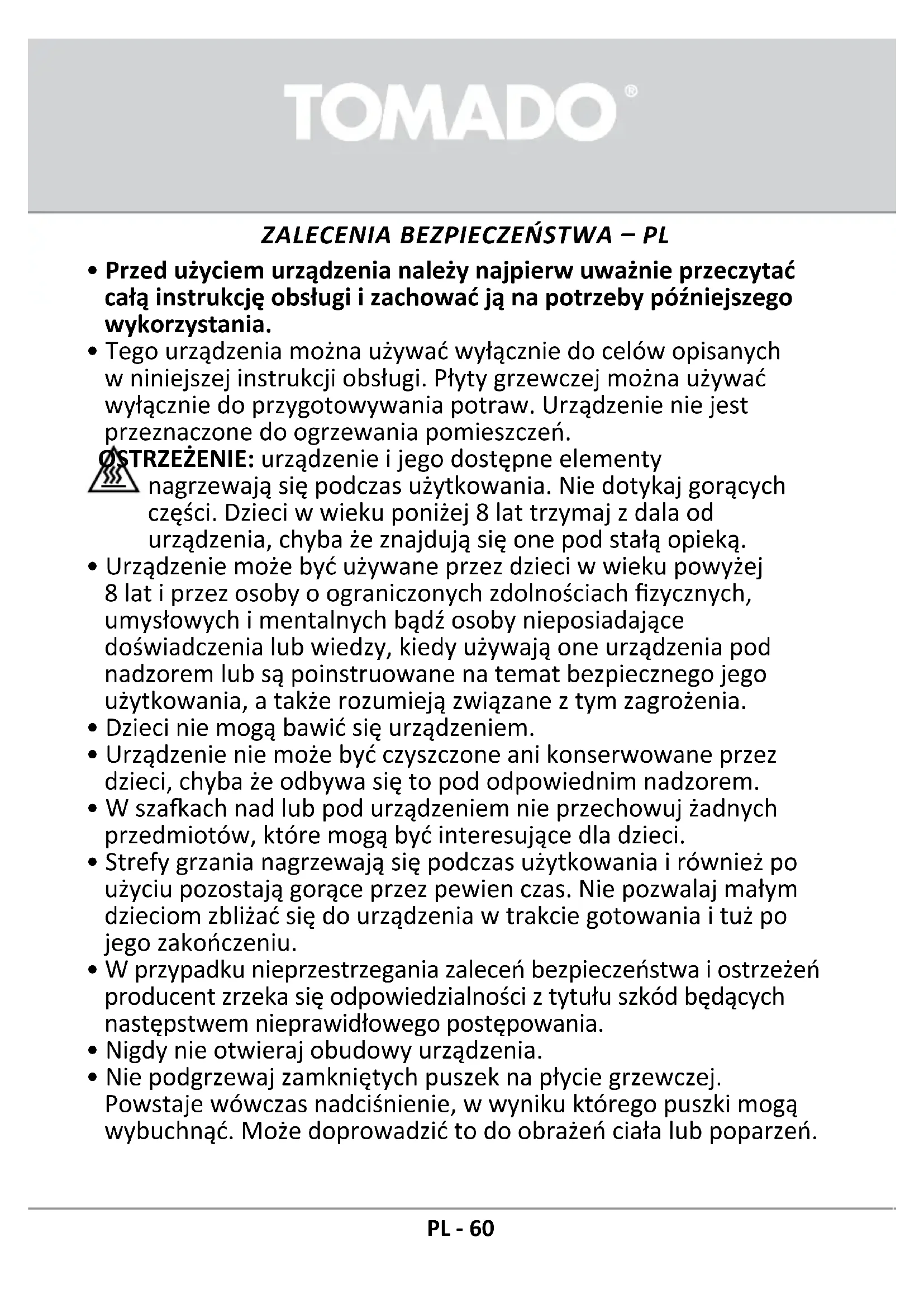 - Tego urzadzeniaromaticu uzywac wylicznie do celów opisanych w niniejszej instrukcji obstugi. Pfyty grzewczyjromaticu uzywac wylicznie do przygotowywnia potraw. Urzadzenia nie jest przyznaczone do ogrzewania pomieszczen.