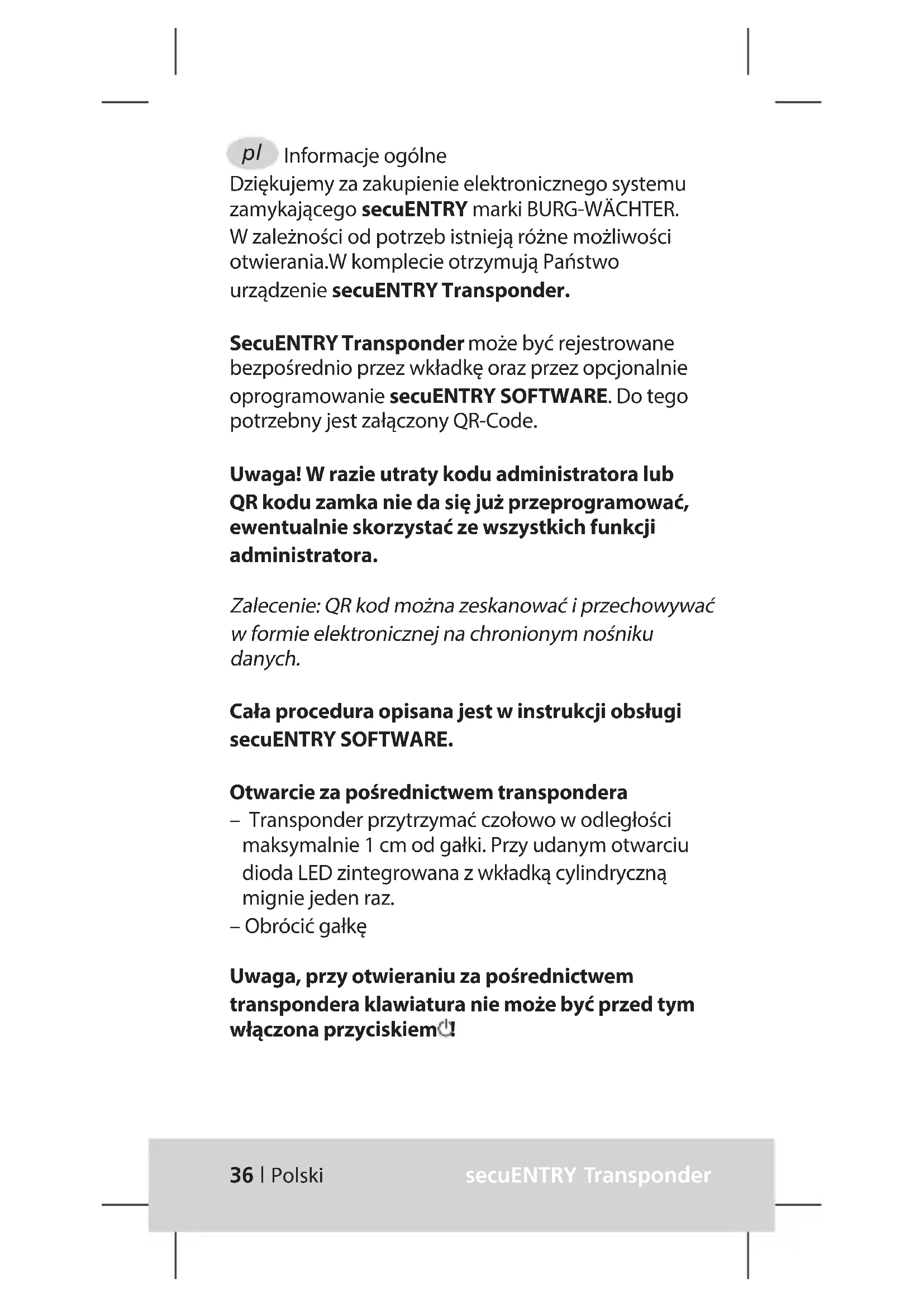 Dziekujemy za zakupienie elektronicznego systemu zamykajacego secuENTRY marki BURG-WACHTER. Wazolejni ci od potrzej istnieje rozne moziwosci otwierania.W komplecie otrzymuja Państwo urzadzenia secuENTRY Transponder.