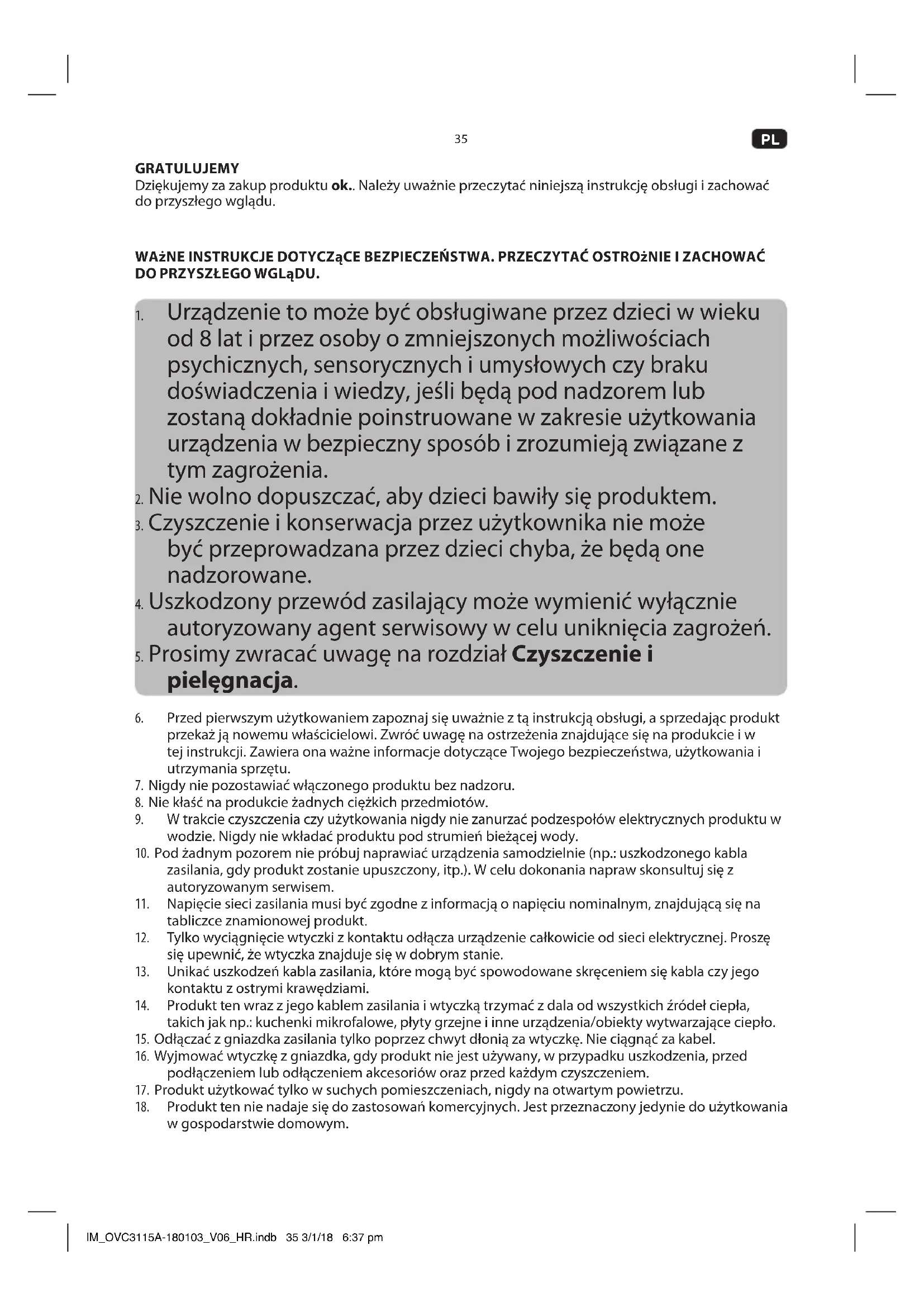 - W celu uzyskania informacji technicznych proszę się zapoznać z poniższą stroną internetową lub skontaktować z wytwórcą, w celu uzyskania dokumentacji technicznej: www.ok-online.com UTYLIZACJA Nie należy wyrzucać tego urządzenia wraz z odpadami domowymi. Zużyty sprzęt należy oddać do wyznaczonego punktu zbiórki sprzętu elektrycznego i elektronicznego. Więcej informacji na ten temat udzielają lokalne władze lub sprzedawca urządzenia. IM_OVC3115A-180103_V06_HR.indb 38 3/1/18 6:37 pm39