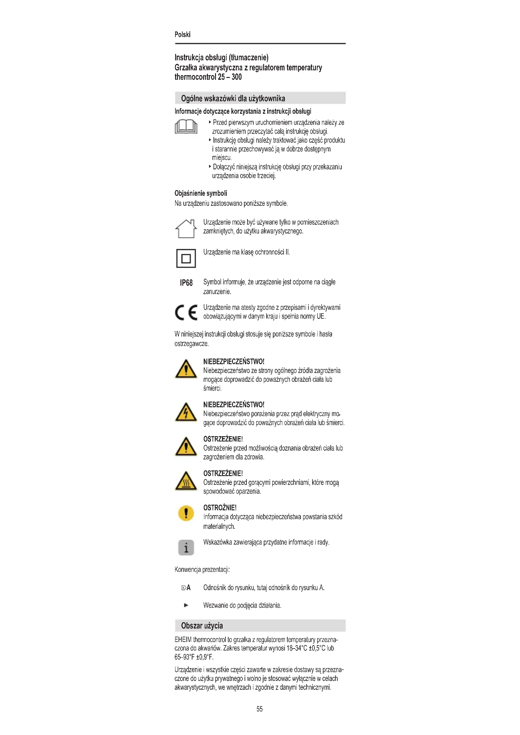 Instrukcja obsługi (tłumaczenie) Grzałka akwarystyczna z regulatorem temperatury thermocontrol 25 – 300 Ogólne wskazówki dla użytkownika Informacje dotyczące korzystania z instrukcji obsługi ▶ Przed pierwszym uruchomieniem urządzenia należy ze zrozumieniem przeczytać całą instrukcję obsługi. ▶ Instrukcję obsługi należy traktować jako część produktu i starannie przechowywać ją w dobrze dostępnym miejscu. ▶ Dołączyć niniejszą instrukcję obsługi przy przekazaniu urządzenia osobie trzeciej. Objaśnienie symboli Na urządzeniu zastosowano poniższe symbole. Urządzenie może być używane tylko w pomieszczeniach zamkniętych, do użytku akwarystycznego. Urządzenie ma klasę ochronności II. IP68 Symbol informuje, że urządzenie jest odporne na ciągłe zanurzenie. Urządzenie ma atesty zgodne z przepisami i dyrektywami obowiązującymi w danym kraju i spełnia normy UE. W niniejszej instrukcji obsługi stosuje się poniższe symbole i hasła ostrzegawcze. NIEBEZPIECZEŃSTWO! Niebezpieczeństwo ze strony ogólnego źródła zagrożenia mogące doprowadzić do poważnych obrażeń ciała lub śmierci. NIEBEZPIECZEŃSTWO! Niebezpieczeństwo porażenia przez prąd elektryczny mo