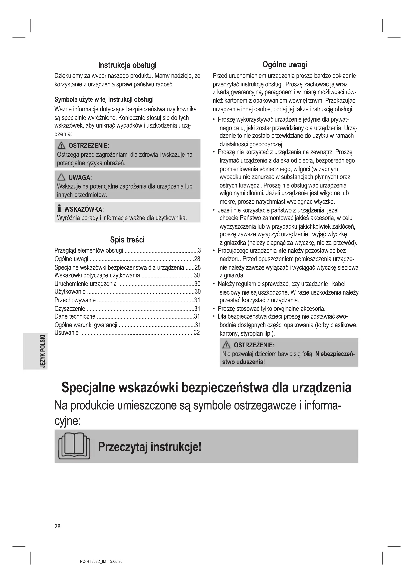 Przed uruchomieniem urzadzenia prosze bardzo dokladnie przyczyć instructkcje obslugi. Prosze zachować ja wraz z karta gwarancyjna, paragonem i w miäre只得sci rownież kartonem z opakowaniem wewnétrznym. Przekazuć urzadzenia内在oj osobie, oddaj jej takość instructkcje obslugi.