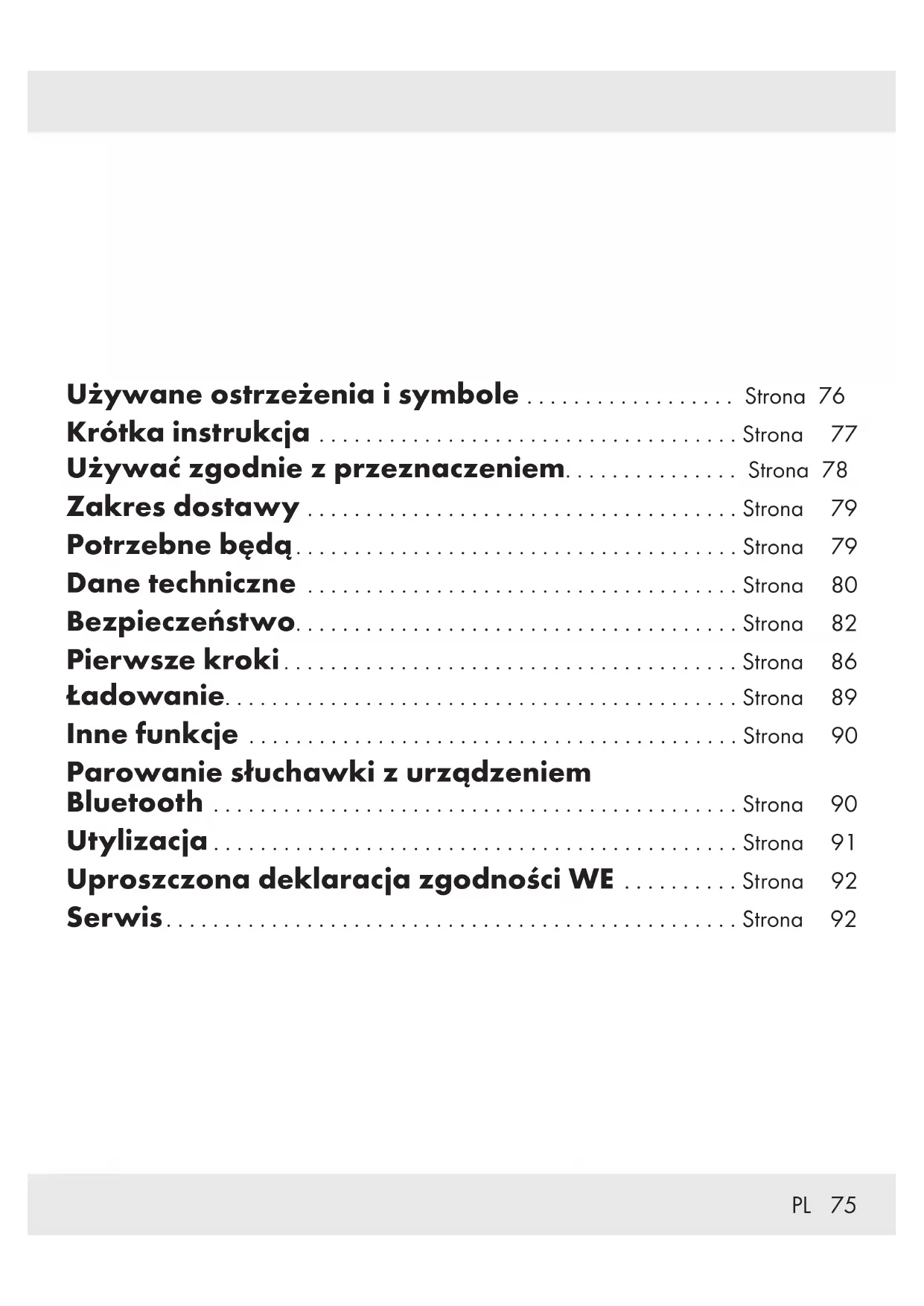 OSTRZEŻENIE! Należy przestrzegać kompletnej instrukcji obsługi oraz wskazówek bezpieczeństwa, aby uniknąć obrażeń ciała i szkód materialnych. Skrócona instrukcja obsługi jest integralną częścią tego produktu. Przed użyciem produktu należy zapoznać się ze wszystkimi wskazówkami dotyczącymi obsługi i bezpieczeństwa. Zachować skróconą instrukcję a przy przekazaniu produktu osobom trzecim należy ją dołączyć. Używać zgodnie z przeznaczeniem Te słuchawki są produktem elektroniki użytkowej. Słuchawki są przeznaczone do odtwarzania materiału dźwiękowego przez połączenie Bluetooth