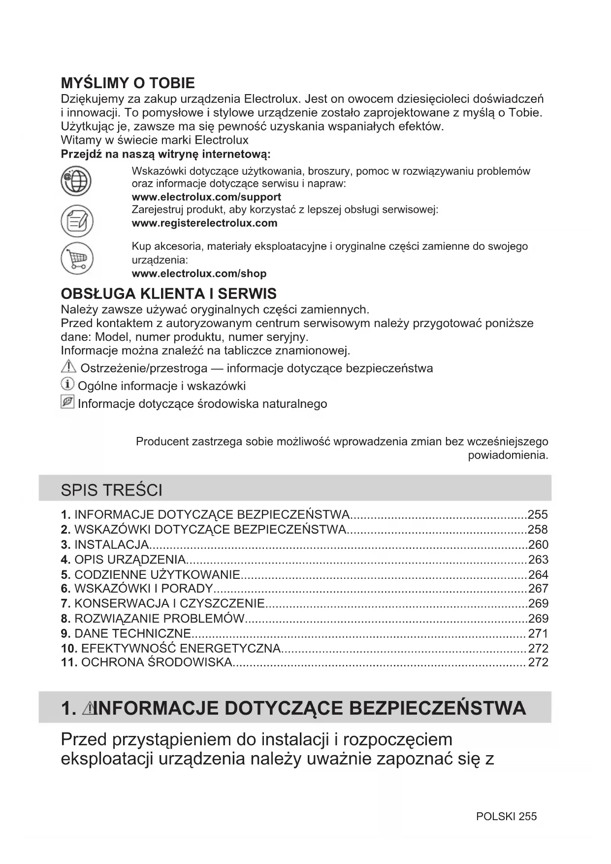 Dziękujemy za zakup urządzenia Electrolux. Jest on owocem dziesięcioleci doświadczeń i innowacji. To pomysłowe i stylowe urządzenie zostało zaprojektowane z myślą o Tobie. Użytkując je, zawsze ma się pewność uzyskania wspaniałych efektów. Witamy w świecie marki Electrolux Przejdź na naszą witrynę internetową:Wskazówki dotyczące użytkowania, broszury, pomoc w rozwiązywaniu problemóworaz informacje dotyczące serwisu i napraw:www.electrolux.com/supportZarejestruj produkt, aby korzystać z lepszej obsługi serwisowej:www.registerelectrolux.comKup akcesoria, materiały eksploatacyjne i oryginalne części zamienne do swojegourządzenia:www.electrolux.com/shop