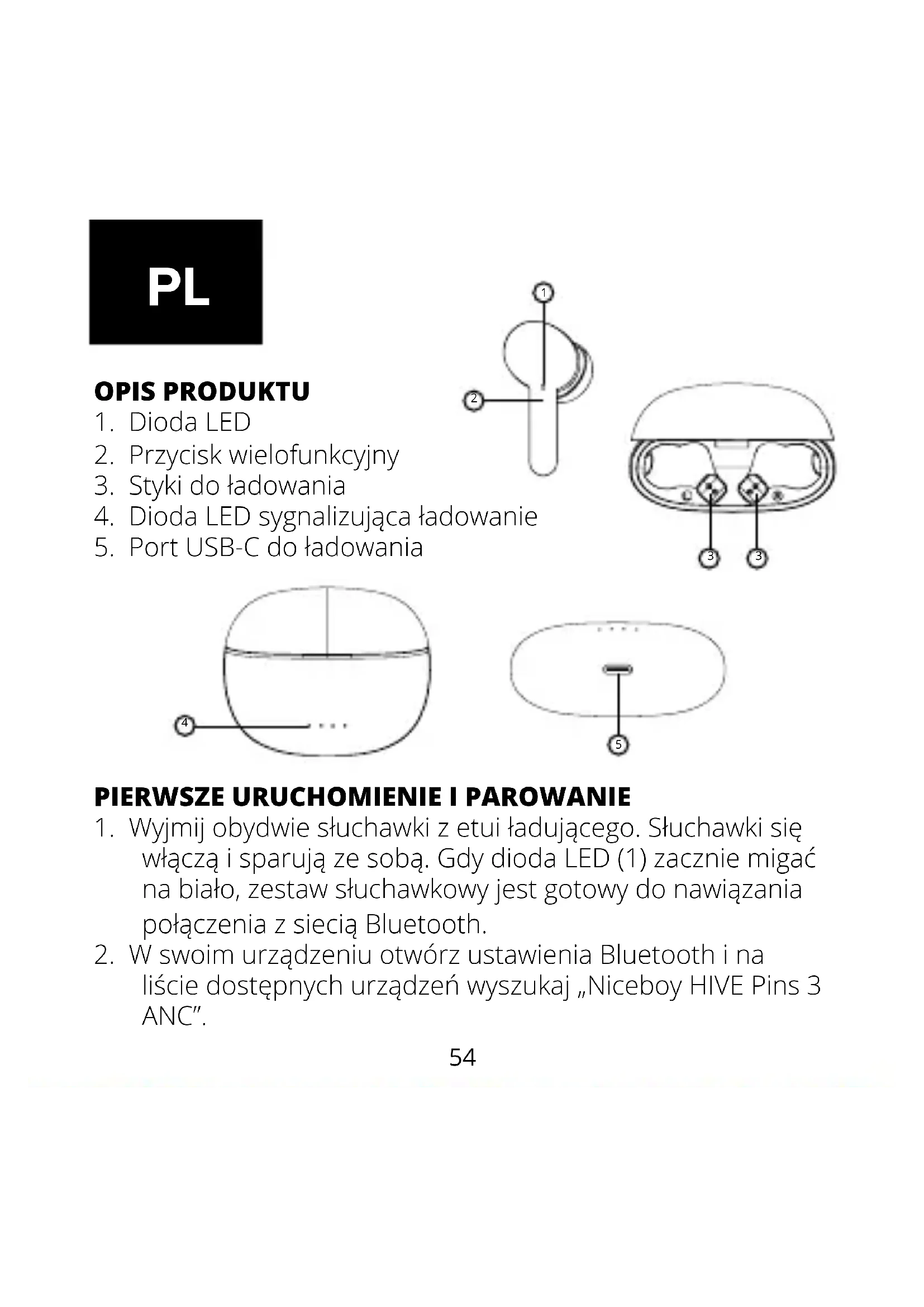 same się włączą i sparują ze sobą. Na tym proces się kończy. DANE TECHNICZNE BT: 5.3 Pasmo częstotliwości: 2,4 GHz Moc częstotliwości radiowej: ≤ 2,5 mW Prole T: HFP, A2DP, AVRCP Obsługiwane kodery-dekodery: AAC, SBC Stopień ochrony: IPX4 Transmisja na odległość: 10 m Głośnik: 10 mm Częstotliwość: 20 Hz-20 kHz Czułość: 118 ±1,5 dB Czas odtwarzania na jednym ładowaniu:do 10 godzin Łączny czas odtwarzania: do 40 godzin Pojemność baterii słuchawek: 50 mAh Pojemność baterii etui ładującego: 400 mAh Asystenci głosowi: Siri i Google Assistant Parowanie Multipoint: TAK ZAWARTOŚĆ OPAKOWANIA: Słuchawki Niceboy HIVE Pins 3 ANC60 Etui ładujące Zapasowe nakładki do uszu Kabel USB-C Podręcznik użytkownika