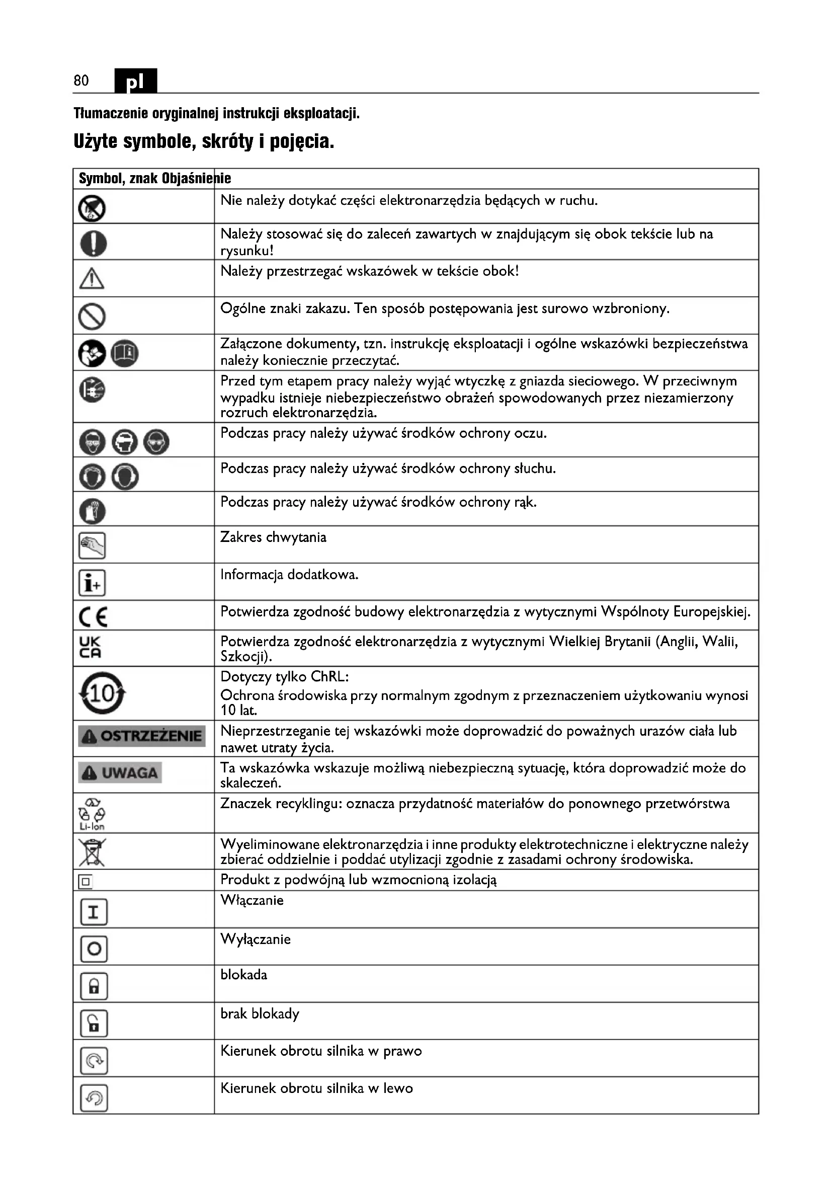 Tłumaczenie oryginalnej instrukcji eksploatacji. Użyte symbole, skróty i pojęcia. Symbol, znak Objaśnienie Nie należy dotykać części elektronarzędzia będących w ruchu. Należy stosować się do zaleceń zawartych w znajdującym się obok tekście lub na rysunku! Należy przestrzegać wskazówek w tekście obok! Ogólne znaki zakazu. Ten sposób postępowania jest surowo wzbroniony. Załączone dokumenty, tzn. instrukcję eksploatacji i ogólne wskazówki bezpieczeństwa należy koniecznie przeczytać. Przed tym etapem pracy należy wyjąć wtyczkę z gniazda sieciowego. W przeciwnym wypadku istnieje niebezpieczeństwo obrażeń spowodowanych przez niezamierzony rozruch elektronarzędzia. Podczas pracy należy używać środków ochrony oczu. Podczas pracy należy używać środków ochrony słuchu. Podczas pracy należy używać środków ochrony rąk. Zakres chwytania Informacja dodatkowa. Potwierdza zgodność budowy elektronarzędzia z wytycznymi Wspólnoty Europejskiej. Potwierdza zgodność elektronarzędzia z wytycznymi Wielkiej Brytanii (Anglii, Walii, Szkocji). Dotyczy tylko ChRL: Ochrona środowiska przy normalnym zgodnym z przeznaczeniem użytkowaniu wynosi 10 lat. Nieprzestrzeganie tej wskazówki może doprowadzić do poważnych urazów ciała lub nawet utraty życia. Ta wskazówka wskazuje możliwą niebezpieczną sytuację, która doprowadzić może do skaleczeń. Znaczek recyklingu: oznacza przydatność materiałów do ponownego przetwórstwa Wyeliminowane elektronarzędzia i inne produkty elektrotechniczne i elektryczne należy zbierać oddzielnie i poddać utylizacji zgodnie z zasadami ochrony środowiska. Produkt z podwójną lub wzmocnioną izolacją Włączanie Wyłączanie blokada brak blokady Kierunek obrotu silnika w prawo Kierunek obrotu silnika w lewo81