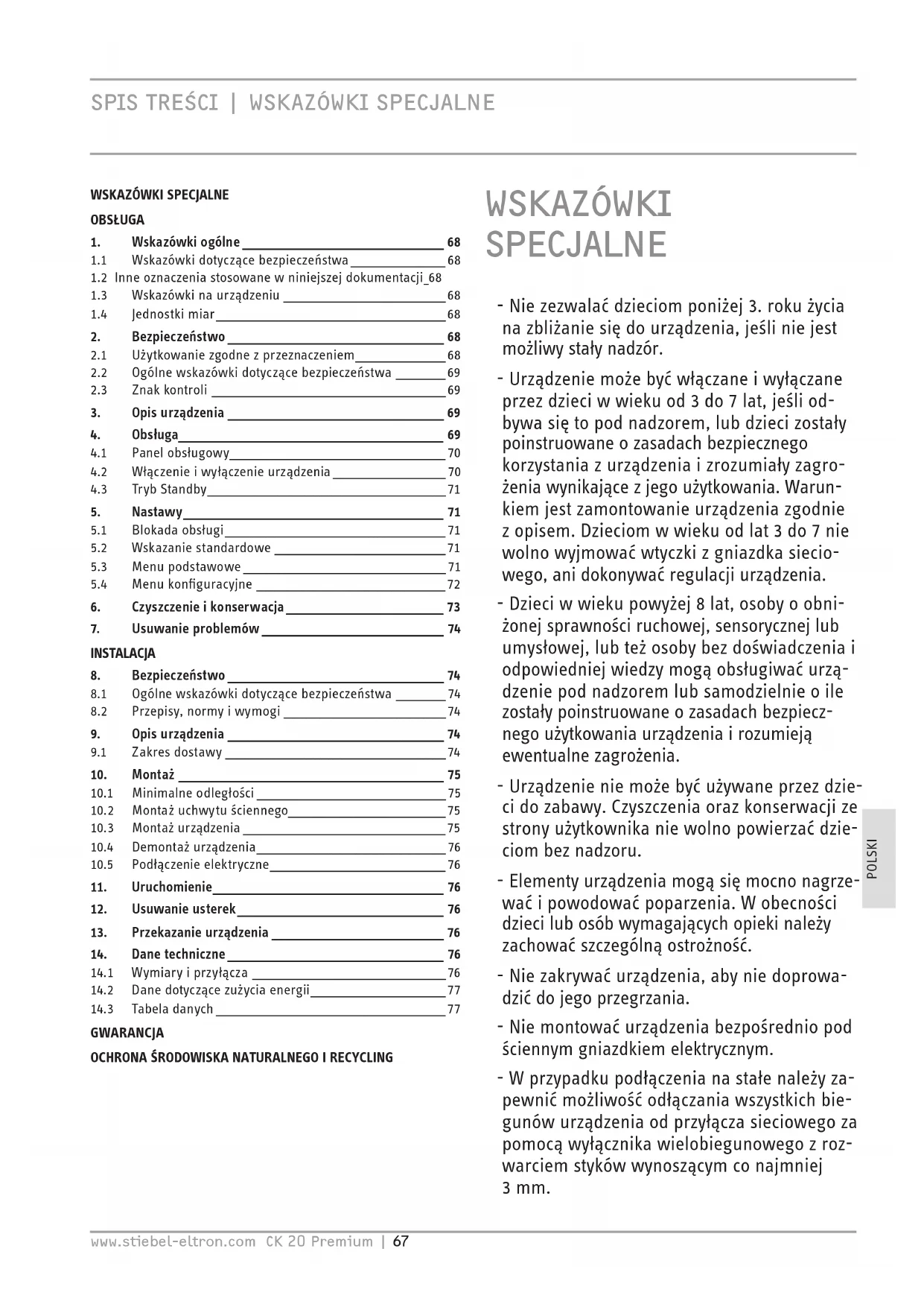 www.stiebel-eltron.com CK 20 Premium | 67 POLSKI SPIS TReŚCI | WSkAzóWkI SPeCJAlNe WSkAzóWkI SPeCJAlNe - Nie zezwalać dzieciom poniżej 3.roku życia na zbliżanie się do urządzenia, jeśli nie jest możliwy stały nadzór. - Urządzenie może być włączane iwyłączane przez dzieci wwieku od 3do 7 lat, jeśli od- bywa się to pod nadzorem, lub dzieci zostały poinstruowane o zasadach bezpiecznego korzystania zurządzenia izrozumiały zagro- żenia wynikające zjego użytkowania. Warun- kiem jest zamontowanie urządzenia zgodnie zopisem. Dzieciom wwieku od lat 3 do 7 nie wolno wyjmować wtyczki zgniazdka siecio- wego, ani dokonywać regulacji urządzenia. - Dzieci w wieku powyżej 8 lat, osoby o obni- żonej sprawności ruchowej, sensorycznej lub umysłowej, lub też osoby bez doświadczenia i odpowiedniej wiedzy mogą obsługiwać urzą- dzenie pod nadzorem lub samodzielnie o ile zostały poinstruowane o zasadach bezpiecz- nego użytkowania urządzenia i rozumieją ewentualne zagrożenia. - Urządzenie nie może być używane przez dzie- ci do zabawy. Czyszczenia oraz konserwacji ze strony użytkownika nie wolno powierzać dzie- ciom bez nadzoru. - Elementy urządzenia mogą się mocno nagrze- wać ipowodować poparzenia. Wobecności dzieci lub osób wymagających opieki należy zachować szczególną ostrożność. - Nie zakrywać urządzenia, aby nie doprowa- dzić do jego przegrzania. - Nie montować urządzenia bezpośrednio pod ściennym gniazdkiem elektrycznym. - Wprzypadku podłączenia na stałe należy za- pewnić możliwość odłączania wszystkich bie- gunów urządzenia od przyłącza sieciowego za pomocą wyłącznika wielobiegunowego zroz- warciem styków wynoszącym co najmniej 3mm.