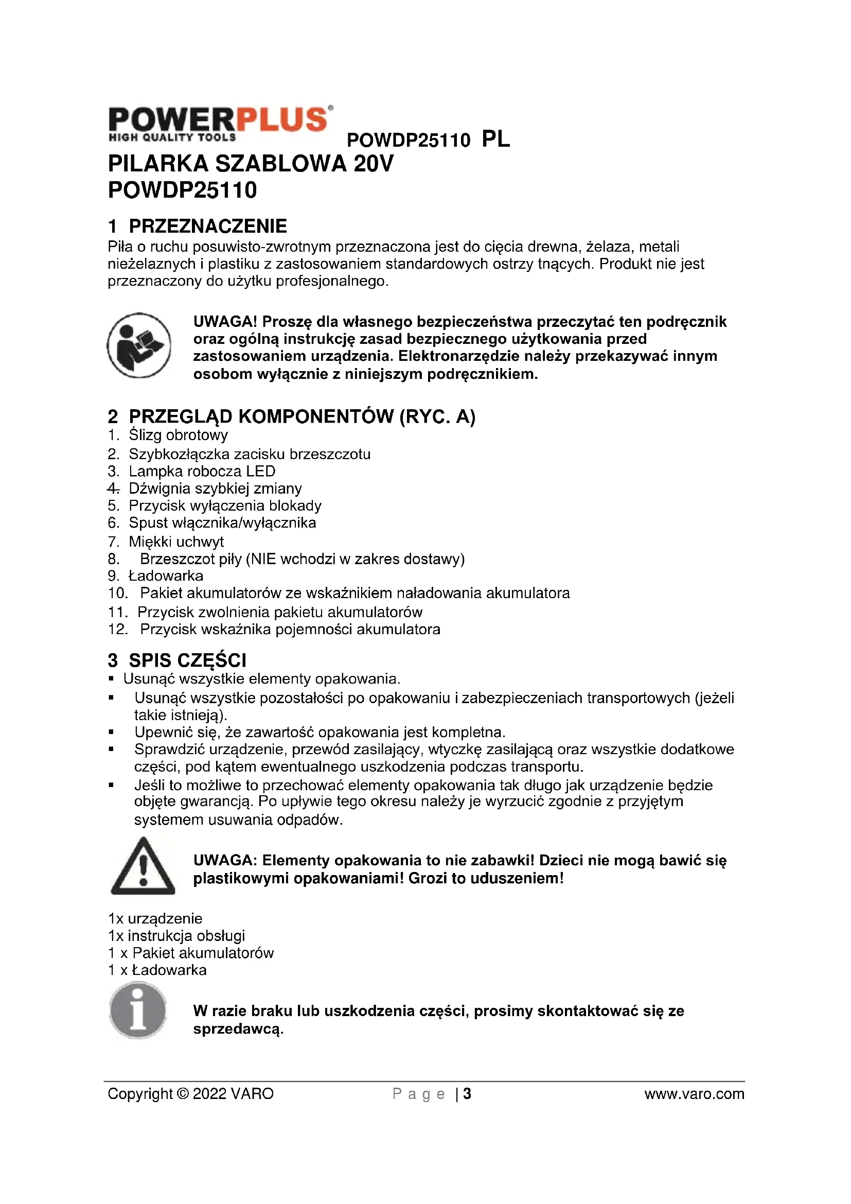 - W czasie pracy urządzenia w najbliższym otoczeniu nie mogą przebywać dzieci ani inne osoby postronne. Nieuwaga może prowadzić do utraty kontroli nad urządzeniem.POWDP25110 PL Copyright © 2022 VARO P a g e | 5 www.varo.com