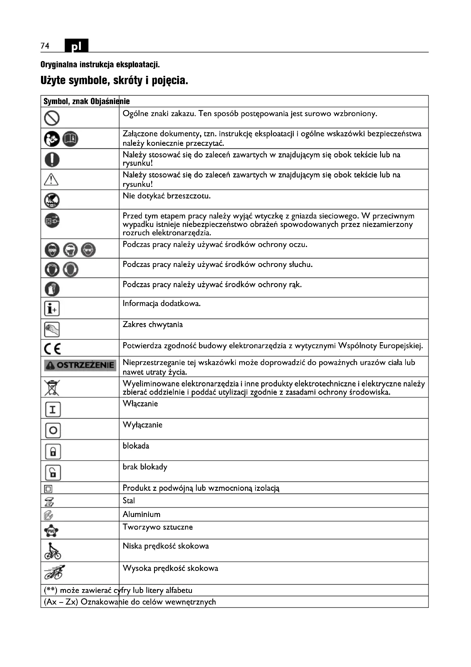 Oryginalna instrukcja eksploatacji. Użyte symbole, skróty i pojęcia. Symbol, znak Objaśnienie Ogólne znaki zakazu. Ten sposób postępowania jest surowo wzbroniony. Załączone dokumenty, tzn. instrukcję eksploatacji i ogólne wskazówki bezpieczeństwa należy koniecznie przeczytać. Należy stosować się do zaleceń zawartych w znajdującym się obok tekście lub na rysunku! Należy stosować się do zaleceń zawartych w znajdującym się obok tekście lub na rysunku! Nie dotykać brzeszczotu. Przed tym etapem pracy należy wyjąć wtyczkę z gniazda sieciowego. W przeciwnym wypadku istnieje niebezpieczeństwo obrażeń spowodowanych przez niezamierzony rozruch elektronarzędzia. Podczas pracy należy używać środków ochrony oczu. Podczas pracy należy używać środków ochrony słuchu. Podczas pracy należy używać środków ochrony rąk. Informacja dodatkowa. Zakres chwytania Potwierdza zgodność budowy elektronarzędzia z wytycznymi Wspólnoty Europejskiej. Nieprzestrzeganie tej wskazówki może doprowadzić do poważnych urazów ciała lub nawet utraty życia. Wyeliminowane elektronarzędzia i inne produkty elektrotechniczne i elektryczne należy zbierać oddzielnie i poddać utylizacji zgodnie z zasadami ochrony środowiska. Włączanie Wyłączanie blokada brak blokady Produkt z podwójną lub wzmocnioną izolacją Stal Aluminium Tworzywo sztuczne Niska prędkość skokowa Wysoka prędkość skokowa (**) może zawierać cyfry lub litery alfabetu (Ax – Zx) Oznakowanie do celów wewnętrznych OBJ_BUCH-0000000078-004.book Page 74 Wednesday, February 26, 2020 1:28 PM75