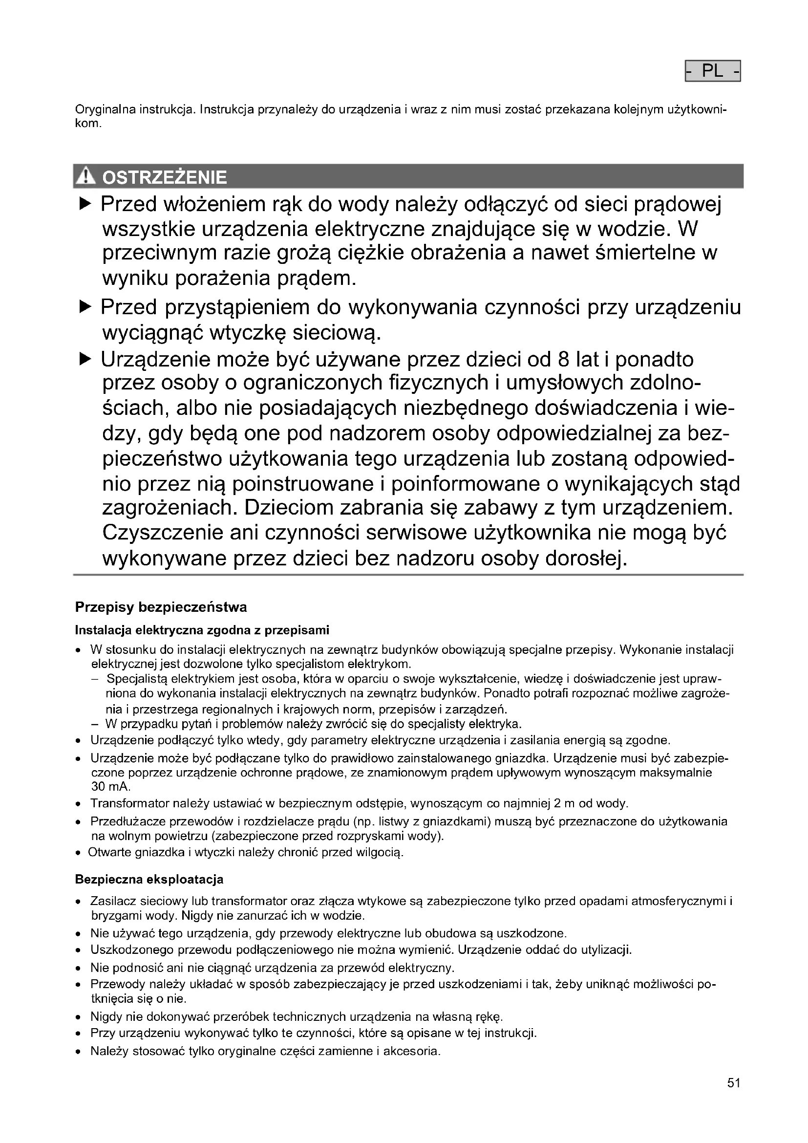 OSTRZEŻENIE Przed włożeniem rąk do wody należy odłączyć od sieci prądowej wszystkie urządzenia elektryczne znajdujące się w wodzie. W przeciwnym razie grożą ciężkie obrażenia a nawet śmiertelne w wyniku porażenia prądem. Przed przystąpieniem do wykonywania czynności przy urządzeniu wyciągnąć wtyczkę sieciową. Urządzenie może być używane przez dzieci od 8 lat i ponadto przez osoby o ograniczonych fizycznych i umysłowych zdolno- ściach, albo nie posiadających niezbędnego doświadczenia i wie- dzy, gdy będą one pod nadzorem osoby odpowiedzialnej za bez- pieczeństwo użytkowania tego urządzenia lub zostaną odpowied- nio przez nią poinstruowane i poinformowane o wynikających stąd zagrożeniach. Dzieciom zabrania się zabawy z tym urządzeniem. Czyszczenie ani czynności serwisowe użytkownika nie mogą być wykonywane przez dzieci bez nadzoru osoby dorosłej.
