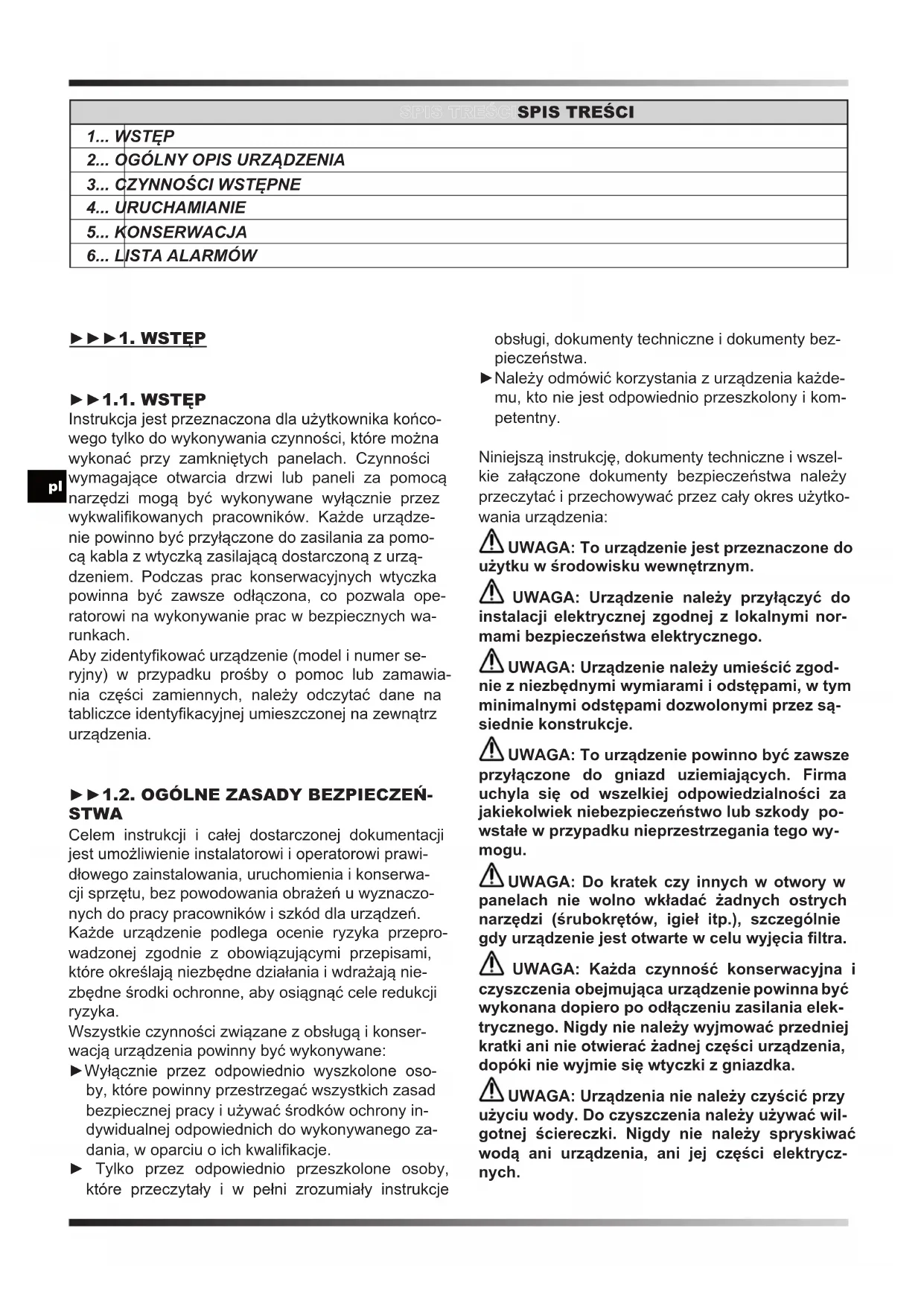 STWA Celem instrukcji i całej dostarczonej dokumentacji jest umożliwienie instalatorowi i operatorowi prawi- dłowego zainstalowania, uruchomienia i konserwa- cji sprzętu, bez powodowania obrażeń u wyznaczo- nych do pracy pracowników i szkód dla urządzeń. Każde urządzenie podlega ocenie ryzyka przepro- wadzonej zgodnie z obowiązującymi przepisami, które określają niezbędne działania i wdrażają nie- zbędne środki ochronne, aby osiągnąć cele redukcji ryzyka. Wszystkie czynności związane z obsługą i konser- wacją urządzenia powinny być wykonywane: ►Wyłącznie przez odpowiednio wyszkolone oso- by, które powinny przestrzegać wszystkich zasad bezpiecznej pracy i używać środków ochrony in- dywidualnej odpowiednich do wykonywanego za- dania, w oparciu o ich kwalikacje. ► Tylko przez odpowiednio przeszkolone osoby, które przeczytały i w pełni zrozumiały instrukcje obsługi, dokumenty techniczne i dokumenty bez- pieczeństwa. ►Należy odmówić korzystania z urządzenia każde- mu, kto nie jest odpowiednio przeszkolony i kom- petentny. Niniejszą instrukcję, dokumenty techniczne i wszel- kie załączone dokumenty bezpieczeństwa należy przeczytać i przechowywać przez cały okres użytko- wania urządzenia: UWAGA: To urządzenie jest przeznaczone do użytku w środowisku wewnętrznym. UWAGA: Urządzenie należy przyłączyć do instalacji elektrycznej zgodnej z lokalnymi nor- mami bezpieczeństwa elektrycznego. UWAGA: Urządzenie należy umieścić zgod- nie z niezbędnymi wymiarami i odstępami, w tym minimalnymi odstępami dozwolonymi przez są- siednie konstrukcje. UWAGA: To urządzenie powinno być zawsze przyłączone do gniazd uziemiających. Firma uchyla się od wszelkiej odpowiedzialności za jakiekolwiek niebezpieczeństwo lub szkody po- wstałe w przypadku nieprzestrzegania tego wy- mogu. UWAGA: Do kratek czy innych w otwory w panelach nie wolno wkładać żadnych ostrych narzędzi (śrubokrętów, igieł itp.), szczególnie gdy urządzenie jest otwarte w celu wyjęcia ltra. UWAGA: Każda czynność konserwacyjna i czyszczenia obejmująca urządzenie powinna być wykonana dopiero po odłączeniu zasilania elek- trycznego. Nigdy nie należy wyjmować przedniej kratki ani nie otwierać żadnej części urządzenia, dopóki nie wyjmie się wtyczki z gniazdka. UWAGA: Urządzenia nie należy czyścić przy użyciu wody. Do czyszczenia należy używać wil- gotnej ściereczki. Nigdy nie należy spryskiwać wodą ani urządzenia, ani jej części elektrycz- nych.