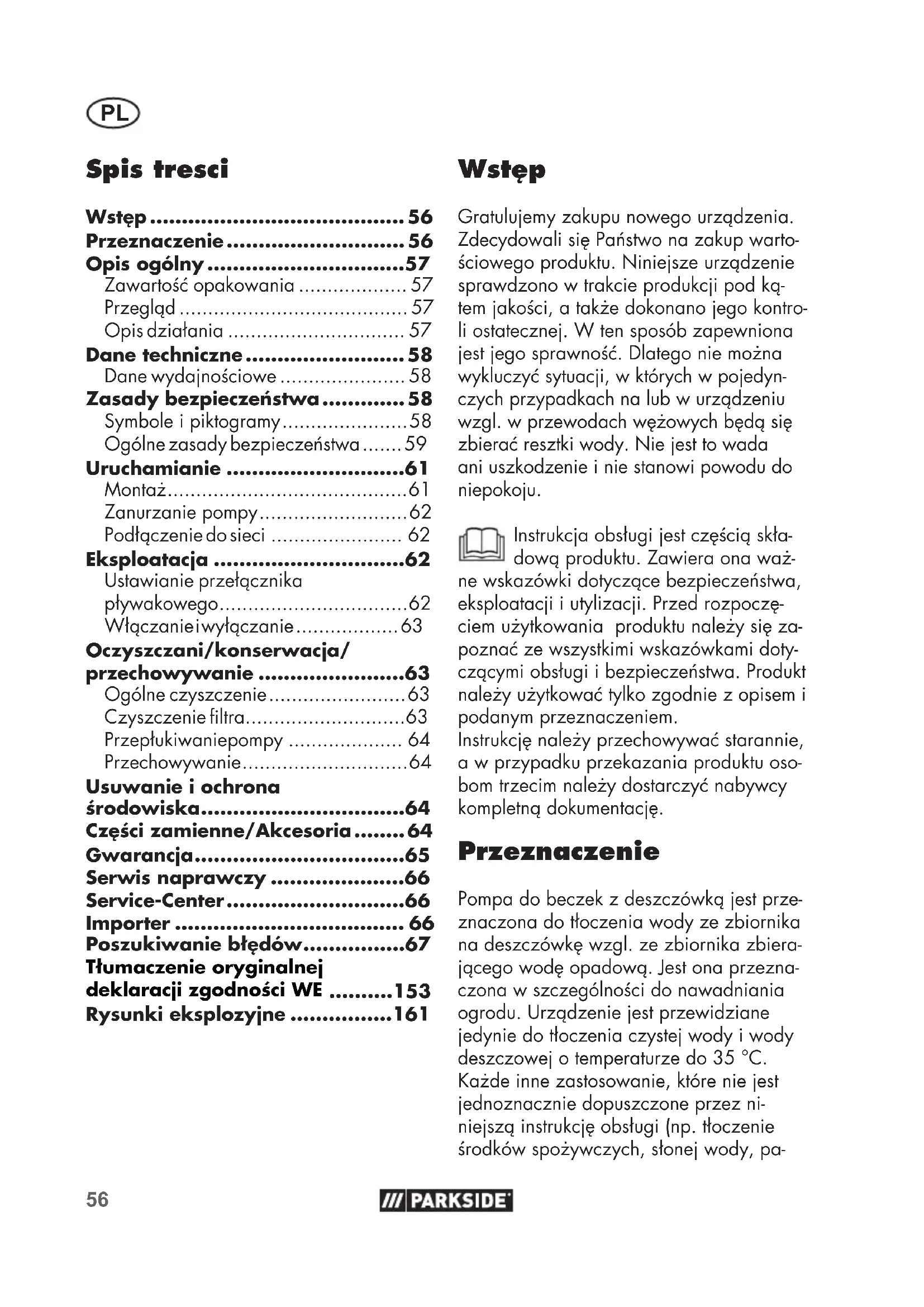- Wstęp Gratulujemy zakupu nowego urządzenia. Zdecydowali się Państwo na zakup warto- ściowego produktu. Niniejsze urządzenie sprawdzono w trakcie produkcji pod ką- tem jakości, a także dokonano jego kontro- li ostatecznej. W ten sposób zapewniona jest jego sprawność. Dlatego nie można wykluczyć sytuacji, w których w pojedyn- czych przypadkach na lub w urządzeniu wzgl. w przewodach wężowych będą się zbierać resztki wody. Nie jest to wada ani uszkodzenie i nie stanowi powodu do niepokoju. Instrukcja obsługi jest częścią skła- dową produktu. Zawiera ona waż- ne wskazówki dotyczące bezpieczeństwa, eksploatacji i utylizacji. Przed rozpoczę- ciem użytkowania produktu należy się za- poznać ze wszystkimi wskazówkami doty- czącymi obsługi i bezpieczeństwa. Produkt należy użytkować tylko zgodnie z opisem i podanym przeznaczeniem. Instrukcję należy przechowywać starannie, a w przypadku przekazania produktu oso- bom trzecim należy dostarczyć nabywcy kompletną dokumentację. Przeznaczenie Pompa do beczek z deszczówką jest prze- znaczona do tłoczenia wody ze zbiornika na deszczówkę wzgl. ze zbiornika zbiera- jącego wodę opadową. Jest ona przezna- czona w szczególności do nawadniania ogrodu. Urządzenie jest przewidziane jedynie do tłoczenia czystej wody i wody deszczowej o temperaturze do 35 °C. Każde inne zastosowanie, które nie jest jednoznacznie dopuszczone przez ni- niejszą instrukcję obsługi (np. tłoczenie środków spożywczych, słonej wody, pa- Spis tresci Wstęp p. 56