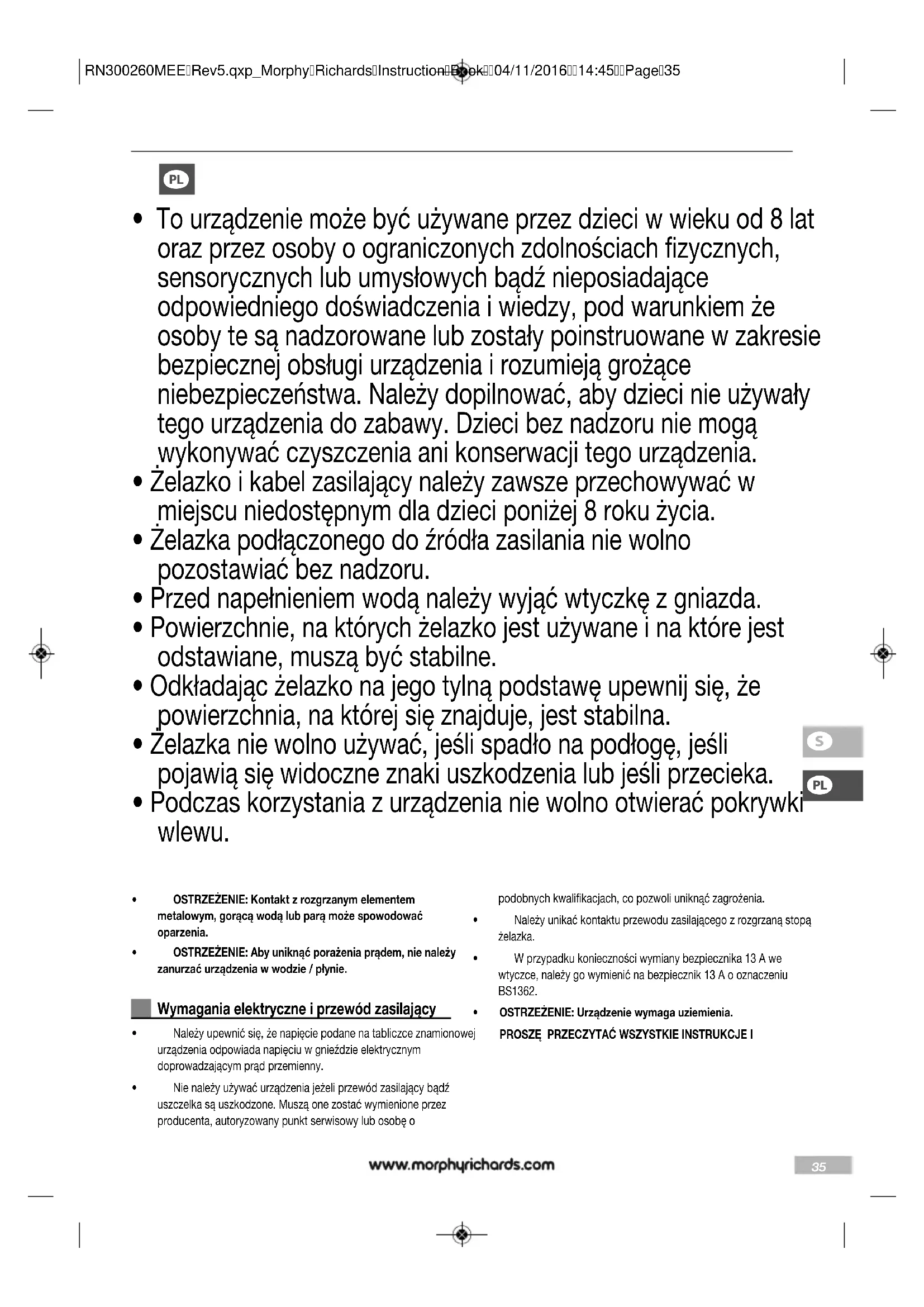 Pierwsza pomoc przy oparzeniach• Natychmiast umieścić poparzone miejsce pod zimną, bieżącą wodą.• Nie zdejmować ubrania.• Szybko skorzystać z pomocy medycznej. RN300260MEERev5.qxp_MorphyRichardsInstructionBook04/11/201614:45Page3637 Przed użyciem Usunąć naklejki ochronne ze stopy żelazka (8). Prasowanie z użyciem pary wodnej