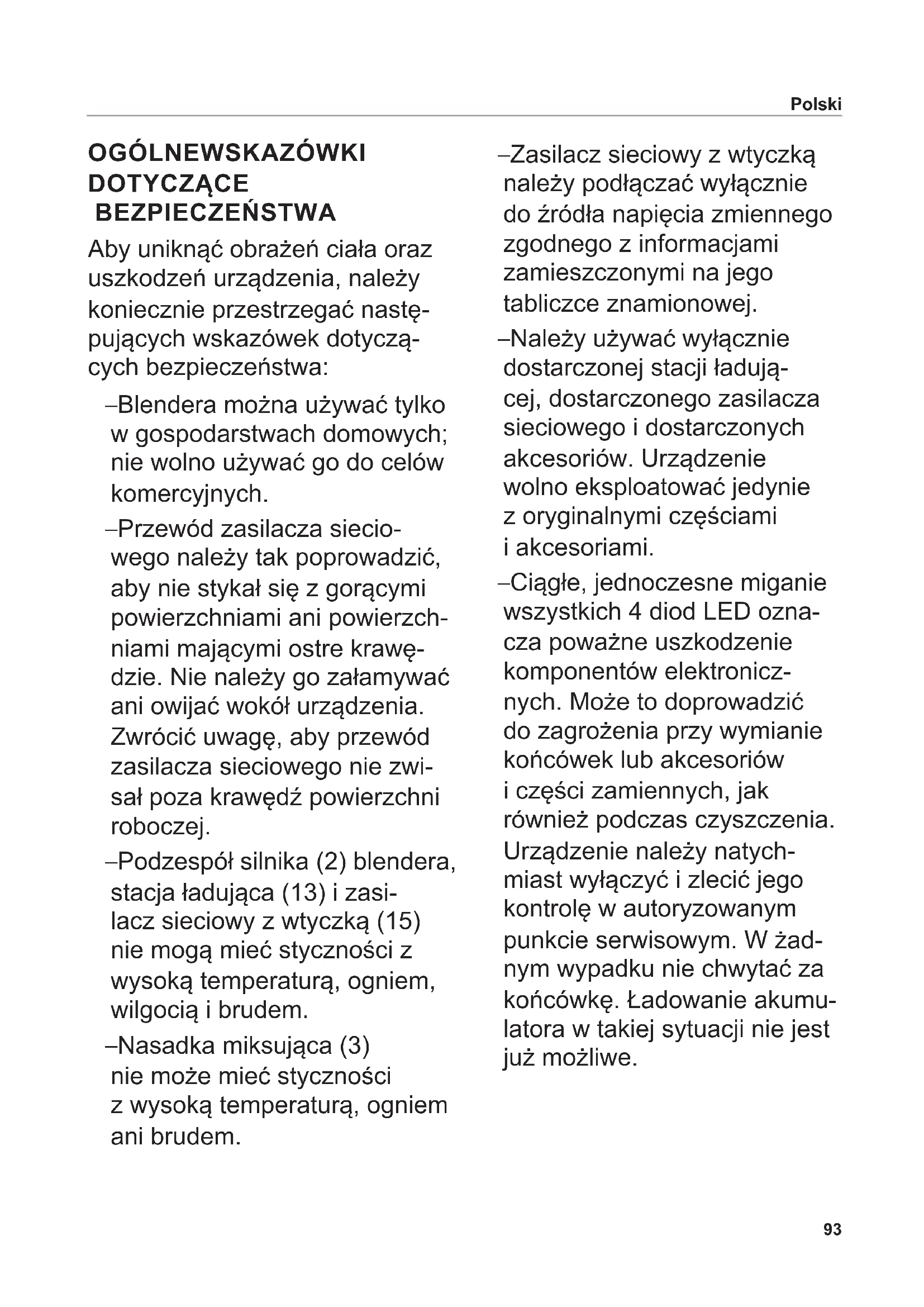 DOTYCZĄCE BEZPIECZEŃSTWA Aby uniknąć obrażeń ciała oraz uszkodzeń urządzenia, należy koniecznie przestrzegać nastę- pujących wskazówek dotyczą- cych bezpieczeństwa: – Blendera można używać tylko w gospodarstwach domowych; nie wolno używać go do celów komercyjnych. – Przewód zasilacza siecio- wego należy tak poprowadzić, aby nie stykał się z gorącymi powierzchniami ani powierzch- niami mającymi ostre krawę- dzie. Nie należy go załamywać ani owijać wokół urządzenia. Zwrócić uwagę, aby przewód zasilacza sieciowego nie zwi- sał poza krawędź powierzchni roboczej. – Podzespół silnika (2) blendera, stacja ładująca (13) i zasi- lacz sieciowy z wtyczką (15) nie mogą mieć styczności z wysoką temperaturą, ogniem, wilgocią i brudem. – Nasadka miksująca (3) nie może mieć styczności z wysoką temperaturą, ogniem ani brudem. – Zasilacz sieciowy z wtyczką należy podłączać wyłącznie do źródła napięcia zmiennego zgodnego z informacjami zamieszczonymi na jego tabliczce znamionowej. – Należy używać wyłącznie dostarczonej stacji ładują- cej, dostarczonego zasilacza sieciowego i dostarczonych akcesoriów. Urządzenie wolno eksploatować jedynie z oryginalnymi częściami i akcesoriami. – Ciągłe, jednoczesne miganie wszystkich 4 diod LED ozna- cza poważne uszkodzenie komponentów elektronicz- nych. Może to doprowadzić do zagrożenia przy wymianie końcówek lub akcesoriów i części zamiennych, jak również podczas czyszczenia. Urządzenie należy natych- miast wyłączyć i zlecić jego kontrolę w autoryzowanym punkcie serwisowym. W żad- nym wypadku nie chwytać za końcówkę. Ładowanie akumu- latora w takiej sytuacji nie jest już możliwe. Polski94 – Urządzenie nie może być używane przez dzieci. Dzieci nie mogą mieć dostępu do urządzenia ani kabla przyłączeniowego. – Urządzenie może być uży- wane przez osoby o ogra- niczonych umiejętnościach zycznych, sensorycznych lub mentalnych bądź osoby z bra- kiem doświadczenia i wiedzy, jeśli mają one zapewniony nadzór lub zostały poinstru- owane w zakresie bezpiecz- nego używania urządzenia i rozumieją zagrożenia zwią- zane z jego używaniem. – Dzieci nie mogą bawić się urządzeniem. – Blendera wolno używać dopiero po włożeniu go do pojemnika z płaskim dnem. – Nie wolno zanurzać blendera w rozdrabniane produkty dalej niż do miejsca połączenia nasadki miksującej z podze- społem silnika. – Nie wolno pozostawiać pra- cującego urządzenia bez nadzoru. – Nie wolno zanurzać całego blendera, stacji ładującej ani zasilacza sieciowego z wtyczką w wodzie lub innych płynach. Nie wolno wysta- wiać urządzenia na deszcz ani w inny sposób narażać go na działanie wilgoci. Jeżeli urządzenie wpadnie do wody, najpierw należy wyciągnąć zasilacz sieciowy z wtyczką z gniazda sieciowego i dopiero potem wyjąć elementy urzą- dzenia z wody. Przed ponow- nym uruchomieniem urzą- dzenia zlecić jego kontrolę w autoryzowanym punkcie serwisowym. – Nie dotykać urządzenia wil- gotnymi rękami. Nie używać urządzenia, stojąc na wil- gotnym lub mokrym podłożu bądź jeżeli urządzenie jest wilgotne albo mokre. Nie uży- wać urządzenia na zewnątrz pomieszczeń. – Nie wolno myć blendera i stacji ładującej w zmywarce do naczyń. – W trakcie pracy blendera nie wolno pod żadnym pozo- rem dotykać końcówek ani wkładać w blender żadnych przedmiotów. Polski95 Niebezpieczeństwo obrażeń – W przypadku zakłóceń w pracy stacji ładującej zawsze trzeba wyciągnąć zasilacz sieciowy z wtyczką z gniazda sieciowego. Należy ciągnąć za wtyczkę, nie za przewód. – Aby uniknąć zagrożeń w przy- padku stwierdzenia uszkodzeń elementów urządzenia, należy je natychmiast wyłączyć. Przed ponownym uruchomie- niem urządzenia zlecić jego kontrolę w autoryzowanym punkcie serwisowym. – Jeżeli zasilacz sieciowy z wtyczką albo jego prze- wód zostaną uszkodzone, konieczna jest wymiana na nowy zasilacz sieciowy z wtyczką, dostępny u produ- centa albo w jego krajowym dziale obsługi klienta. – Przy czyszczeniu blendera, zdejmowaniu albo nakłada- niu końcówek oraz wymianie akcesoriów i części zapaso- wych pod żadnym warunkiem nie wolno go włączać. Trzy- mać palce z daleka od przyci- sków. Nie dotykać ostrzy koń- cówek, ponieważ są bardzo ostre. Polski – Produkty spożywcze mogą w trakcie ich przetwarzania pryskać. W związku z tym w celu uniknięcia oparzeń gorące produkty należy przed obróbką schłodzić. – Jeżeli blender ma zostać użyty w garnku, należy zdjąć garnek z ognia. – Należy dbać o to, aby wycię- cie w końcówce dokładnie przylegało do trzpienia na wale napędowym. Nie wolno używać luźnych, nieprzylega- jących dobrze końcówek — należy zastąpić je nowymi. Zagrożenie wybuchem – Chronić akumulatory przed wysoką temperaturą i ogniem.96 Możliwe wskazania wyświetlacza LED (6) Diody LED Opis Blender w stacji ładującej Nie palą się Akumulator całkowicie naładowany Migają pojedynczo od lewej do prawej Akumulator jest w trakcie ładowania, ostat- nia migająca dioda LED wskazuje poziom naładowania Wszystkie migają razem Błąd obsługi (znajdujące się w stacji ładującej urządzenie jest włączone) Blender poza stacją ładującą Liczba świecących diod LED: 1, 2, 3 lub 4 Urządzenie jest używane, liczba diod LED wskazuje aktualny poziom naładowania Dioda LED 1 miga powoli (1 s świeci / 1 s nie świeci) Akumulator rozładowany Dioda LED 1 miga krótko (0,1 s świeci / 1 s nie świeci) Akumulator uszkodzony (patrz „WYMIANA AKUMULATORA“) Wszystkie 4 diody LED migają powoli (1 s świecą / 1 s nie świecą) Ochrona przeciwprzeciążeniowa (patrz „OPIS DZIAŁANIA“) Polski97 – nóż tnący (10): do rozdrab- niania mięsa i włóknistych owoców oraz warzyw, – końcówka do ubijania (11): do ubijania prod