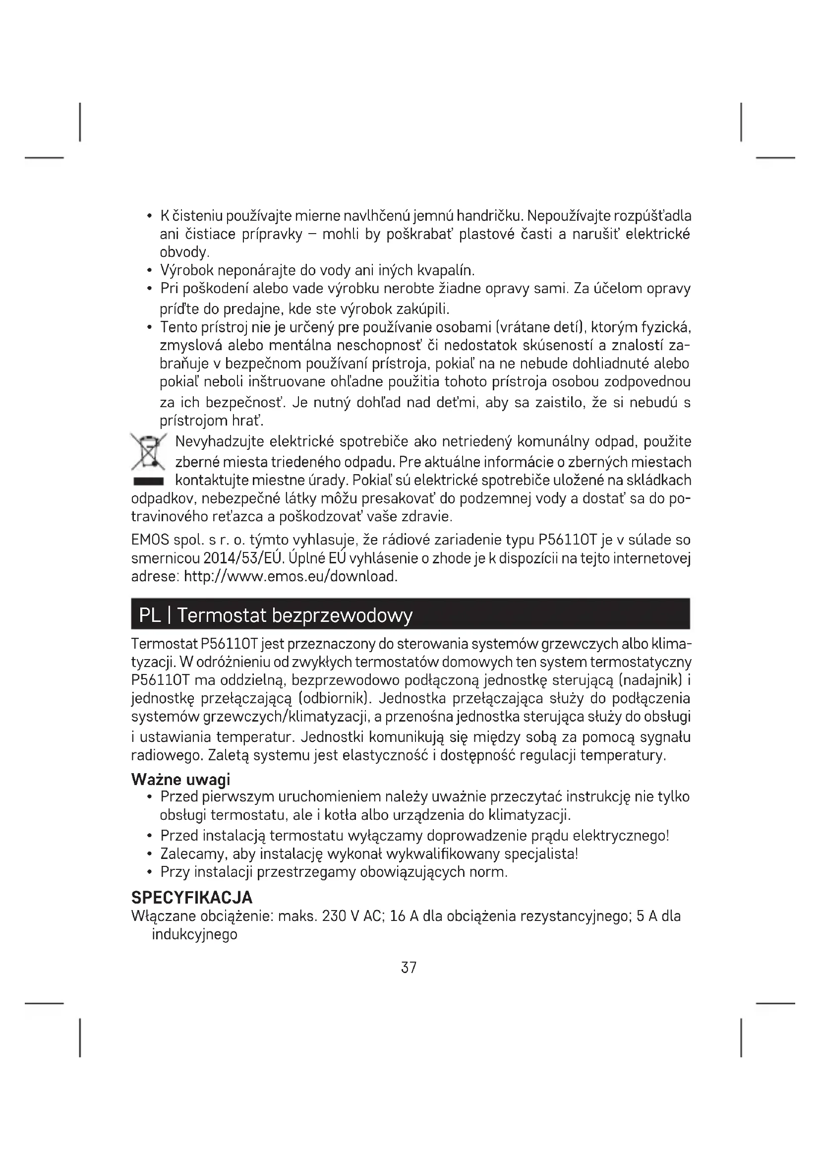 - Tento prístroj nie je určený pre používanie osobami (vrátane detí), ktorým fyzická, zmyslová alebo mentálna neschopnosť či nedostatok skúseností a znalostí za- braňuje v bezpečnom používaní prístroja, pokiaľ na ne nebude dohliadnuté alebo pokiaľ neboli inštruovane ohľadne použitia tohoto prístroja osobou zodpovednou za ich bezpečnosť. Je nutný dohľad nad deťmi, aby sa zaistilo, že si nebudú s prístrojom hrať. Nevyhadzujte elektrické spotrebiče ako netriedený komunálny odpad, použite zberné miesta triedeného odpadu. Pre aktuálne informácie o zberných miestach kontaktujte miestne úrady. Pokiaľ sú elektrické spotrebiče uložené na skládkach odpadkov, nebezpečné látky môžu presakovať do podzemnej vody a dostať sa do po- travinového reťazca a poškodzovať vaše zdravie. EMOS spol. s r. o. týmto vyhlasuje, že rádiové zariadenie typu P5611OT je v súlade so smernicou 2014/53/EÚ. Úplné EÚ vyhlásenie o zhode je k dispozícii na tejto internetovej adrese: http://www.emos.eu/download. PL | Termostat bezprzewodowy Termostat P5611OT jest przeznaczony do sterowania systemów grzewczych albo klima- tyzacji. W odróżnieniu od zwykłych termostatów domowych ten system termostatyczny P5611OT ma oddzielną, bezprzewodowo podłączoną jednostkę sterującą (nadajnik) i jednostkę przełączającą (odbiornik). Jednostka przełączająca służy do podłączenia systemów grzewczych/klimatyzacji, a przenośna jednostka sterująca służy do obsługi i ustawiania temperatur. Jednostki komunikują się między sobą za pomocą sygnału radiowego. Zaletą systemu jest elastyczność i dostępność regulacji temperatury. Ważne uwagi