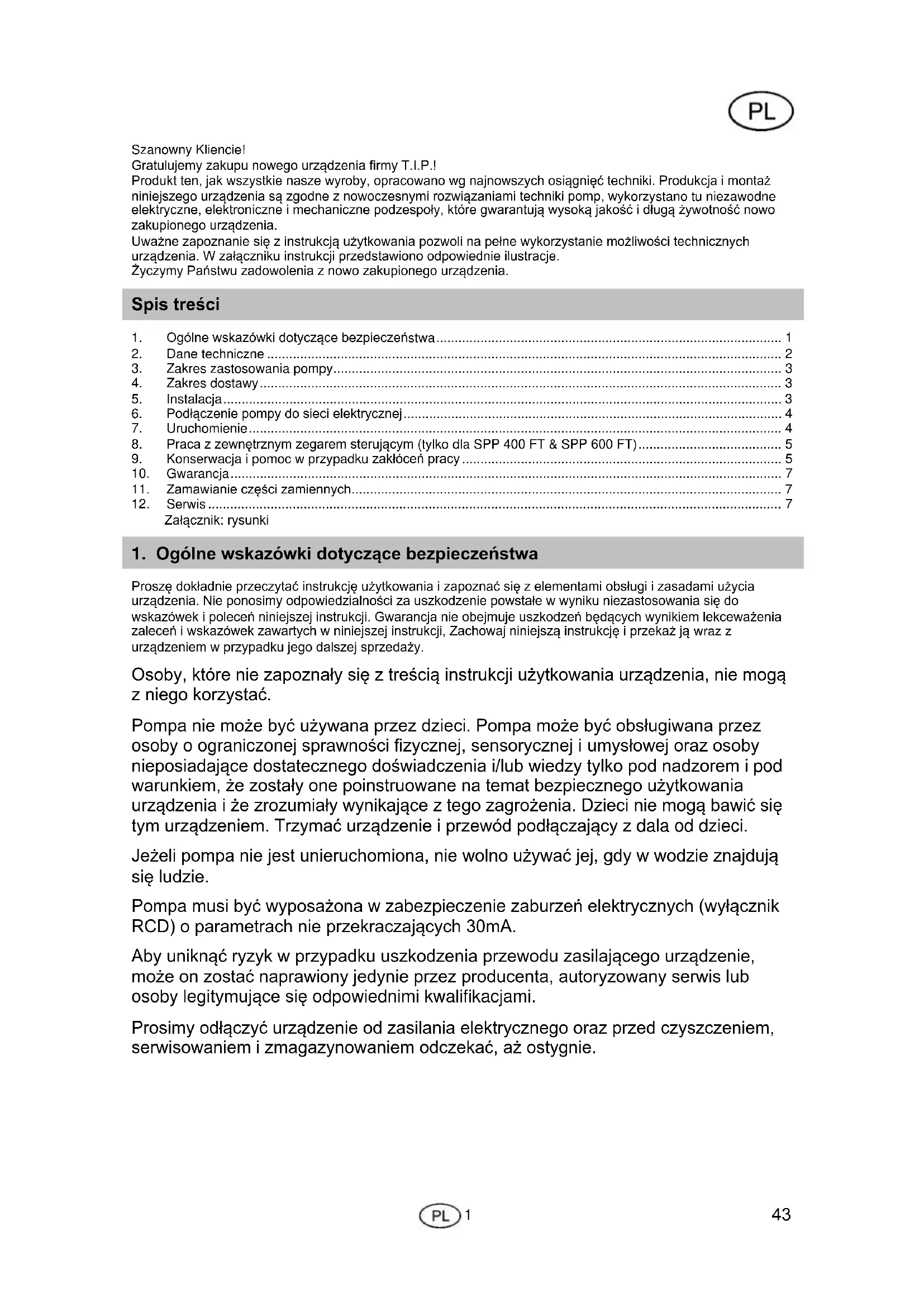 - Szanowny Kliencie! Gratulujemy zakupu nowego urządzenia firmy T.I.P.! Produkt ten, jak wszystkie nasze wyroby, opracowano wg najnowszych osiągnięć techniki. Produkcja i montaż niniejszego urządzenia są zgodne z nowoczesnymi rozwiązaniami techniki pomp, wykorzystano tu niezawodne elektryczne, elektroniczne i mechaniczne podzespoły, które gwarantują wysoką jakość i długą żywotność nowo zakupionego urządzenia. Uważne zapoznanie się z instrukcją użytkowania pozwoli na pełne wykorzystanie możliwości technicznych urządzenia. W załączniku instrukcji przedstawiono odpowiednie ilustracje. Życzymy Państwu zadowolenia z nowo zakupionego urządzenia. Spis treści 1. Ogólne wskazówki dotyczące bezpieczeństwa p. 1