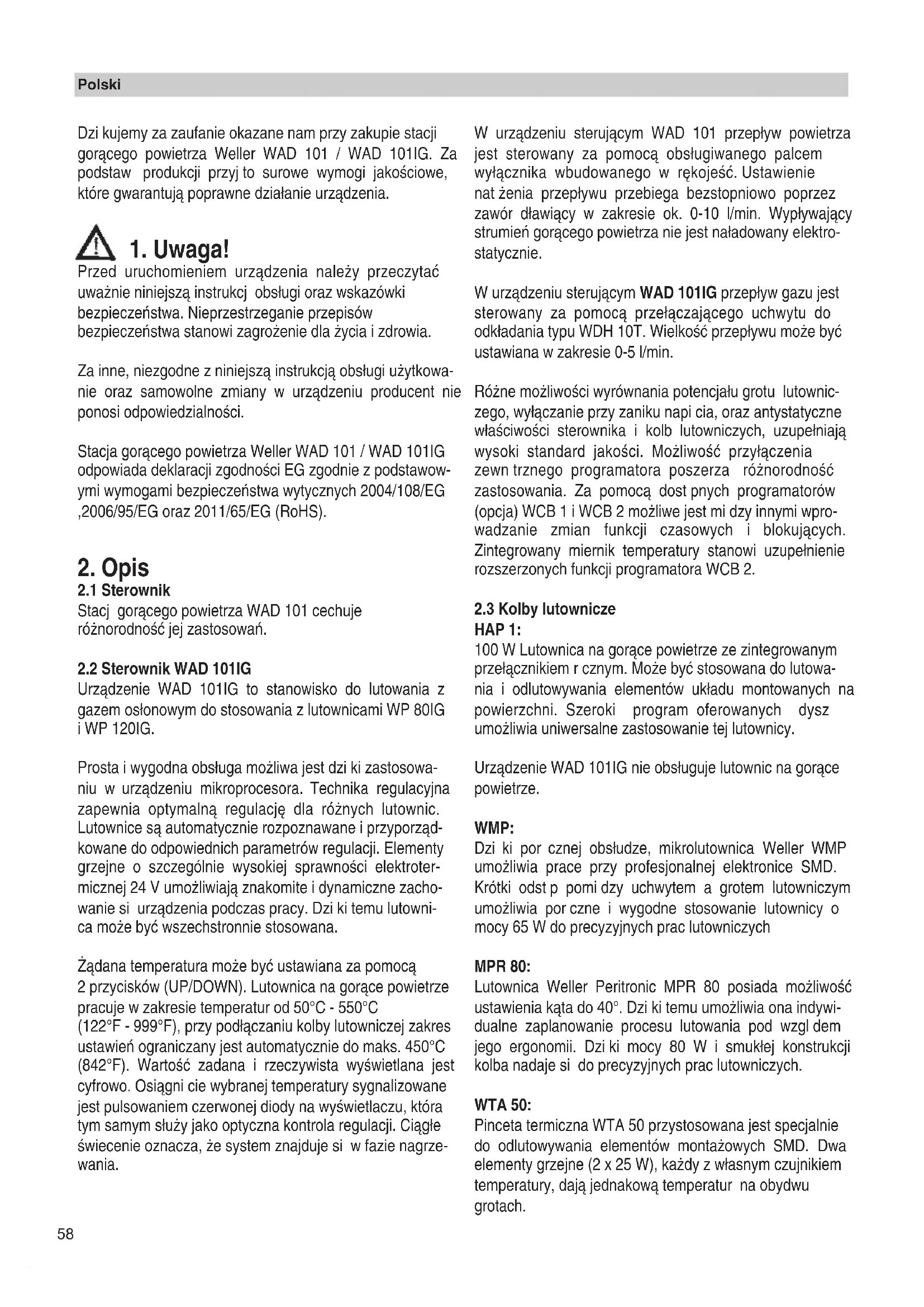 Przed uruchomieniem urzàdzenia nale˝y przeczytaç uwa˝nie niniejszà instrukcj obs∏ugi oraz wskazówki bezpieczeƒstwa. Nieprzestrzeganie przepisów bezpieczeƒstwa stanowi zagro˝enie dla ˝ycia i zdrowia. Za inne, niezgodne z niniejszà instrukcjà obs∏ugi u˝ytkowa- nie oraz samowolne zmiany w urzàdzeniu producent nie ponosi odpowiedzialnoÊci. Stacja goràcego powietrza Weller WAD 101 / WAD 101IG odpowiada deklaracji zgodnoÊci EG zgodnie z podstawow- ymi wymogami bezpieczeƒstwa wytycznych 2004/108/EG ,2006/95/EG oraz 2011/65/EG (RoHS).