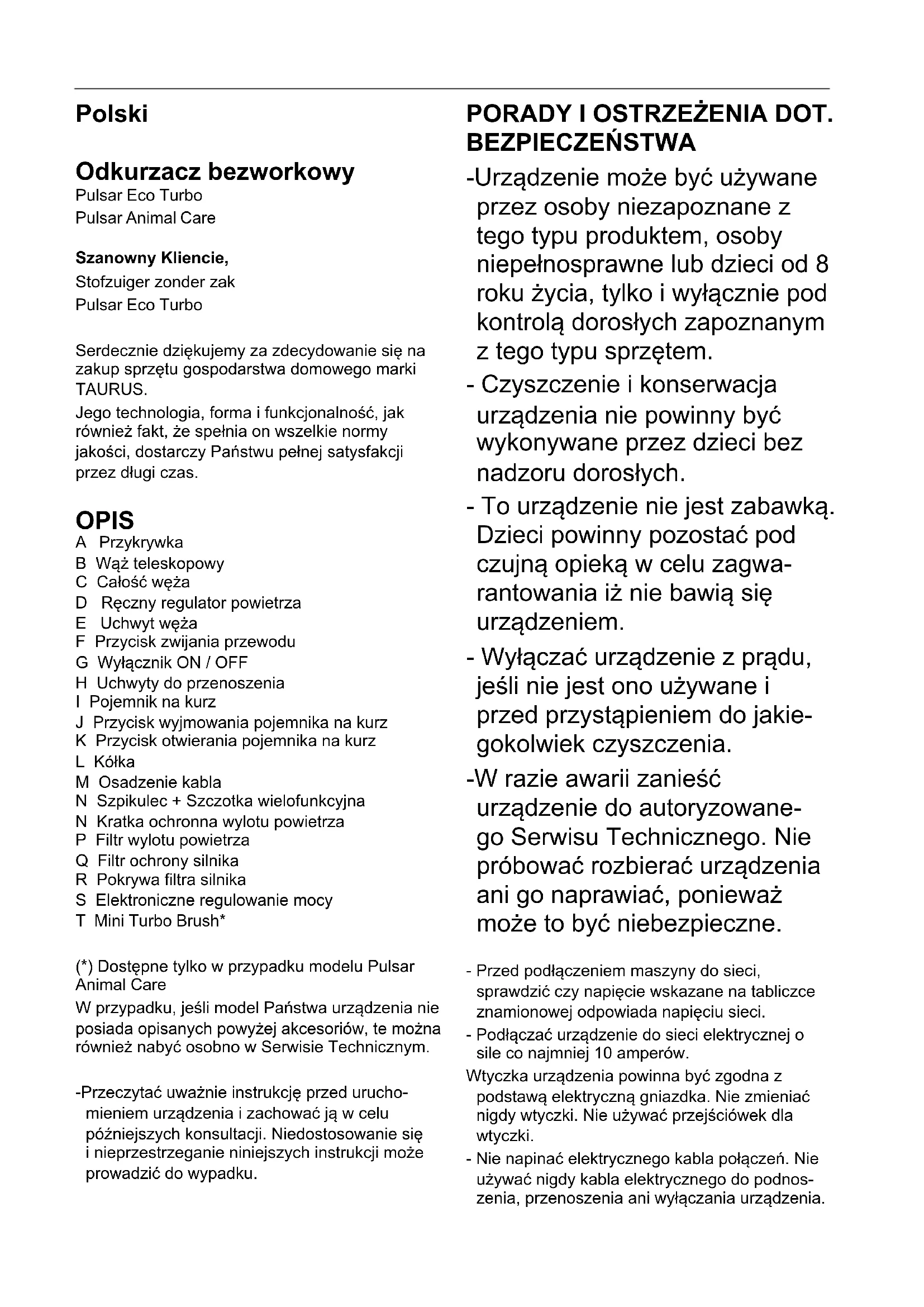 Stof (her)productie klasse C Geluidsniveau 78 dB Nominaal ingangsvermogen 800 WPolski Odkurzacz bezworkowy Pulsar Eco Turbo Pulsar Animal Care Szanowny Kliencie, Stofzuiger zonder zak Pulsar Eco Turbo Serdecznie dziękujemy za zdecydowanie się na zakup sprzętu gospodarstwa domowego marki TAURUS. Jego technologia, forma i funkcjonalność, jak również fakt, że spełnia on wszelkie normy jakości, dostarczy Państwu pełnej satysfakcji przez długi czas. OPIS A Przykrywka B Wąż teleskopowy C Całość węża D Ręczny regulator powietrza E Uchwyt węża F Przycisk zwijania przewodu G Wyłącznik ON / OFF H Uchwyty do przenoszenia I Pojemnik na kurz J Przycisk wyjmowania pojemnika na kurz K Przycisk otwierania pojemnika na kurz L Kółka M Osadzenie kabla N Szpikulec + Szczotka wielofunkcyjna N Kratka ochronna wylotu powietrza P Filtr wylotu powietrza Q Filtr ochrony silnika R Pokrywa ltra silnika S Elektroniczne regulowanie mocy T Mini Turbo Brush* (*) Dostępne tylko w przypadku modelu Pulsar Animal Care W przypadku, jeśli model Państwa urządzenia nie posiada opisanych powyżej akcesoriów, te można również nabyć osobno w Serwisie Technicznym. -Przeczytać uważnie instrukcję przed urucho- mieniem urządzenia i zachować ją w celu późniejszych konsultacji. Niedostosowanie się i nieprzestrzeganie niniejszych instrukcji może prowadzić do wypadku. PORADY I OSTRZEŻENIA DOT. BEZPIECZEŃSTWA -Urządzenie może być używane przez osoby niezapoznane z tego typu produktem, osoby niepełnosprawne lub dzieci od 8 roku życia, tylko i wyłącznie pod kontrolą dorosłych zapoznanym z tego typu sprzętem. - Czyszczenie i konserwacja urządzenia nie powinny być wykonywane przez dzieci bez nadzoru dorosłych. - To urządzenie nie jest zabawką. Dzieci powinny pozostać pod czujną opieką w celu zagwa- rantowania iż nie bawią się urządzeniem. - Wyłączać urządzenie z prądu, jeśli nie jest ono używane i przed przystąpieniem do jakie- gokolwiek czyszczenia. -W razie awarii zanieść urządzenie do autoryzowane- go Serwisu Technicznego. Nie próbować rozbierać urządzenia ani go naprawiać, ponieważ może to być niebezpieczne. - Przed podłączeniem maszyny do sieci, sprawdzić czy napięcie wskazane na tabliczce znamionowej odpowiada napięciu sieci. - Podłączać urządzenie do sieci elektrycznej o sile co najmniej 10 amperów. Wtyczka urządzenia powinna być zgodna z podstawą elektryczną gniazdka. Nie zmieniać nigdy wtyczki. Nie używać przejściówek dla wtyczki. - Nie napinać elektrycznego kabla połączeń. Nie używać nigdy kabla elektrycznego do podnos- zenia, przenoszenia ani wyłączania urządzenia.- Nie dotykać wtyczki mokrymi rękoma. - Nie używać urządzenia, gdy kabel elektryczny lub wtyczka jest uszkodzona. - Jeśli popęka jakiś element obudowy urządzenia, natychmiast wyłączyć urządzenie z prądu, aby uniknąć porażenia prądem. - Nie używać urządzenia, jeśli upadło lub jeśli występują widoczne oznaki uszkodzenia lub wycieki. UŻYWANIE I KONSERWACJA: - Nie stosować urządzenia, jeśli akcesoria lub części podlegające zużyciu nie są odpowiednio zamocowane. - Nie używać urządzenia, jeśli jego akcesoria lub ltry nie są odpowiednio dopasowane. - Nie używać odkurzacza do zbierania wody ani innych cieczy. - Nie używać urządzenia, jeśli nie działa przycisk włączania ON/OFF. - Aby przenosić urządzenia, należy używać uchwytów. - Urządzenie to zaprojektowane zostało wyłącznie do użytku domowego, a nie do użytku profesjo- nalnego czy przemysłowego. - Przechowywać urządzenie w miejsce niedostępnym dla dzieci i/lub osób o ogranic- zonych zdolnościach zycznych, dotykowych lub mentalnych oraz nie posiadających doświadczenia lub znajomości tego typu urządzeń. - Sprawdzać, czy kratki wentylacyjne urządzenia nie są zapchane kurzem, zanieczyszczeniami czy innymi przedmiotami. - Urządzenie i jego akcesoria należy używać zgo- dnie z powyższą instrukcją obsługi, używanie go do innych celów niż opisane może powodować niebezpieczeństwo. Nie należy używać go do innych celów niż przeznaczony, gdyż może to spowodować zagrożenie dla zdrowia. - Nie używać na powierzchniach, które mogę zawierać metalote elementy jak na przykład gwoździe. - Nie odkurzać nigdy odkurzaczem przedmiotów żarzących się czy tnących (niedopałki, popiół, gwoździe…). SERWIS TECHNICZNY: - Wszelkie niewłaściwe użycie lub niezgod- ne z instrukcją obsługi może doprowadzić do niebezpieczeństwa, anulując przy tym gwarancję i odpowiedzialność producenta.