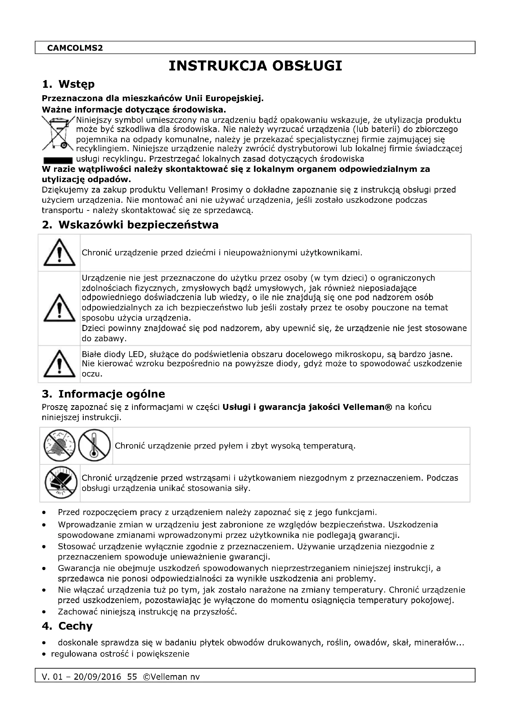 Właścicielem praw autorskich do niniejszej instrukcji jest firma Velleman nv. Wszelkie prawa są zastrzeżone na całym świecie. Żadna część niniejszej instrukcji nie może być kopiowana, powielana, tłumaczona ani przenoszona na jakikolwiek nośnik elektroniczny (lub w inny sposób) bez wcześniejszej pisemnej zgody właściciela praw autorskich.CAMCOLMS2