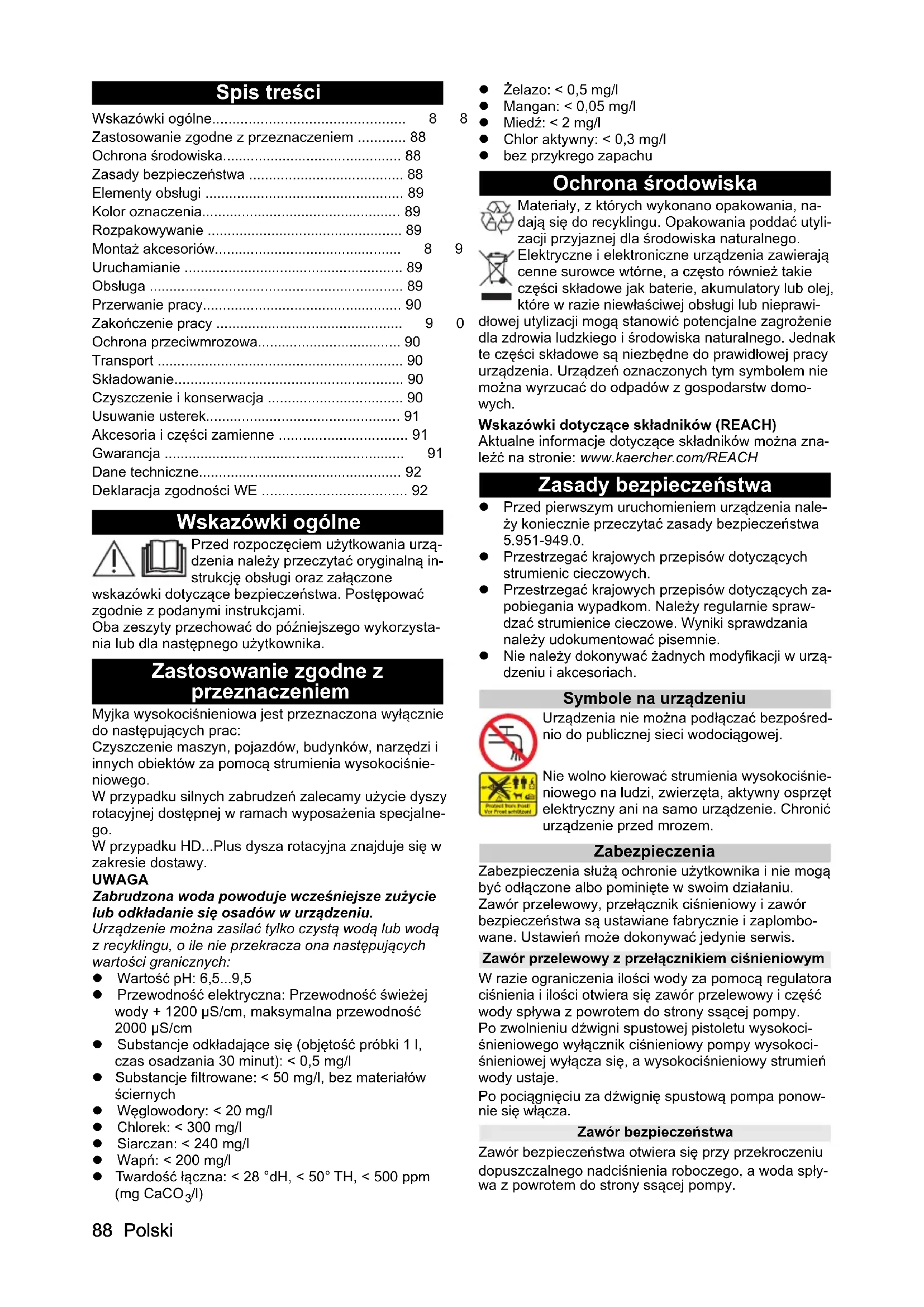 - /l) Żelazo: < 0,5 mg/l Mangan: < 0,05 mg/l Miedź: < 2 mg/l Chlor aktywny: < 0,3 mg/l bez przykrego zapachu Ochrona środowiska Materiały, z których wykonano opakowania, na- dają się do recyklingu. Opakowania poddać utyli- zacji przyjaznej dla środowiska naturalnego. Elektryczne i elektroniczne urządzenia zawierają cenne surowce wtórne, a często również takie części składowe jak baterie, akumulatory lub olej, które w razie niewłaściwej obsługi lub nieprawi- dłowej utylizacji mogą stanowić potencjalne zagrożenie dla zdrowia ludzkiego i środowiska naturalnego. Jednak te części składowe są niezbędne do prawidłowej pracy urządzenia. Urządzeń oznaczonych tym symbolem nie można wyrzucać do odpadów z gospodarstw domo- wych. Wskazówki dotyczące składników (REACH) Aktualne informacje dotyczące składników można zna- leźć na stronie: www.kaercher.com/REACH Zasady bezpieczeństwa Przed pierwszym uruchomieniem urządzenia nale- ży koniecznie przeczytać zasady bezpieczeństwa 5.951-949.0. Przestrzegać krajowych przepisów dotyczących strumienic cieczowych. Przestrzegać krajowych przepisów dotyczących za- pobiegania wypadkom. Należy regularnie spraw- dzać strumienice cieczowe. Wyniki sprawdzania należy udokumentować pisemnie. Nie należy dokonywać żadnych modyfikacji w urzą- dzeniu i akcesoriach. Symbole na urządzeniu Urządzenia nie można podłączać bezpośred- nio do publicznej sieci wodociągowej. Nie wolno kierować strumienia wysokociśnie- niowego na ludzi, zwierzęta, aktywny osprzęt elektryczny ani na samo urządzenie. Chronić urządzenie przed mrozem. Zabezpieczenia Zabezpieczenia służą ochronie użytkownika i nie mogą być odłączone albo pominięte w swoim działaniu. Zawór przelewowy, przełącznik ciśnieniowy i zawór bezpieczeństwa są ustawiane fabrycznie i zaplombo- wane. Ustawień może dokonywać jedynie serwis. Zawór przelewowy z przełącznikiem ciśnieniowym W razie ograniczenia ilości wody za pomocą regulatora ciśnienia i ilości otwiera się zawór przelewowy i część wody spływa z powrotem do strony ssącej pompy. Po zwolnieniu dźwigni spustowej pistoletu wysokoci- śnieniowego wyłącznik ciśnieniowy pompy wysokoci- śnieniowej wyłącza się, a wysokociśnieniowy strumień wody ustaje. Po pociągnięciu za dźwignię spustową pompa ponow- nie się włącza. Zawór bezpieczeństwa Zawór bezpieczeństwa otwiera się przy przekroczeniu dopuszczalnego nadciśnienia roboczego, a woda spły- wa z powrotem do strony ssącej pompy. Wskazówki ogólne p. 88
