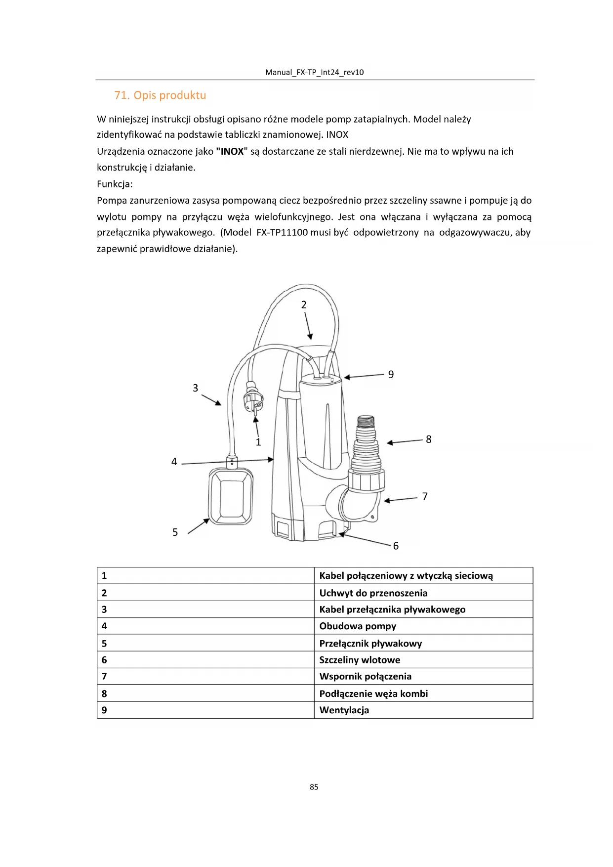 W niniejszej instrukcji obsługi opisano różne modele pomp zatapialnych. Model należy zidentyfikować na podstawie tabliczki znamionowej. INOX Urządzenia oznaczone jako "INOX" są dostarczane ze stali nierdzewnej. Nie ma to wpływu na ich konstrukcję i działanie. Funkcja: Pompa zanurzeniowa zasysa pompowaną ciecz bezpośrednio przez szczeliny ssawne i pompuje ją do wylotu pompy na przyłączu węża wielofunkcyjnego. Jest ona włączana i wyłączana za pomocą przełącznika pływakowego. (Model FX-TP11100 musi być odpowietrzony na odgazowywaczu, aby zapewnić prawidłowe działanie).