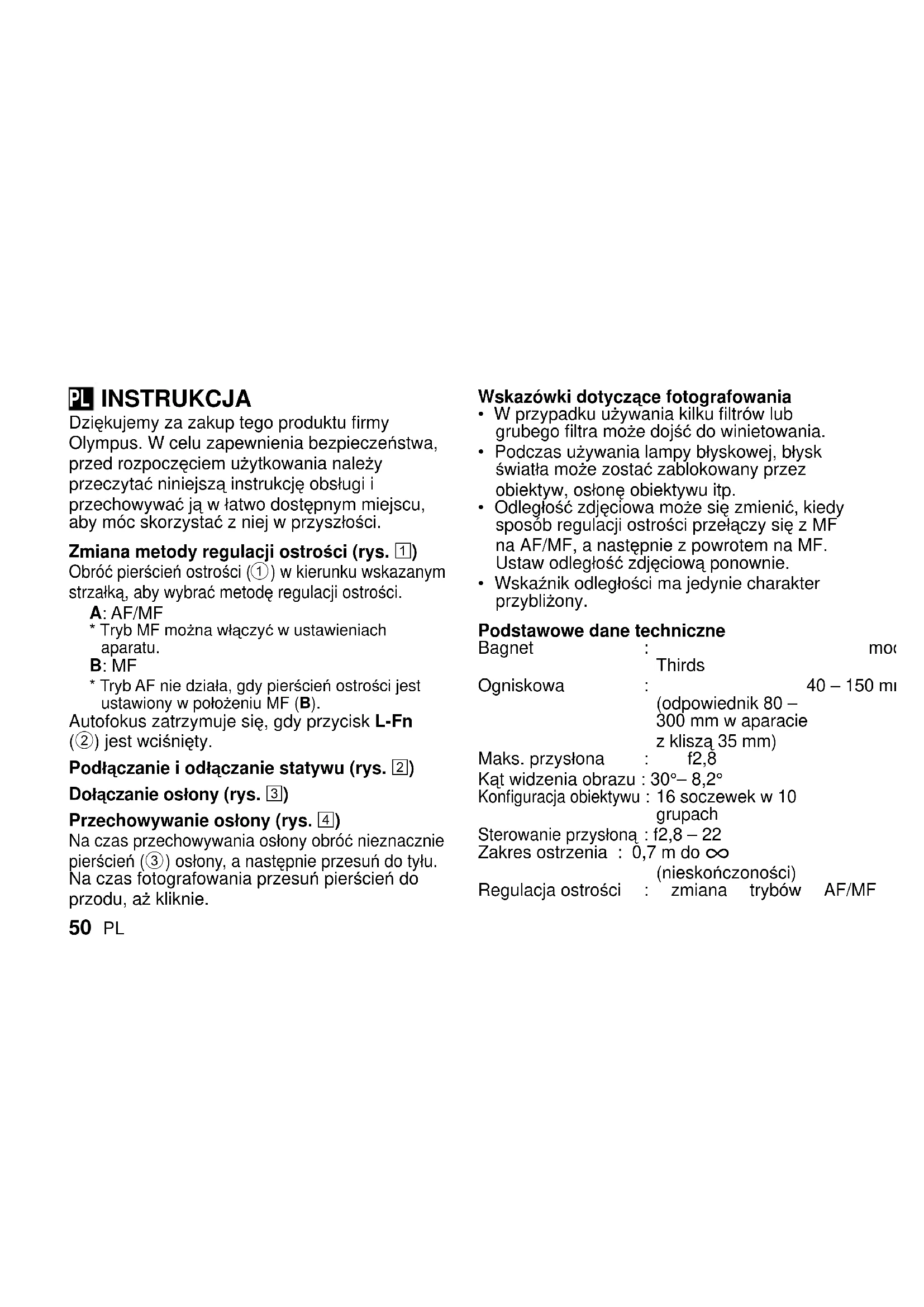 ED 40150mm F2.8 PRO - Obiektyw OLYMPUS - Bezpłatna instrukcja obsługi