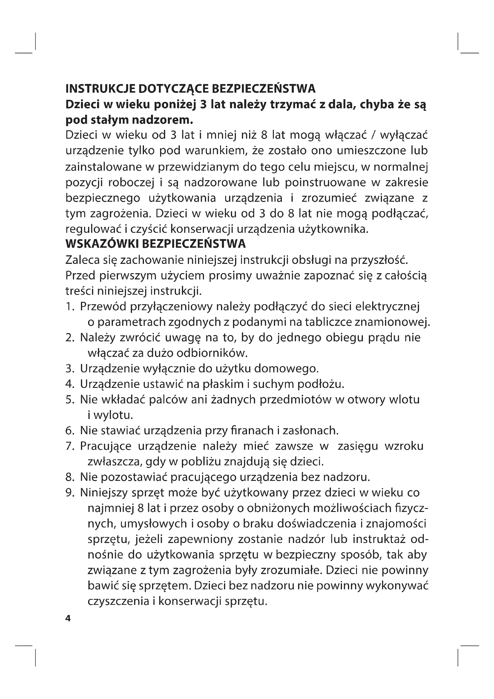 miejscu. OCHRONA ŚRODOWISKA - Urządzenie jest zbudowane zmateriałów, które mogą być poddane ponownemu przetwarzaniu lub recyklingowi, - należy je przekazać do odpowiedniego punktu, który zajmuje się zbieraniem i recyklingiem urządzeń elektrycznych ielektronicznych. GWARANCJA - urządzenie przeznaczone jest do użytku prywatnego wgospodarstwie domowym, - nie może być używane do celów zawodowych, - gwarancja traci ważność wprzypadku nieprawidłowej obsługi.9 SAFETY INSTRUCTIONS Before rst use, please thoroughly read the entire manual.