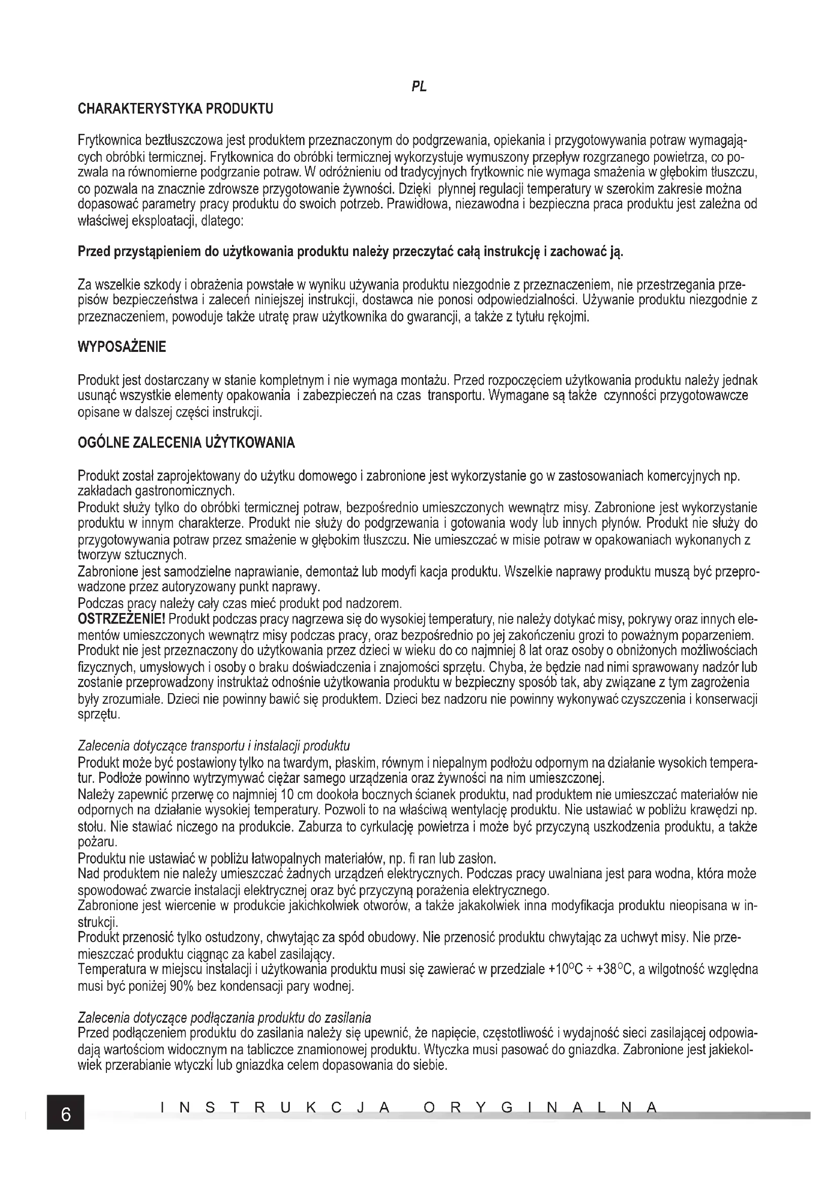 CHARAKTERYSTYKA PRODUKTU Frytkownica beztłuszczowa jest produktem przeznaczonym do podgrzewania, opiekania i przygotowywania potraw wymagają- cych obróbki termicznej. Frytkownica do obróbki termicznej wykorzystuje wymuszony przepływ rozgrzanego powietrza, co po- zwala na równomierne podgrzanie potraw. W odróżnieniu od tradycyjnych frytkownic nie wymaga smażenia w głębokim tłuszczu, co pozwala na znacznie zdrowsze przygotowanie żywności. Dzięki płynnej regulacji temperatury w szerokim zakresie można dopasować parametry pracy produktu do swoich potrzeb. Prawidłowa, niezawodna i bezpieczna praca produktu jest zależna od właściwej eksploatacji, dlatego: Przed przystąpieniem do użytkowania produktu należy przeczytać całą instrukcję i zachować ją. Za wszelkie szkody i obrażenia powstałe w wyniku używania produktu niezgodnie z przeznaczeniem, nie przestrzegania prze- pisów bezpieczeństwa i zaleceń niniejszej instrukcji, dostawca nie ponosi odpowiedzialności. Używanie produktu niezgodnie z przeznaczeniem, powoduje także utratę praw użytkownika do gwarancji, a także z tytułu rękojmi. WYPOSAŻENIE Produkt jest dostarczany w stanie kompletnym i nie wymaga montażu. Przed rozpoczęciem użytkowania produktu należy jednak usunąć wszystkie elementy opakowania i zabezpieczeń na czas transportu. Wymagane są także czynności przygotowawcze opisane w dalszej części instrukcji.