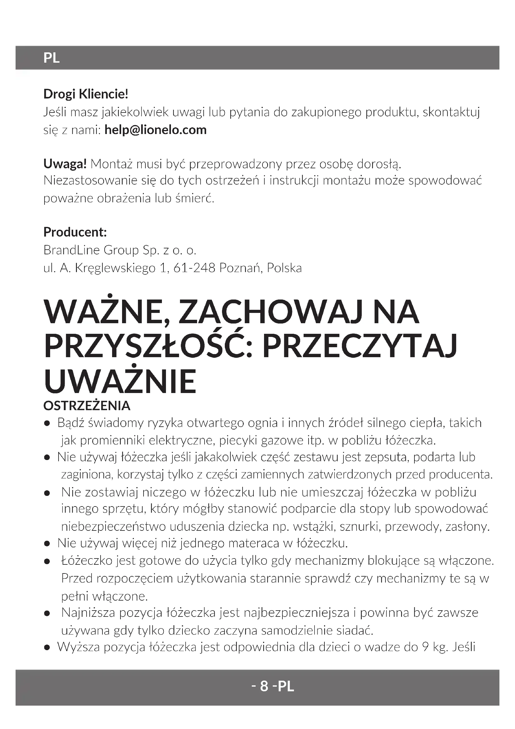 the folded cot into the bag (see g. 10).If thes disassembly is unsuccessful, repeat the whole process again unl the product is folded. Cleaning Wipe the product with a damp cloth, then allow to dry. Do not dry clean and do not use causc agents. Do not dry mechanically, do not iron. The product has been tested and meets all the requirements of the: EN 716-1:2017+AC:2019. The pictures in this manual are for illustrave purposes only. Therefore, they may dier from the actual product.‑ 8 ‑PL Drogi Kliencie! Jeśli masz jakiekolwiek uwagi lub pytania do zakupionego produktu, skontaktuj się z nami: help@lionelo.com Uwaga! Montaż musi być przeprowadzony przez osobę dorosłą. Niezastosowanie się do tych ostrzeżeń i instrukcji montażu może spowodować poważne obrażenia lub śmierć. Producent: BrandLine Group Sp. z o. o. ul. A. Kręglewskiego 1, 61-248 Poznań, Polska
