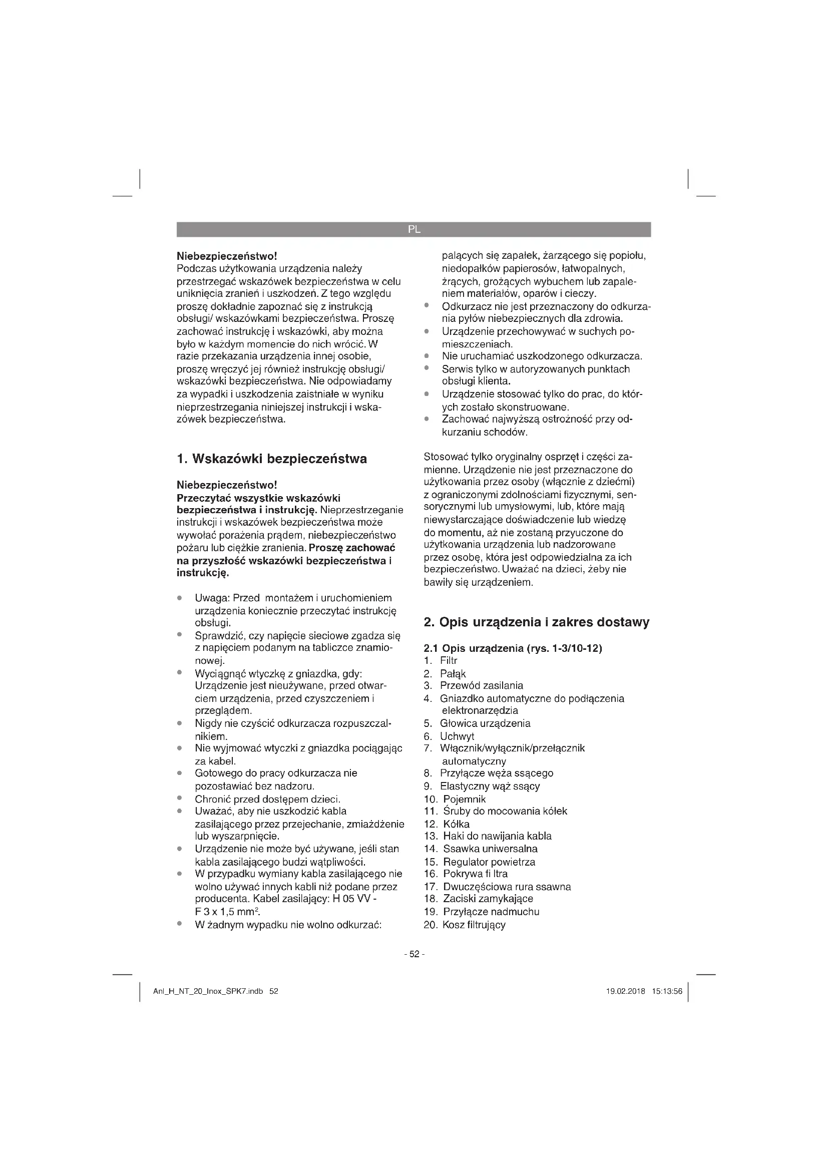 Montaż kółek (rys. 4/12) Zamontować kółka (12) zgodnie ze wskazówkami na rys. 4. Montaż pałąka do nawijania przewodu i węża ssącego (rys. 5/2) Zamontować pałąk do nawijania przewodu i węża ssącego tak jak pokazano na rys. 5. Po zakończeniu pracy z urządzeniem można nawinąć przewód i wąż ssący na pałąk. Anl_H_NT_20_Inox_SPK7.indb 53Anl_H_NT_20_Inox_SPK7.indb 53 19.02.2018 15:13:5619.02.2018 15:13:56PL