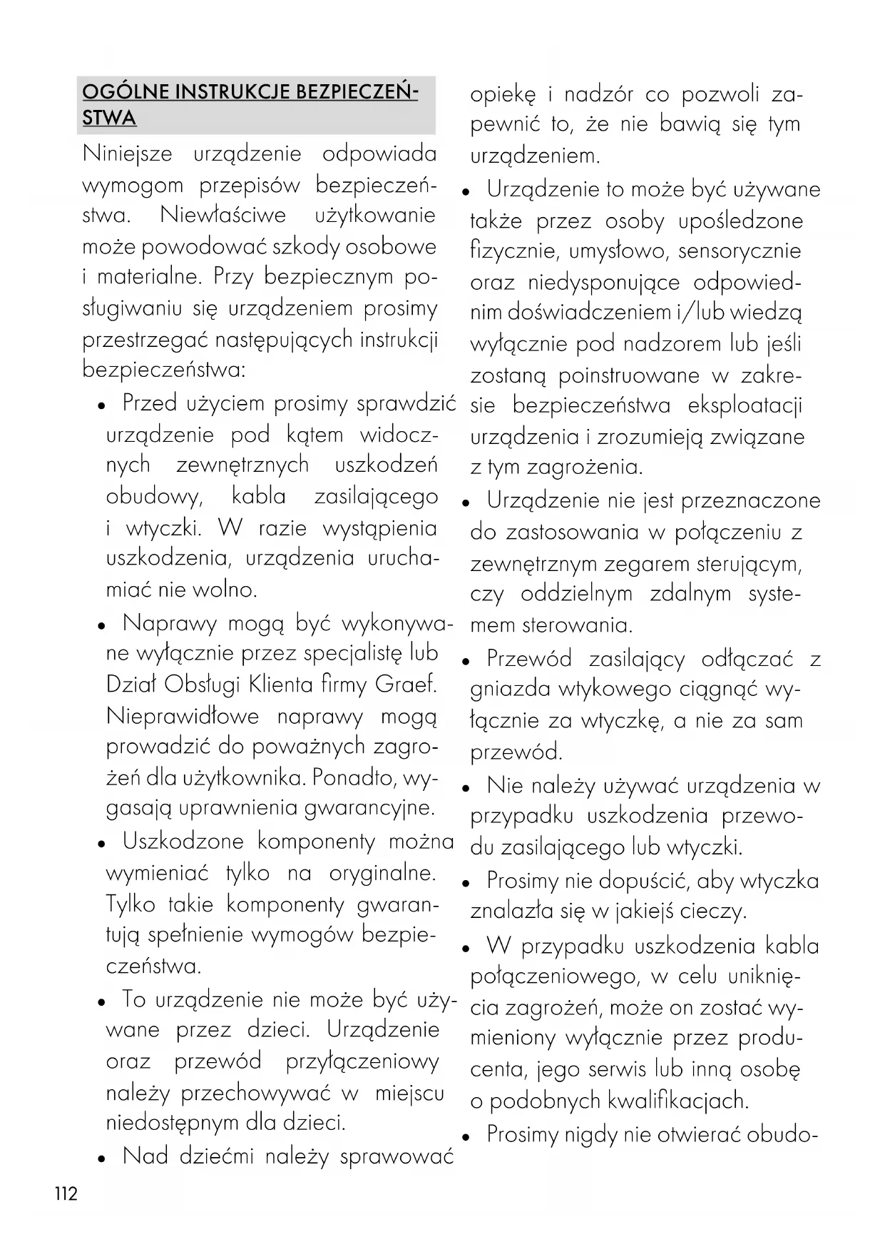 STWA Niniejsze urządzenie odpowiada wymogom przepisów bezpieczeń- stwa. Niewłaściwe użytkowanie może powodować szkody osobowe i materialne. Przy bezpiecznym po- sługiwaniu się urządzeniem prosimy przestrzegać następujących instrukcji bezpieczeństwa: ● Przed użyciem prosimy sprawdzić urządzenie pod kątem widocz- nych zewnętrznych uszkodzeń obudowy, kabla zasilającego i wtyczki. W razie wystąpienia uszkodzenia, urządzenia urucha- miać nie wolno. ● Naprawy mogą być wykonywa- ne wyłącznie przez specjalistę lub Dział Obsługi Klienta firmy Graef. Nieprawidłowe naprawy mogą prowadzić do poważnych zagro- żeń dla użytkownika. Ponadto, wy- gasają uprawnienia gwarancyjne. ● Uszkodzone komponenty można wymieniać tylko na oryginalne. Tylko takie komponenty gwaran- tują spełnienie wymogów bezpie- czeństwa. ● To urządzenie nie może być uży- wane przez dzieci. Urządzenie oraz przewód przyłączeniowy należy przechowywać w miejscu niedostępnym dla dzieci. ● Nad dziećmi należy sprawować opiekę i nadzór co pozwoli za- pewnić to, że nie bawią się tym urządzeniem. ● Urządzenie to może być używane także przez osoby upośledzone fizycznie, umysłowo, sensorycznie oraz niedysponujące odpowied- nim doświadczeniem i/lub wiedzą wyłącznie pod nadzorem lub jeśli zostaną poinstruowane w zakre- sie bezpieczeństwa eksploatacji urządzenia i zrozumieją związane z tym zagrożenia. ● Urządzenie nie jest przeznaczone do zastosowania w połączeniu z zewnętrznym zegarem sterującym, czy oddzielnym zdalnym syste- mem sterowania. ● Przewód zasilający odłączać z gniazda wtykowego ciągnąć wy- łącznie za wtyczkę, a nie za sam przewód. ● Nie należy używać urządzenia w przypadku uszkodzenia przewo- du zasilającego lub wtyczki. ● Prosimy nie dopuścić, aby wtyczka znalazła się w jakiejś cieczy. ● W przypadku uszkodzenia kabla połączeniowego, w celu uniknię- cia zagrożeń, może on zostać wy- mieniony wyłącznie przez produ- centa, jego serwis lub inną osobę o podobnych kwalifikacjach. ● Prosimy nigdy nie otwierać obudo-113