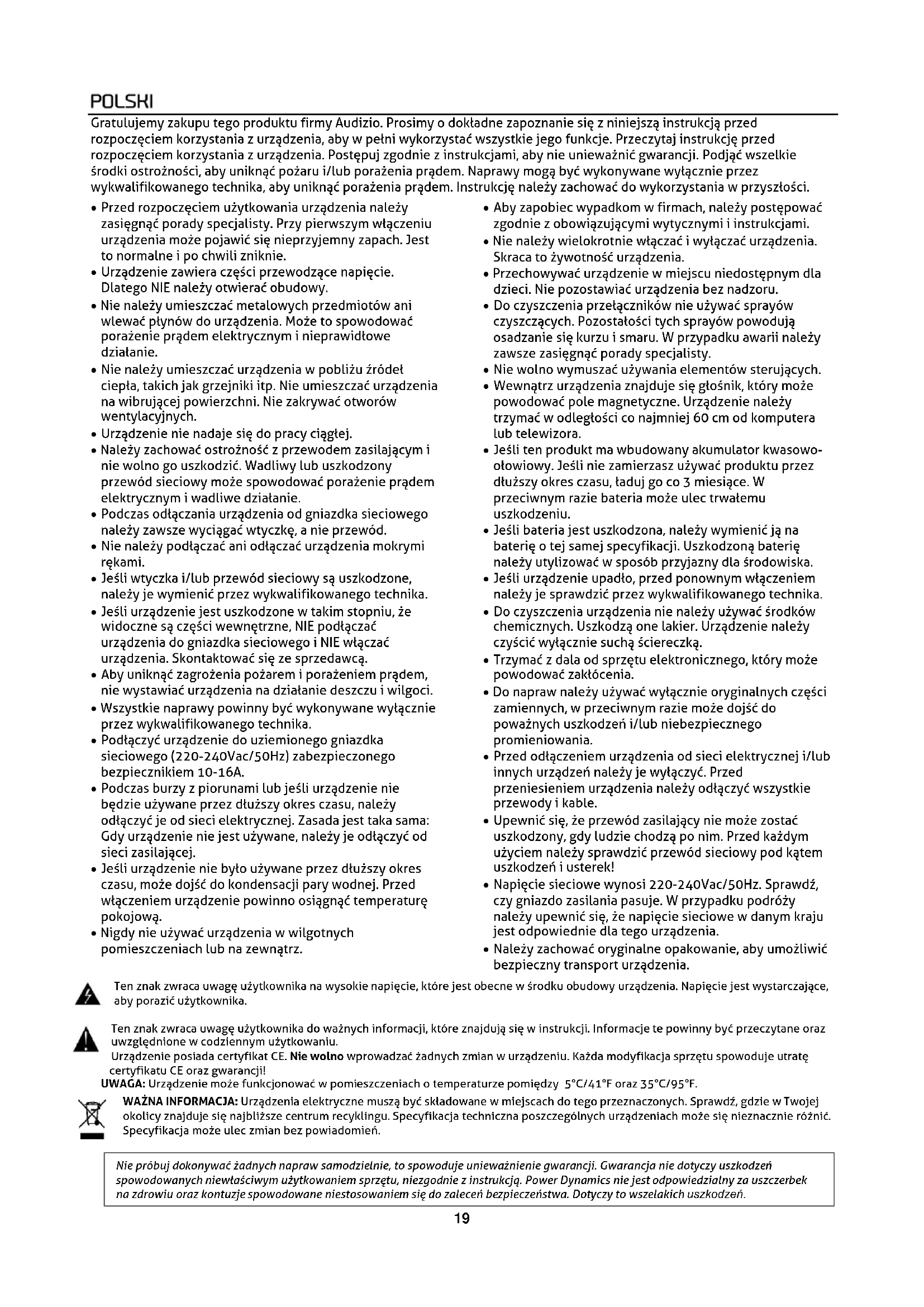 Nie próbuj dokonywać żadnych napraw samodzielnie, to spowoduje unieważnienie gwarancji. Gwarancja nie dotyczy uszkodzeń spowodowanych niewłaściwym użytkowaniem sprzętu, niezgodnie z instrukcją. Power Dynamics nie jest odpowiedzialny za uszczerbek na zdrowiu oraz kontuzje spowodowane niestosowaniem się do zaleceń bezpieczeństwa. Dotyczy to wszelakich uszkodzeń.