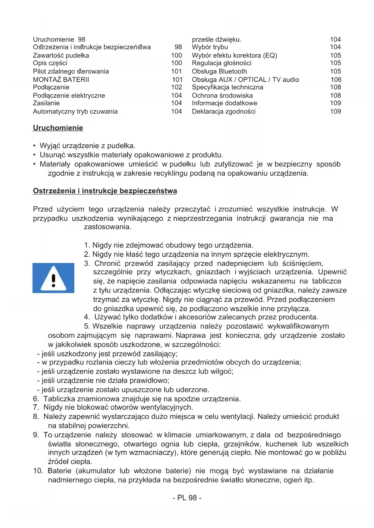 nadmiernego ciepła, na przykłada na bezpośrednie światło słoneczne, ogień itp. Uruchomienie 98 Orzeżenia i inrukcje bezpieczeńwa 98 Zawartość pudełka 100 Opis części 100 Pilot zdalnego erowania 101 MONTAŻ BATERII 101 Podłączenie 102 Podłączenie elektryczne 104 Zasilanie 104 Automatyczny tryb czuwania 104 prześle dźwięku. 104 Wybór trybu 104 Wybór efektu korektora (EQ) 105 Regulacja głośności 105 Obsługa Bluetooth 105 Obsługa AUX / OPTICAL / TV audio 106 Specykacja techniczna 108 Ochrona środowiska 108 Informacje dodatkowe 109 Deklaracja zgodności 109- PL 99 -