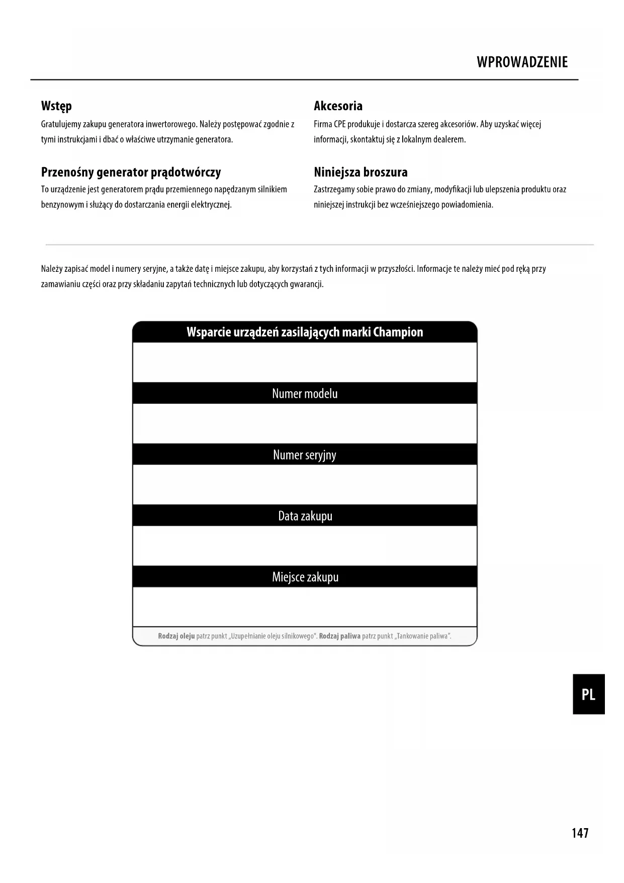 Wsparcie urządzeń zasilających marki Champion Numer modelu Numer seryjny Data zakupu Miejsce zakupu Rodzaj oleju patrz punkt „Uzupełnianie oleju silnikowego”. Rodzaj paliwa patrz punkt „Tankowanie paliwa”.PL