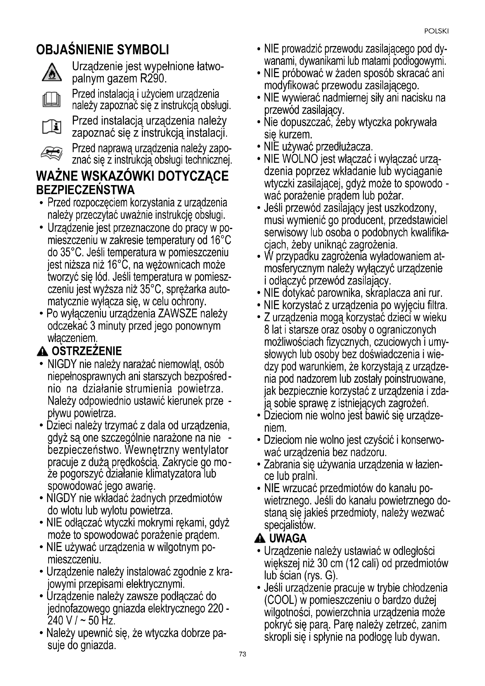 - Jeśli urządzenie pracuje w trybie chłodzenia (COOL) w pomieszczeniu o bardzo dużej wilgotności, powierzchnia urządzenia może pokryć się parą. Parę należy zetrzeć, zanim skropli się i spłynie na podłogę lub dywan.74