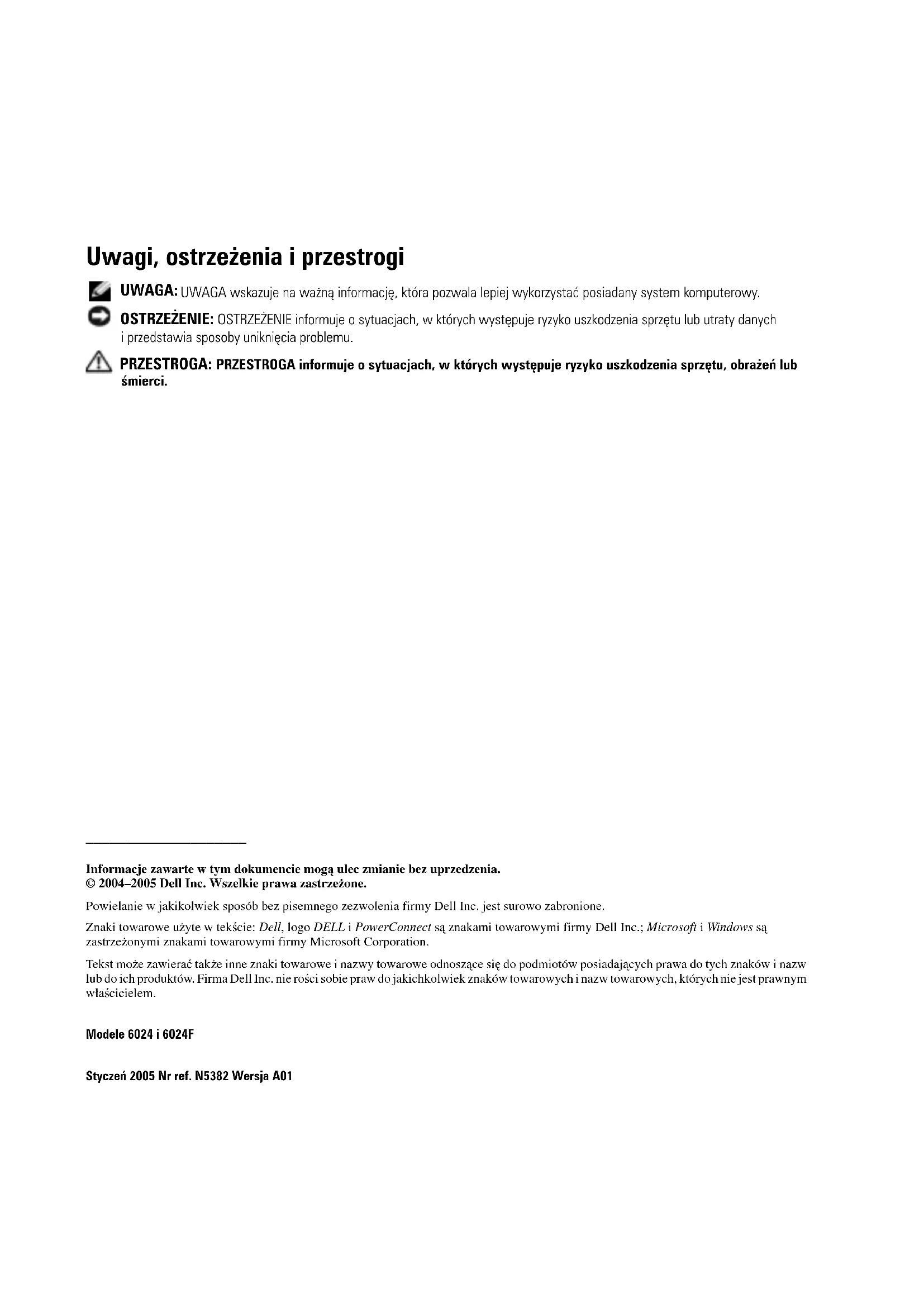 Informacje zawarte w tym dokumencie mogą ulec zmianie bez uprzedzenia. © 2004–2005 Dell Inc. Wszelkie prawa zastrzeżone. Powielanie w jakikolwiek sposób bez pisemnego zezwolenia firmy Dell Inc. jest surowo zabronione. Znaki towarowe użyte w tekście: Dell, logo DELL i PowerConnect są znakami towarowymi firmy Dell Inc.; Microsoft i Windows są zastrzeżonymi znakami towarowymi firmy Microsoft Corporation. Tekst może zawierać także inne znaki towarowe i nazwy towarowe odnoszące się do podmiotów posiadających prawa do tych znaków i nazw lub do ich produktów. Firma Dell Inc. nie rości sobie praw do jakichkolwiek znaków towarowych i nazw towarowych, których nie jest prawnym właścicielem. Modele 6024 i 6024F Styczeń 2005 Nr ref. N5382 Wersja A01Instrukcja uruchomienia