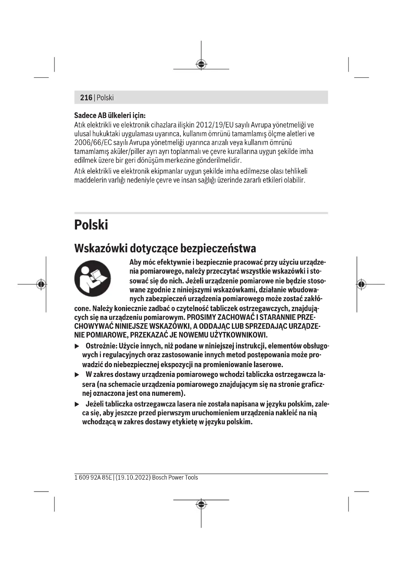 Karasoku Mahallesi 28028. Sokak No:20/A Merkez / ADANA Tel.: +903223599710 -3521379 Fax: +903223591323 E-mail: isiklar@isiklarelektrik.com Diğer servis adreslerini şurada bulabilirsiniz: www.bosch-pt.com/serviceaddresses Tasfiye Ölçme cihazları, aksesuar ve ambalaj malzemesi çevre dostu tasfiye amacıyla bir geri dönüşüm merkezine yollanmalıdır. Ölçme cihazını ve bataryaları evsel çöplerin içine atmayın! Bosch Power Tools 1 609 92A 85E | (19.10.2022)216 | Polski Sadece AB ülkeleri için: Atık elektrikli ve elektronik cihazlara ilişkin 2012/19/EU sayılı Avrupa yönetmeliği ve ulusal hukuktaki uygulaması uyarınca, kullanım ömrünü tamamlamış ölçme aletleri ve 2006/66/EC sayılı Avrupa yönetmeliği uyarınca arızalı veya kullanım ömrünü tamamlamış aküler/piller ayrı ayrı toplanmalı ve çevre kurallarına uygun şekilde imha edilmek üzere bir geri dönüşüm merkezine gönderilmelidir. Atık elektrikli ve elektronik ekipmanlar uygun şekilde imha edilmezse olası tehlikeli maddelerin varlığı nedeniyle çevre ve insan sağlığı üzerinde zararlı etkileri olabilir. Polski Wskazówki dotyczące bezpieczeństwa Aby móc efektywnie i bezpiecznie pracować przy użyciu urządze- nia pomiarowego, należy przeczytać wszystkie wskazówki i sto- sować się do nich. Jeżeli urządzenie pomiarowe nie będzie stoso- wane zgodnie z niniejszymi wskazówkami, działanie wbudowa- nych zabezpieczeń urządzenia pomiarowego może zostać zakłó- cone. Należy koniecznie zadbać o czytelność tabliczek ostrzegawczych, znajdują- cych się na urządzeniu pomiarowym. PROSIMY ZACHOWAĆ I STARANNIE PRZE- CHOWYWAĆ NINIEJSZE WSKAZÓWKI, A ODDAJĄC LUB SPRZEDAJĄC URZĄDZE- NIE POMIAROWE, PRZEKAZAĆ JE NOWEMU UŻYTKOWNIKOWI. u Ostrożnie: Użycie innych, niż podane w niniejszej instrukcji, elementów obsługo- wych iregulacyjnych oraz zastosowanie innych metod postępowania może pro- wadzić do niebezpiecznej ekspozycji na promieniowanie laserowe. u W zakres dostawy urządzenia pomiarowego wchodzi tabliczka ostrzegawcza la- sera (na schemacie urządzenia pomiarowego znajdującym się na stronie graficz- nej oznaczona jest ona numerem). u Jeżeli tabliczka ostrzegawcza lasera nie została napisana w języku polskim, zale- ca się, aby jeszcze przed pierwszym uruchomieniem urządzenia nakleić na nią wchodzącą w zakres dostawy etykietę w języku polskim. 1 609 92A 85E | (19.10.2022) Bosch Power ToolsPolski | 217 Nie wolno kierować wiązki laserowej wstronę osób i zwierząt, nie wolno również samemu wpatrywać się w wiązkę ani w jej odbicie. Można w ten sposób spowodować czyjeś oślepienie, wypadki lub uszkodzenie wzroku. u W przypadku gdy wiązka lasera zostanie skierowane na oko, należy zamknąć oczy i odsunąć głowę tak, aby znalazła się poza zasięgiem padania wiązki. u Nie wolno dokonywać żadnych zmian ani modyfikacji urządzenia laserowego. u Nie należy używać okularów do pracy z laserem (osprzęt) jako okularów ochron- nych. Okulary do pracy z laserem służą do łatwiejszej identyfikacji wiązki lasera, nie chronią jednak przed promieniowaniem laserowym. u Nie należy używać okularów do pracy z laserem (osprzęt) jako okularów przeciw- słonecznych ani podczas prowadzenia samochodu. Okulary do pracy z laserem nie zapewniają całkowitej ochrony przed promieniowaniem UV i utrudniają rozróżnianie kolorów. u Naprawę urządzenia pomiarowego należy zlecać wyłącznie wykwalifikowanym fachowcom i wykonać ją tylko przy użyciu oryginalnych części zamiennych. Tylko w ten sposób zagwarantowane zostanie zachowanie bezpieczeństwa urządzenia. u Nie wolno udostępniać laserowego urządzenia pomiarowego do użytkowania dzieciom pozostawionym bez nadzoru. Mogą one nieumyślnie oślepić inne osoby lub same siebie. u Nie należy stosować tego urządzenia pomiarowego w otoczeniu zagrożonym wy- buchem, wktórym znajdują się łatwopalne ciecze, gazy lub pyły. W urządzeniu po- miarowym może dojść do utworzenia iskier, które mogą spowodować zapłon pyłów lub oparów. u Ze względu na aktualny stan rozwoju technologii zagwarantowanie stuprocento- wego bezpieczeństwa urządzenia pomiarowego nie jest możliwe. Wpływy ze- wnętrzne (np. pył lub para w strefie pomiaru), wahania temperatury (np. wskutek działania termowentylatora), jak również struktura i stan powierzchni pomiarowych (np. silnie odbijające lub transparentne materiały) mogą zafałszować wyniki pomiaru. Opis urządzenia i jego zastosowania Proszę zwrócić uwagę na rysunki zamieszczone na początku instrukcji obsługi. Użycie zgodne z przeznaczeniem Urządzenie pomiarowe jest przeznaczone do bezdotykowych pomiarów temperatury po- wierzchni, temperatury otoczenia oraz wilgotności względnej. Oblicza ono temperaturę Bosch Power Tools 1 609 92A 85E | (19.10.2022)218 | Polski punktu rosy i wykrywa mostki termiczne oraz miejsca zagrożone pleśnią. Urządzenie po- miarowe nie służy do wykrywania zarodników pleśni. Urządzenia pomiarowego nie wolno stosować do pomiarów temperatury u osób i zwie- rząt ani do innych celów medycznych. Urządzenie nie jest dostosowane do pomiaru temperatury powierzchni gazów ani cieczy. Urządzenie pomiarowe nie jest przeznaczone do zastosowań komercyjnych. Urządzenie pomiarowe dostosowane jest do prac wewnątrz pomieszczeń. Produkt jest urządzeniem laserowym dla konsumentów zgodnie z normą EN50689. Przedstawione graficznie komponenty Numeracja przedstawionych komponentów odnosi się do schematu urządzenia pomiaro- wego, znajdującego się na stronie graficznej. (1) Przycisk pomiarowy (2) Otwór wyjściowy wiązki lasera (3) Soczewka odbiorcza promieniowania podczerwonego (4) Czujnik wilgotności powietrza i temperatury (5) Naklejka Emisyjność (6) Tabliczka ostrzegawcza lasera (7) Numer seryjny (8) Mocowanie uchwytu do zawieszenia (9) Pokrywka wnęki na baterie (10) Blokada pokrywki wn