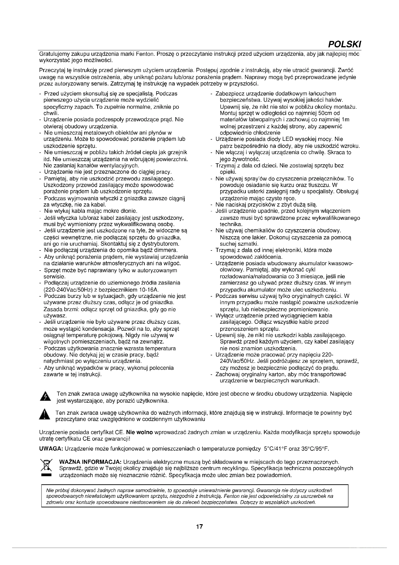 AUX IN Vous pouvez écouter la musique stockée dans un autre appareil audio ou un téléphone intelligent via la radio, grâce à la connexion à la prise d'entrée auxiliaire de 3,5 mm sur la face avant. Utilisez un câble avec des broches de 3,5 mm aux deux extrémités, l'une connectée à la prise d'entrée auxiliaire de la radio, l'autre connectée à la prise d'écouteurs de l'appareil audio (ou à la prise de sortie de ligne si disponible). Réglez le commutateur de mode sur le mode AUX. Lisez de la musique sur l'appareil connecté, le son sera émis par la radio.17 POLSKI Gratulujemy zakupu urządzenia marki Fenton. Proszę o przeczytanie instrukcji przed użyciem urządzenia, aby jak najlepiej móc wykorzystać jego możliwości. Przeczytaj tę instrukcję przed pierwszym użyciem urządzenia. Postępuj zgodnie z instrukcją, aby nie utracić gwarancji. Zwróć uwagę na wszystkie ostrzeżenia, aby uniknąć pożaru lub/oraz porażenia prądem. Naprawy mogą być przeprowadzane jedynie przez autoryzowany serwis. Zatrzymaj tę instrukcję na wypadek potrzeby w przyszłości. - Przed użyciem skonsultuj się ze specjalistą. Podczas pierwszego użycia urządzenie może wydzielić specyficzny zapach. To zupełnie normalne, zniknie po chwili. - Urządzenie posiada podzespoły przewodzące prąd. Nie otwieraj obudowy urządzenia. - Nie umieszczaj metalowych obiektów ani płynów w urządzeniu. Może to spowodować porażenie prądem lub uszkodzenie sprzętu. - Nie umieszczaj w pobliżu takich źródeł ciepła jak grzejnik itd. Nie umieszczaj urządzenia na wibrującej powierzchni. Nie zasłaniaj kanałów wentylacyjnych. - Urządzenie nie jest przeznaczone do ciągłej pracy. - Pamiętaj, aby nie uszkodzić przewodu zasilającego. Uszkodzony przewód zasilający może spowodować porażenie prądem lub uszkodzenie sprzętu. - Podczas wyjmowania wtyczki z gniazdka zawsze ciągnij za wtyczkę, nie za kabel. - Nie wtykaj kabla mając mokre dłonie. - Jeśli wtyczka lub/oraz kabel zasilający jest uszkodzony, musi być wymieniony przez wykwalifikowaną osobę. - Jeśli urządzenie jest uszkodzone na tyle, że widoczne są części wewnętrzne, nie podłączaj sprzętu do gniazdka, ani go nie uruchamiaj. Skontaktuj się z dystrybutorem. - Nie podłączaj urządzenia do opornika bądź dimmera. - Aby uniknąć porażenia prądem, nie wystawiaj urządzenia na działanie warunków atmosferycznych ani na wilgoć. - Sprzęt może być naprawiany tylko w autoryzowanym serwisie. - Podłączaj urządzenie do uziemionego źródła zasilania (220-240Vac/50Hz) z bezpiecznikiem 10-16A. - Podczas burzy lub w sytuacjach, gdy urządzenie nie jest używane przez dłuższy czas, odłącz je od gniazdka. Zasada brzmi: odłącz sprzęt od gniazdka, gdy go nie używasz. - Jeśli urządzenie nie było używane przez dłuższy czas, może wystąpić kondensacja. Pozwól na to, aby sprzęt osiągnął temperaturę pokojową. Nigdy nie używaj w wilgotnych pomieszczeniach, bądź na zewnątrz. - Podczas użytkowania znacznie wzrasta temperatura obudowy. Nie dotykaj jej w czasie pracy, bądź natychmiast po wyłączeniu urządzenia. - Aby uniknąć wypadków w pracy, wykonuj polecenia zawarte w tej instrukcji. - Zabezpiecz urządzenie dodatkowym łańcuchem bezpieczeństwa. Używaj wysokiej jakości haków. Upewnij się, że nikt nie stoi w pobliżu okolicy montażu. Montuj sprzęt w odległości co najmniej 50cm od materiałów łatwopalnych i zachowuj co najmniej 1m wolnej przestrzeni z każdej strony, aby zapewnić odpowiednie chłodzenie - Urządzenie posiada diody LED wysokiej mocy. Nie patrz bezpośrednio na diody, aby nie uszkodzić wzroku. - Nie włączaj i wyłączaj urządzenia co chwilę. Skraca to jego żywotność. - Trzymaj z dala od dzieci. Nie zostawiaj sprzętu bez opieki. - Nie używaj spray’ów do czyszczenia przełączników. To powoduje osiadanie się kurzu oraz tłuszczu. W przypadku usterki zasięgnij rady u specjalisty. Obsługuj urządzenie mając czyste ręce. - Nie naciskaj przycisków z zbyt dużą siłą. - Jeśli urządzenie upadnie, przed kolejnym włączeniem zawsze musi być sprawdzone przez wykwalifikowanego technika. - Nie używaj chemikaliów do czyszczenia obudowy. Niszczą one lakier. Dokonuj czyszczenia za pomocą suchej szmatki. - Trzymaj z dala od innej elektroniki, która może spowodować zakłócenia. - Urządzenie posiada wbudowany akumulator kwasowo- ołowiowy. Pamiętaj, aby wykonać cykl rozładowania/naładowania co 3 miesiące, jeśli nie zamierzasz go używać przez dłuższy czas. W innym przypadku akumulator może ulec uszkodzeniu. - Podczas serwisu używaj tylko oryginalnych części. W innym przypadku może nastąpić poważne uszkodzenie sprzętu, lub niebezpieczne promieniowanie. - Wyłącz urządzenie przed wyciągnięciem kabla zasilającego. Odłącz wszystkie kable przed przenoszeniem sprzętu. - Upewnij się, że nikt nie uszkodzi kabla zasilającego. Sprawdź przed każdym użyciem, czy kabel zasilający nie nosi znamion uszkodzenia. - Urządzenie może pracować przy napięciu 220- 240Vac/50Hz. Jeśli podróżujesz ze sprzętem, sprawdź, czy możesz je bezpiecznie podłączyć do prądu. - Zachowaj oryginalny karton, aby móc transportować urządzenie w bezpiecznych warunkach. Ten znak zwraca uwagę użytkownika na wysokie napięcie, które jest obecne w środku obudowy urządzenia. Napięcie jest wystarczające, aby porazić użytkownika. Ten znak zwraca uwagę użytkownika do ważnych informacji, które znajdują się w instrukcji. Informacje te powinny być przeczytane oraz uwzględnione w codziennym użytkowaniu Urządzenie posiada certyfikat CE. Nie wolno wprowadzać żadnych zmian w urządzeniu. Każda modyfikacja sprzętu spowoduje utratę certyfikatu CE oraz gwarancji! UWAGA: Urządzenie może funkcjonować w pomieszczeniach o temperaturze pomiędzy 5°C/41°F oraz 35°C/95°F. WAŻNA INFORMACJA: Urządzenia elektryczne muszą być sk