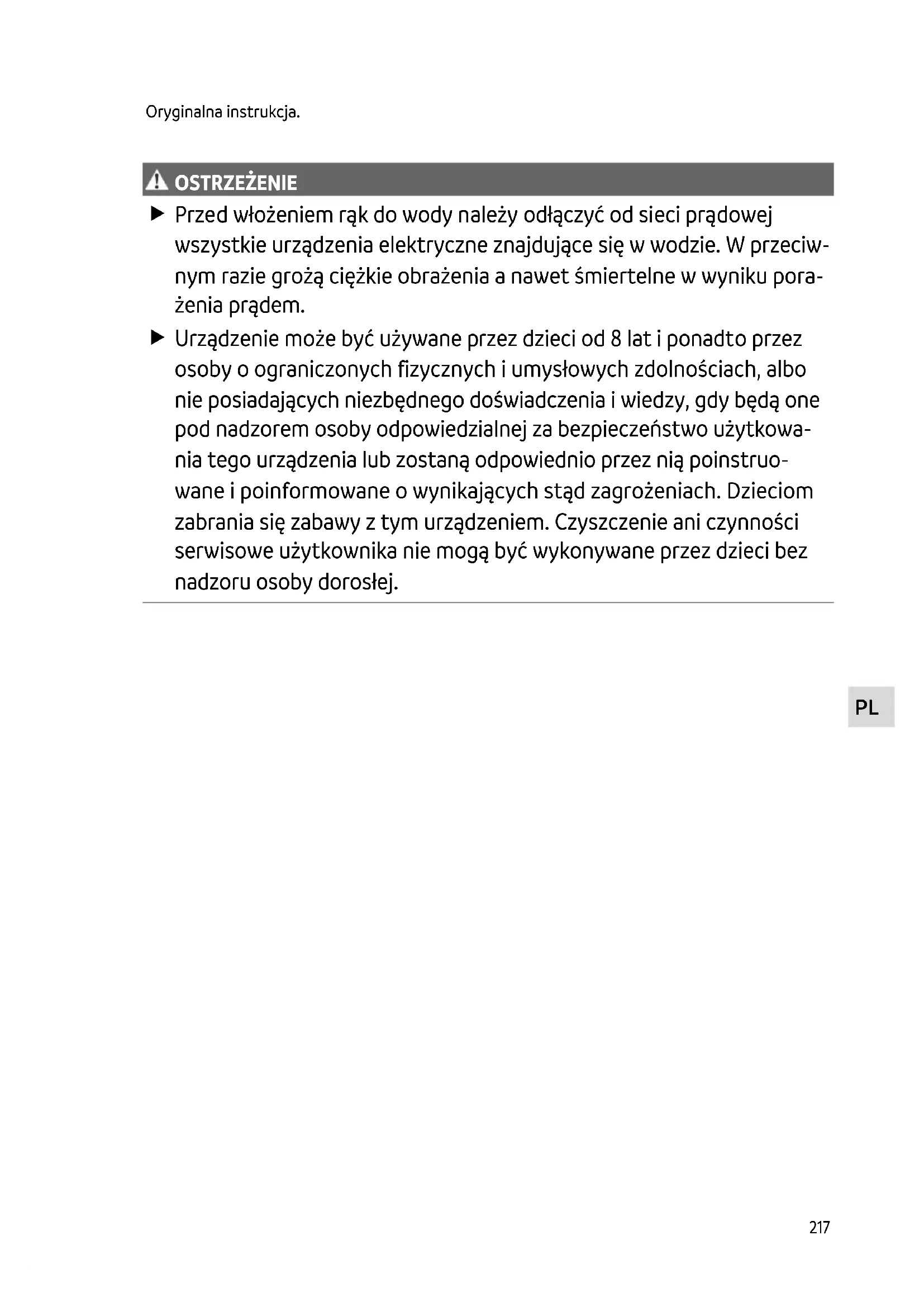 OSTRZEŻENIE Przed włożeniem rąk do wody należy odłączyć od sieci prądowej wszystkie urządzenia elektryczne znajdujące się w wodzie. W przeciw- nym razie grożą ciężkie obrażenia a nawet śmiertelne w wyniku pora- żenia prądem. Urządzenie może być używane przez dzieci od 8 lat i ponadto przez osoby o ograniczonych fizycznych i umysłowych zdolnościach, albo nie posiadających niezbędnego doświadczenia i wiedzy, gdy będą one pod nadzorem osoby odpowiedzialnej za bezpieczeństwo użytkowa- nia tego urządzenia lub zostaną odpowiednio przez nią poinstruo- wane i poinformowane o wynikających stąd zagrożeniach. Dzieciom zabrania się zabawy z tym urządzeniem. Czyszczenie ani czynności serwisowe użytkownika nie mogą być wykonywane przez dzieci bez nadzoru osoby dorosłej.218 Przepisy bezpieczeństwa Przyłącza elektryczne